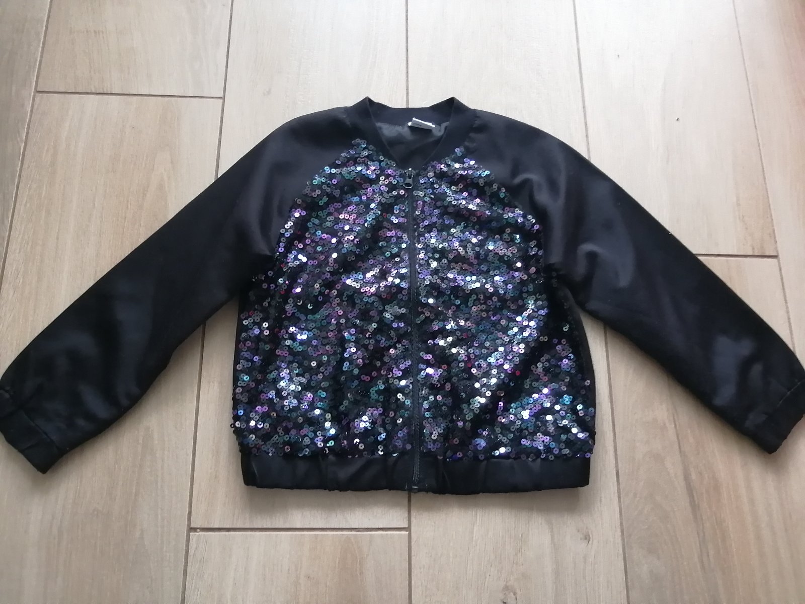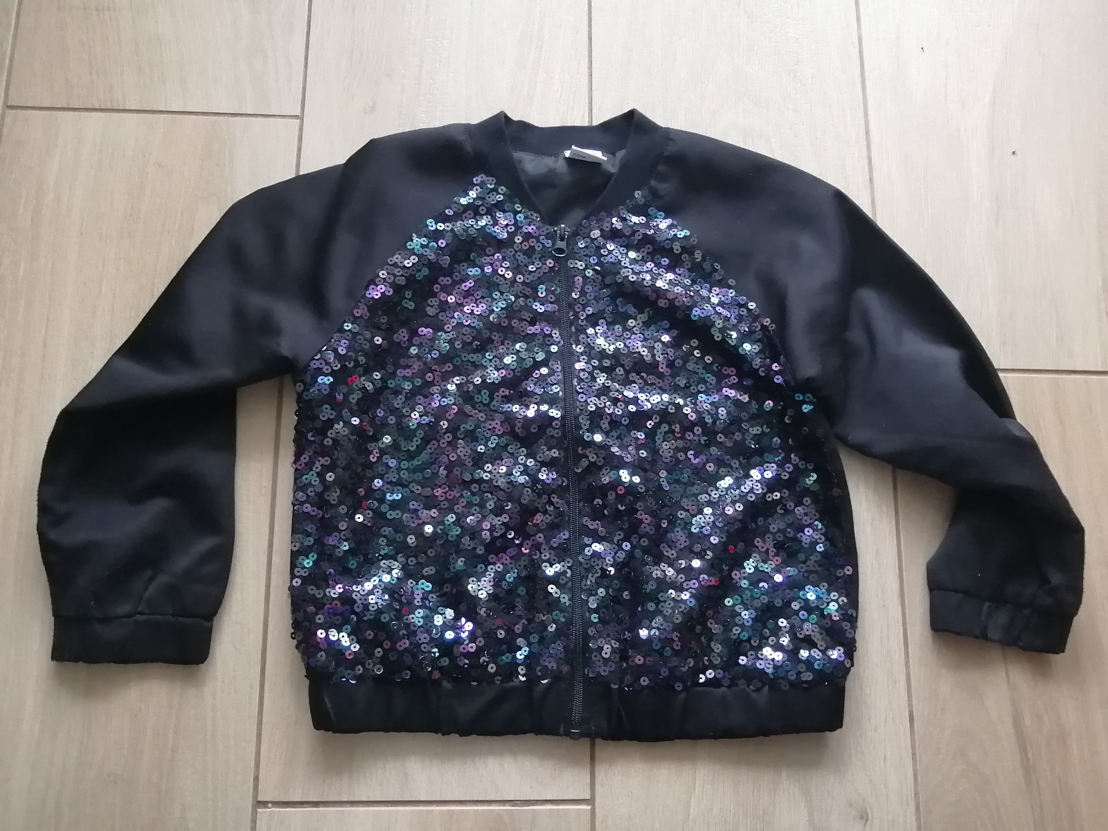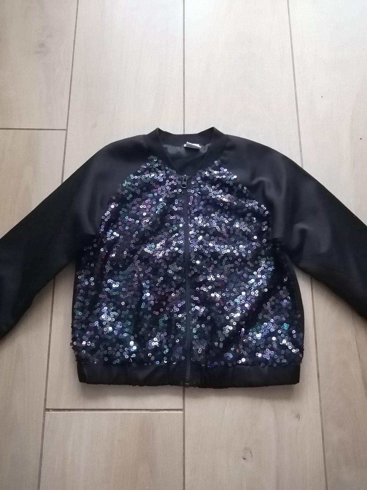 Nosená, bez vážnych poškodení, taký imidžový kúsok s trblietkami. Čierna látka je jemne lesklá, ale len jemne. So zipsom