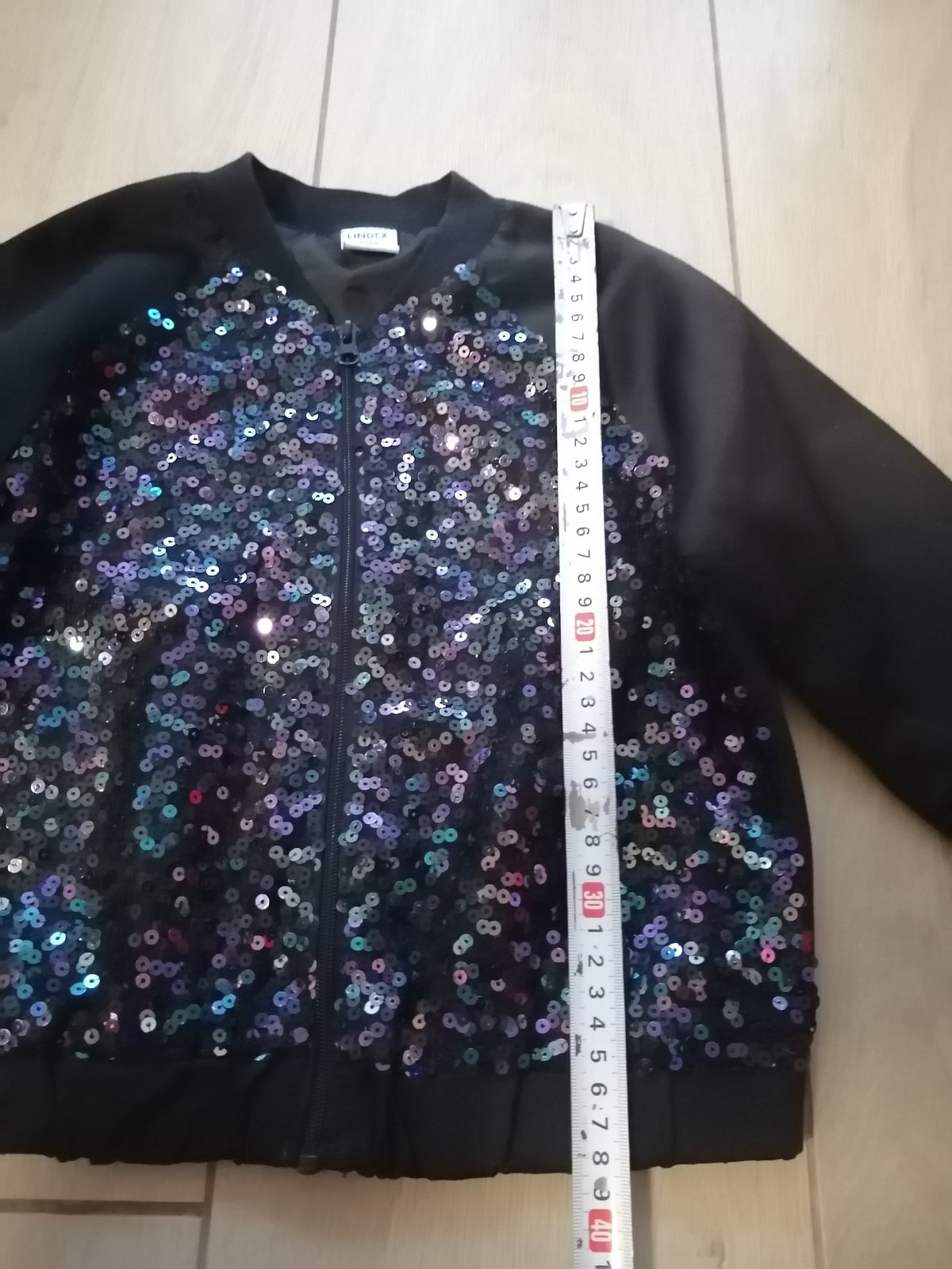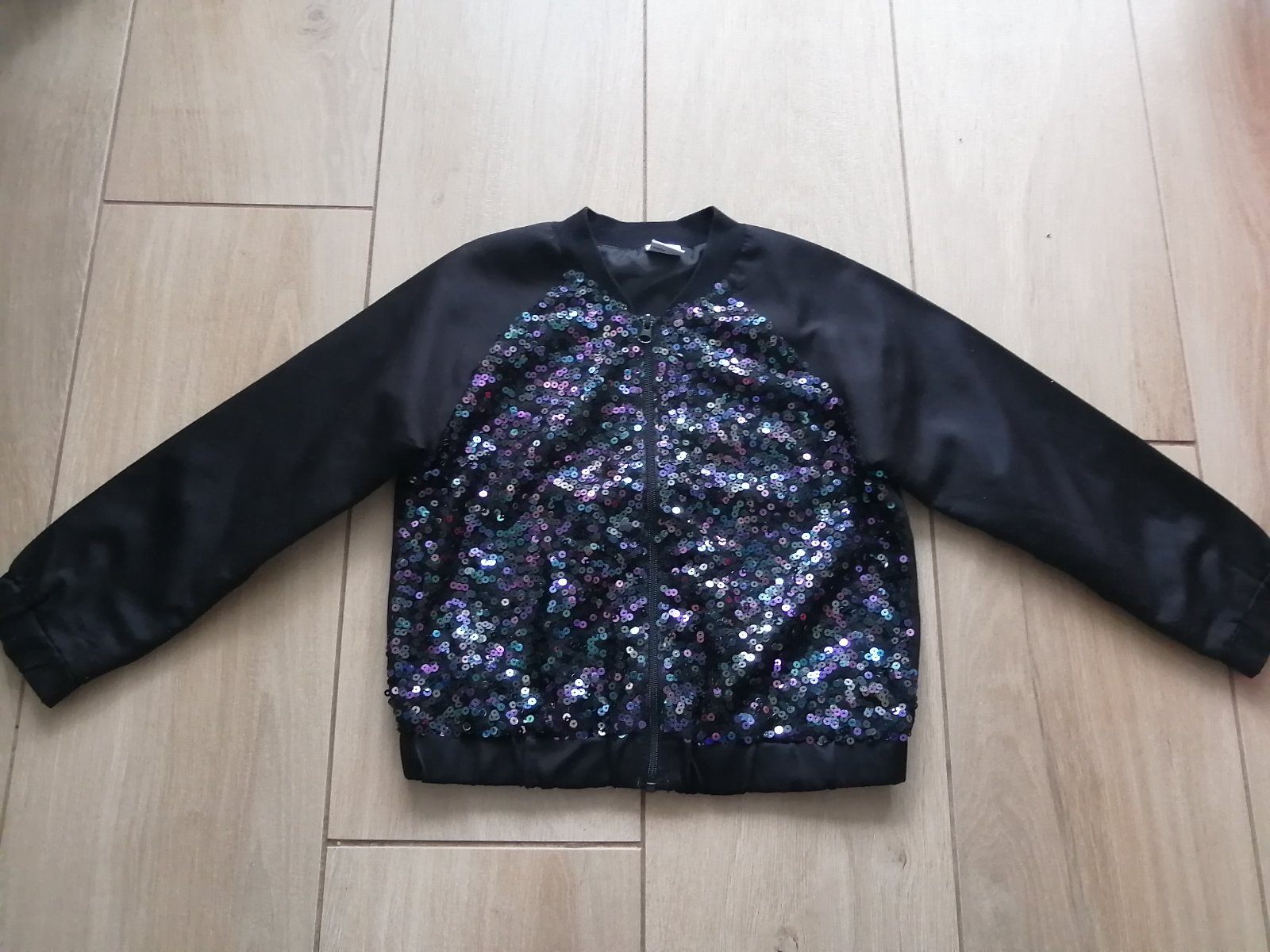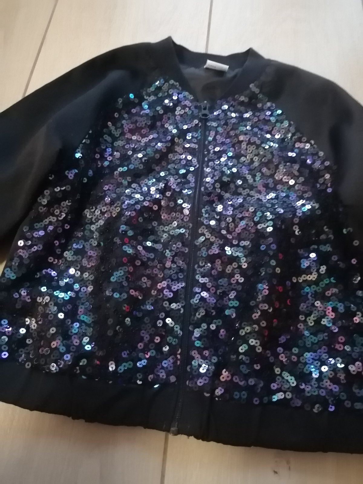 Nosená, bez vážnych poškodení, taký imidžový kúsok s trblietkami. Čierna látka je jemne lesklá, ale len jemne. So zipsom