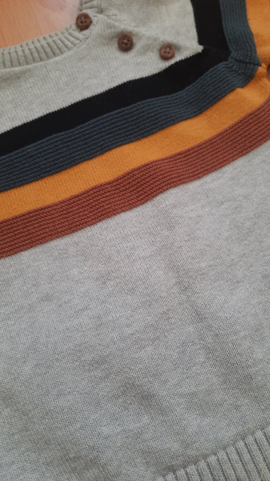 Predám sivý svetrík pre chlapca s gombíkmi a kapucňou. Rozmery: dĺžka rukáva od krku: 39 cm, od podpazušia: 25 cm, dĺžka svetríka od krku: 31 cm, šírka: 31 cm