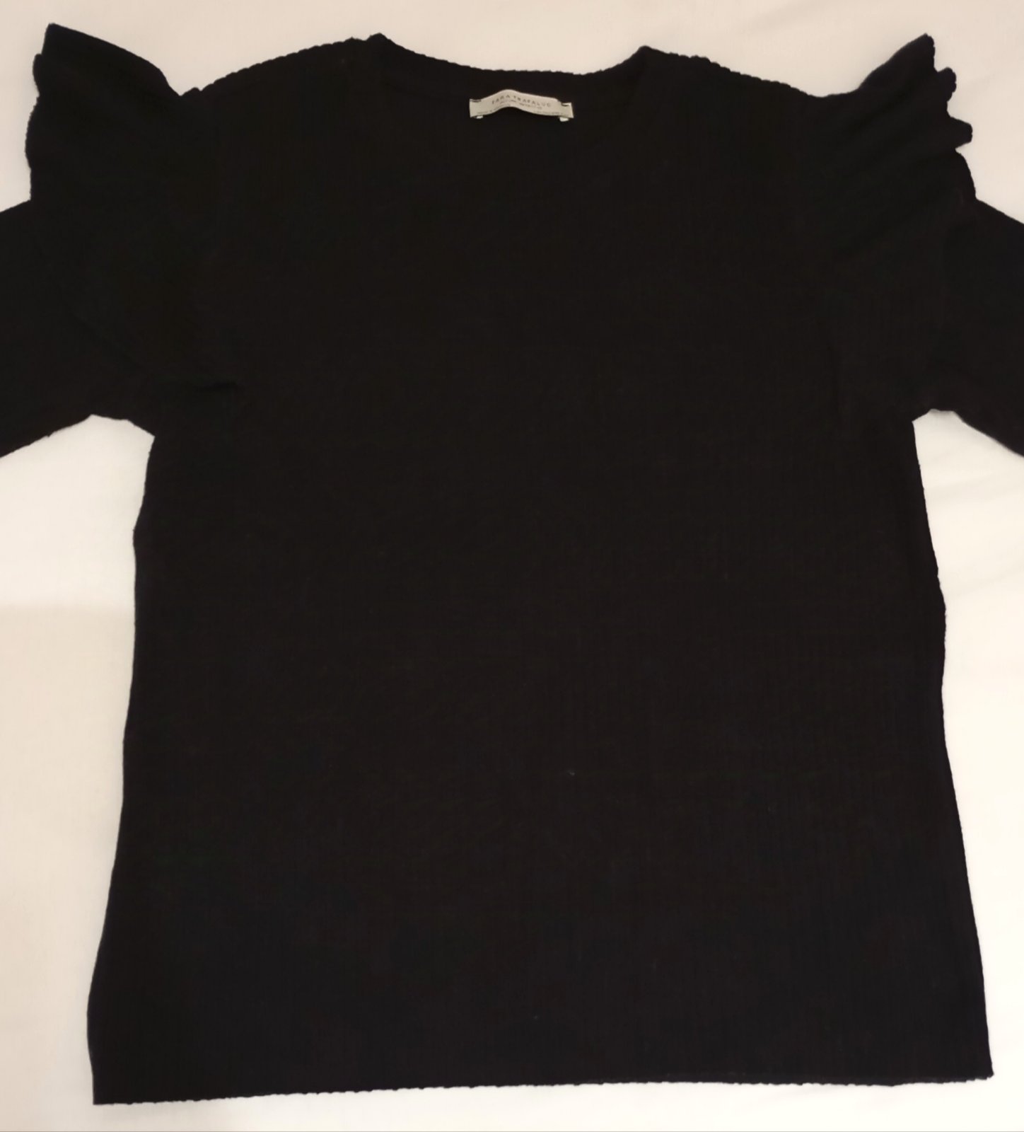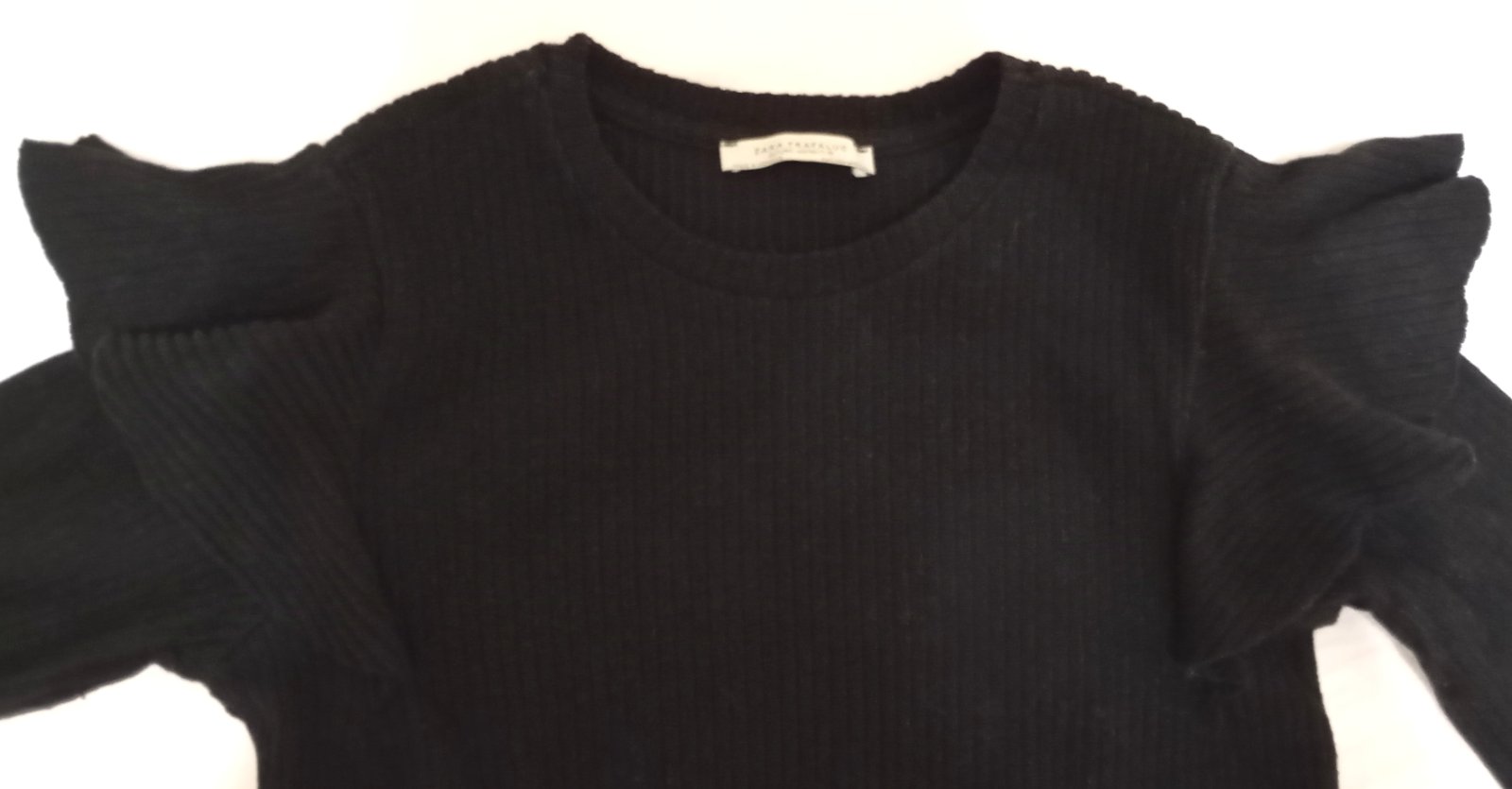 Elegantný čierny sveter s dvomi veľkými pozdĺžnymi volánmi, čo vytvára zaujímavý a impozantný efekt. Farba je výrazná čierna, nie vyblednutá (fotografie skresľujú sfarbenie).