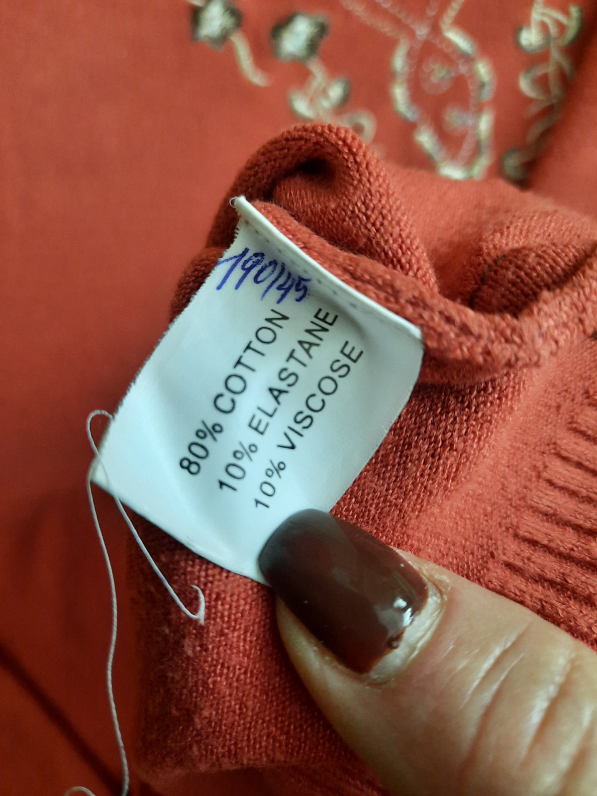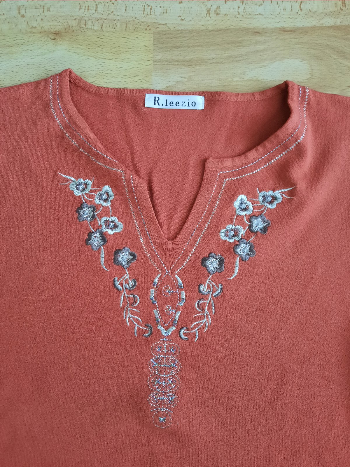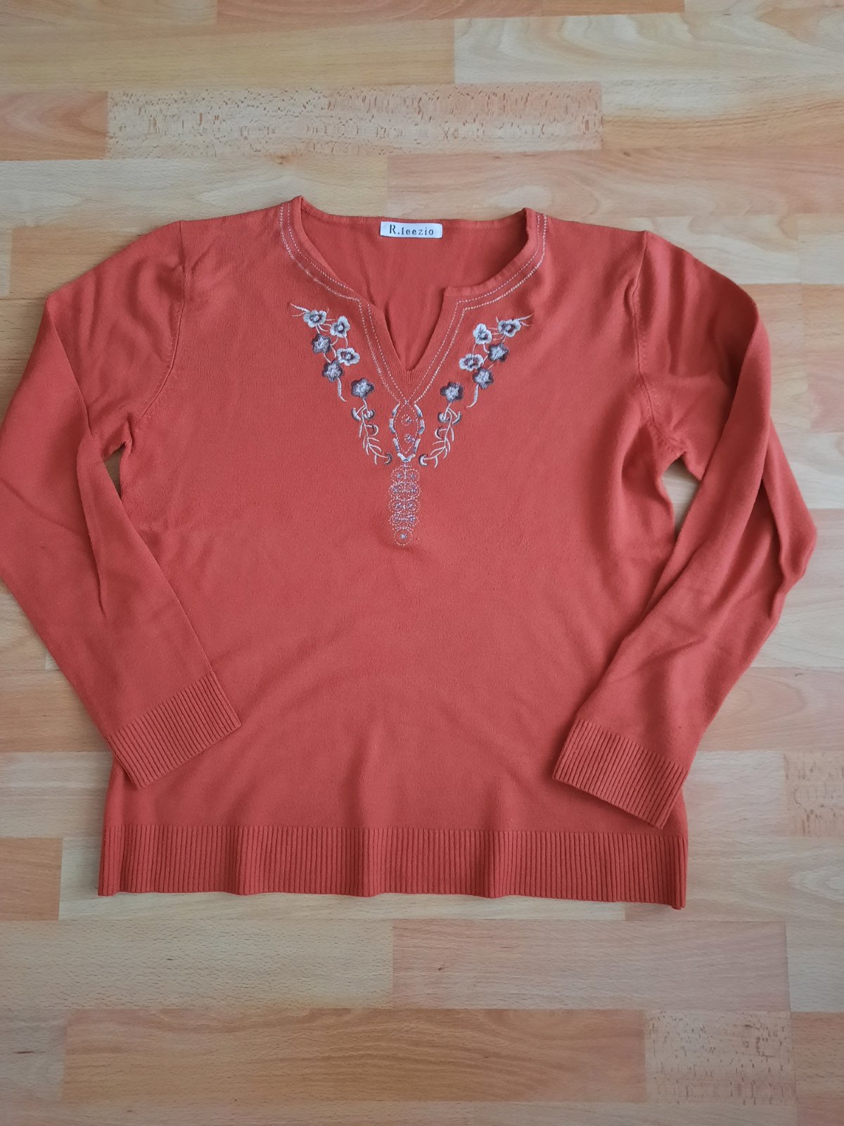 Veľmi pekný pulóver tehlovej farby s malým výstrihom a jemnou výšivkou okolo výstrihu. Príjemný materiál, pár krát oblečený.