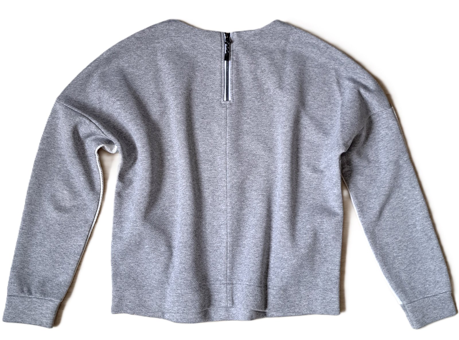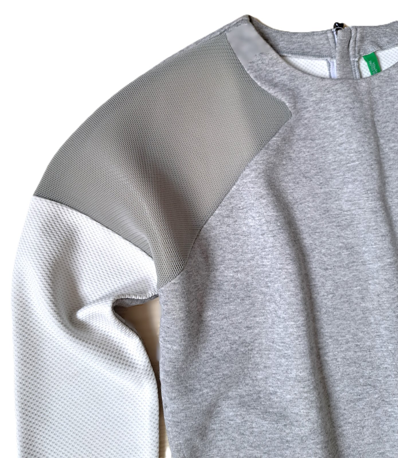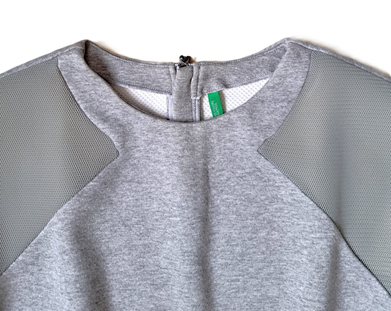 Dámska mikina zn. Benetton - bola nosená, no je v super stave, bez poškodení. Zodpovedá veľ. S/M. Má kratší strih, rukáv má netopiery strih. Sivá časť na rukáve je akoby sieťovina a jemne priesvitná. Mikinka je hrubšia, podšitá bielou látkou ako je na rukáve. Po bokoch sú vačky.