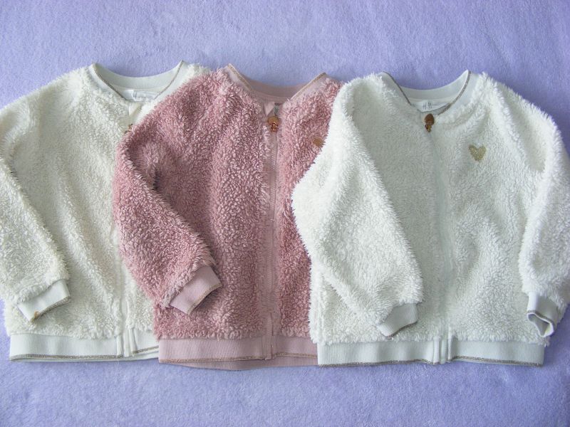 V bazáriku mám 2 biele mikiny (jedna s fliačkom na rukáve) a jednu ružovú (dve posledné foto) - všetky 3 veľkosť 98/104