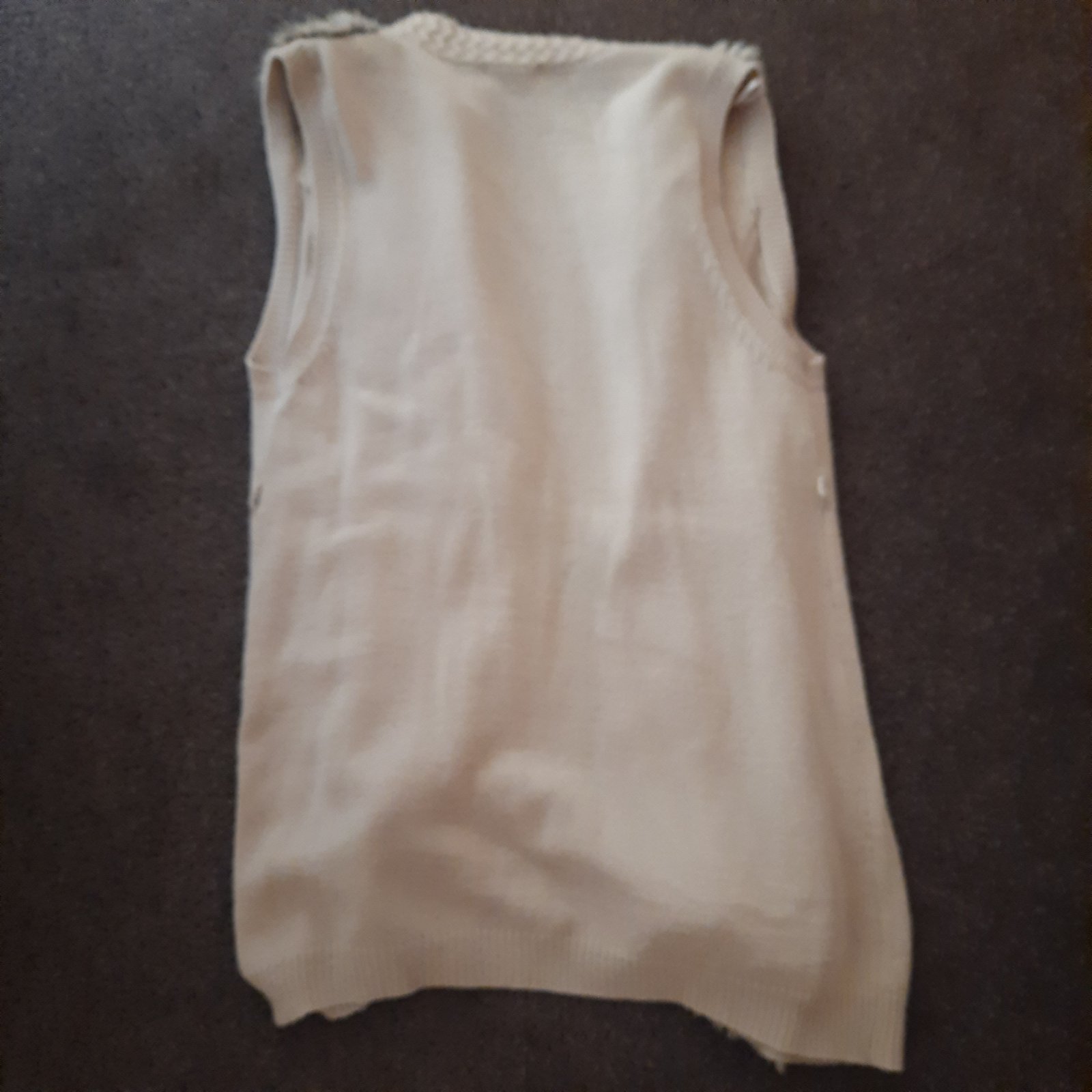 Klasická vesta, pletený vzhľad, smotanový odtieň. Materiál 60% bavlna, 40% akryl, zapínanie na zlaté gombíky. Dĺžka 66 cm, šírka hrudník 2 x 60 cm. Bez visačiek, len odskúšaná. Top stav.