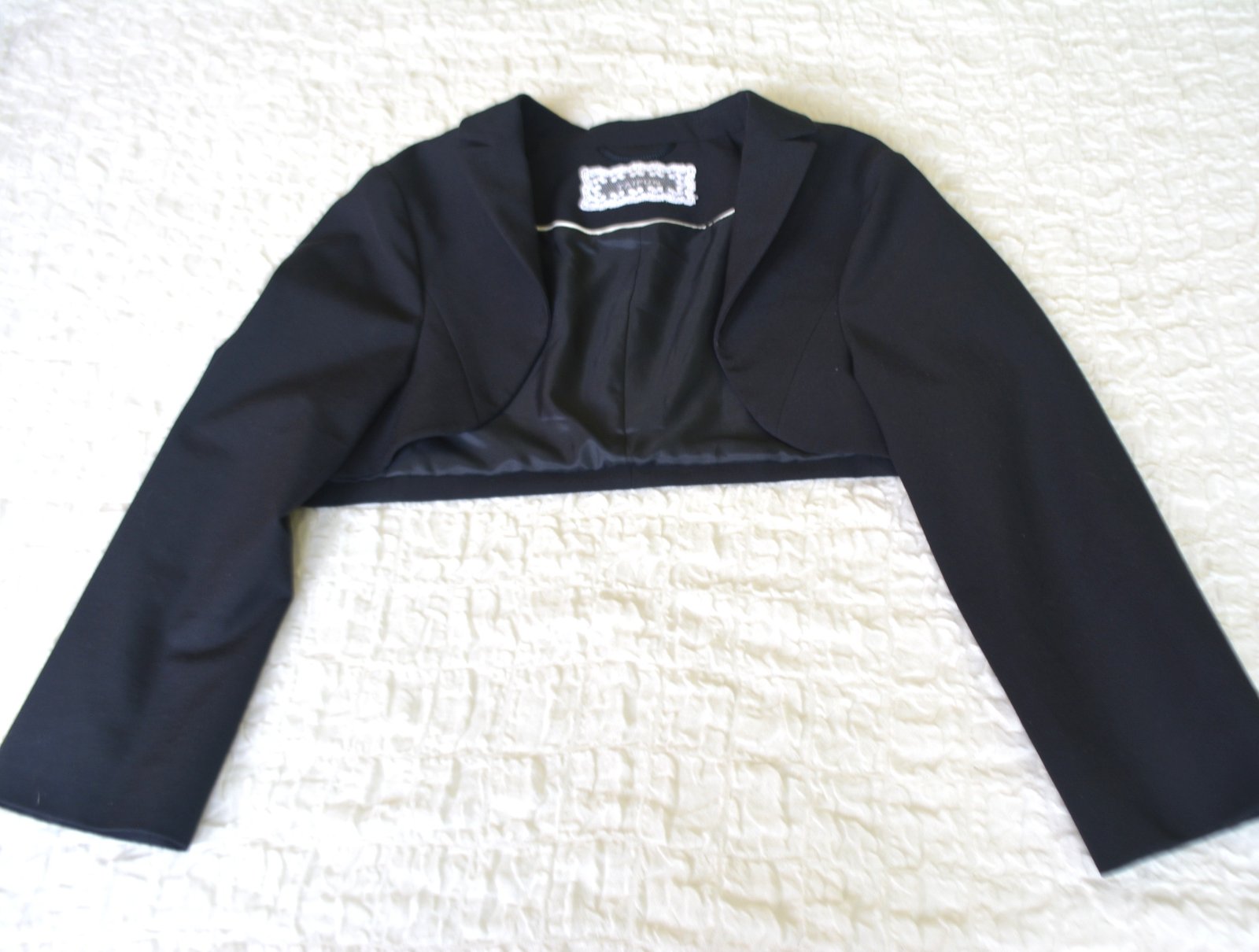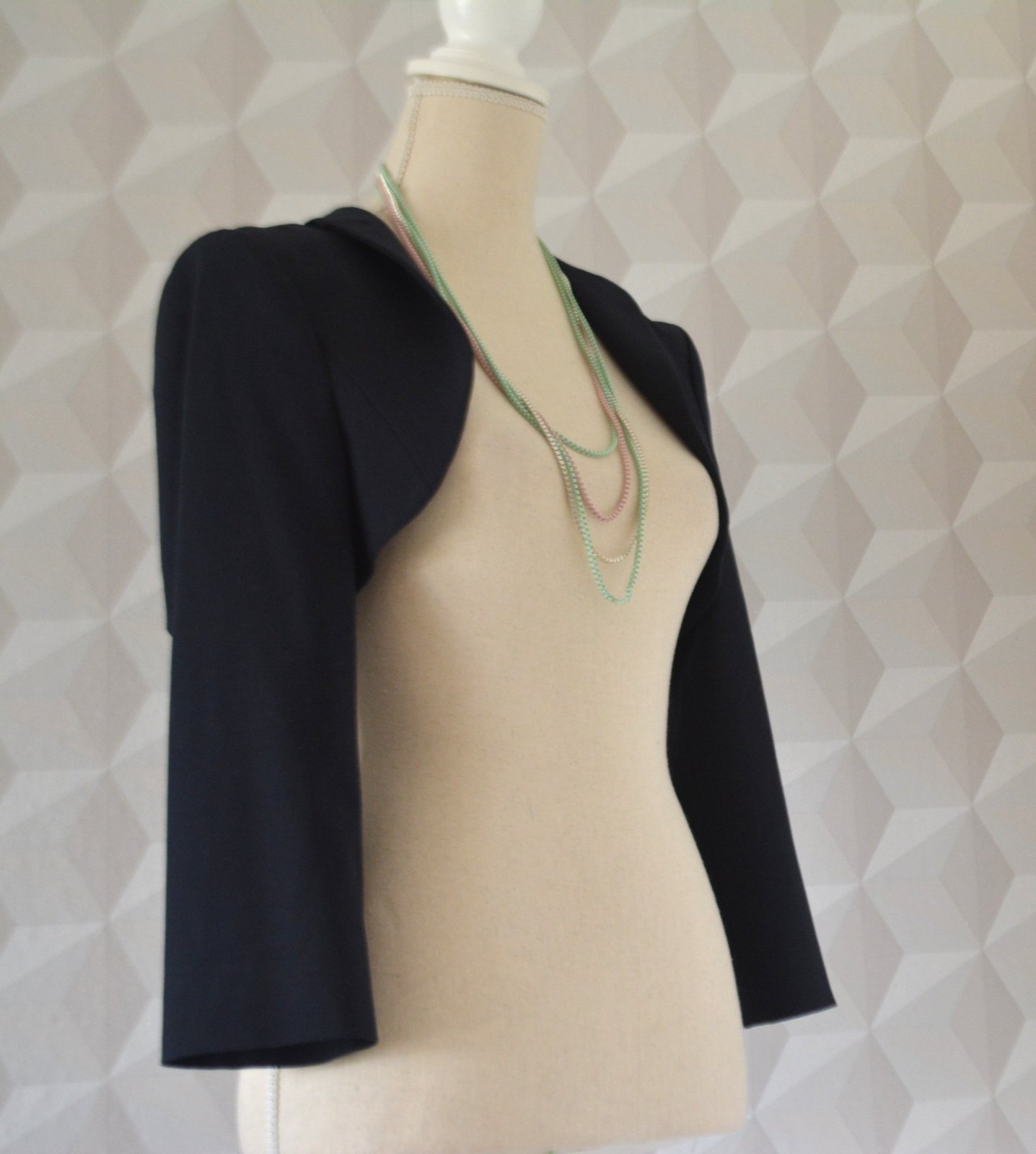 Veľkosť S, rozmery: dĺžka 30cm, pod pazuchami 2x47cm, rukáv je 3/4 dĺžky - od pleca 48 a od pazuchy 32cm. Je podšité.