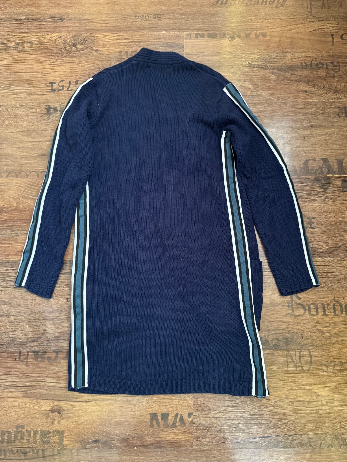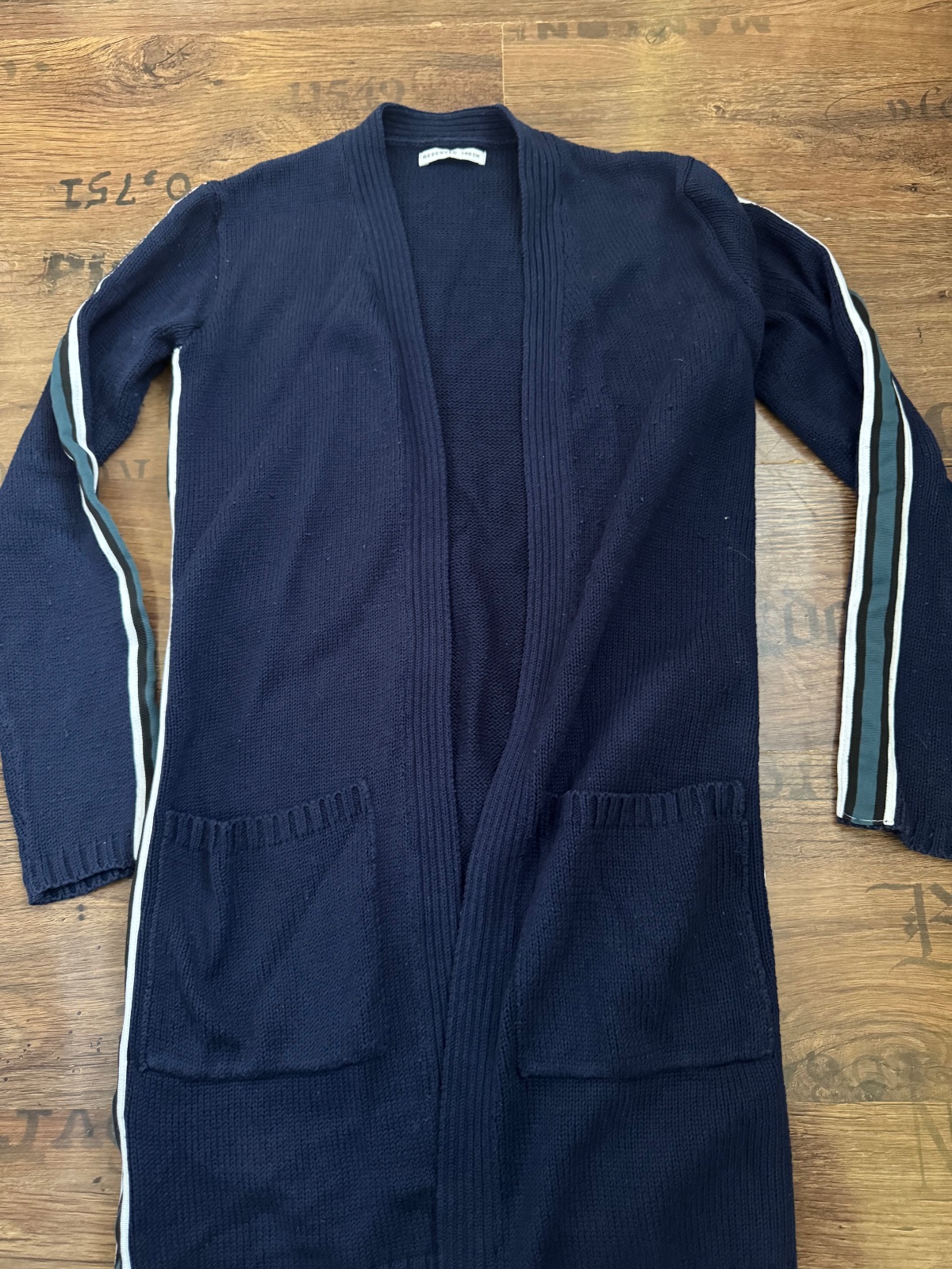 Ponúkam pekný dlhší tmavomodrý kardigán s ozdobnými pásmi po bokoch. Veľkosť je 146 ale prikladám aj rozmery. Značka Reserved. Mali sme také dva v rôznych veľkostiach a mali sme ho rady, super sa hodil k veľa veciam. Bol nosený na striedačku, naďalej vo veľmi peknom stave.