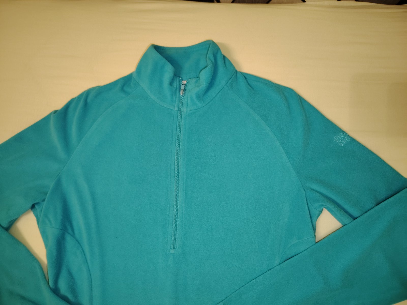 Predlzena mikina, možno aj šaty. Pekný, málo nosený stav. Minizmolky, nič strašné, na teplakovine sa to stáva. Farba niečo také, ako tmavý tyrkys, ako na foto.
