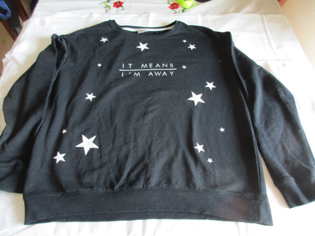 pekna mikina,velmi nepodarené fotky,krásny čierný,miery su:dl.rukáva od krku71cm,dl.rukáva od podp.43cm,širka cez prsia2*58cm,celkov.dl.60cm,prosim riadit timto,lebo dcérka moja odstránila štitok je uvedená velkost.