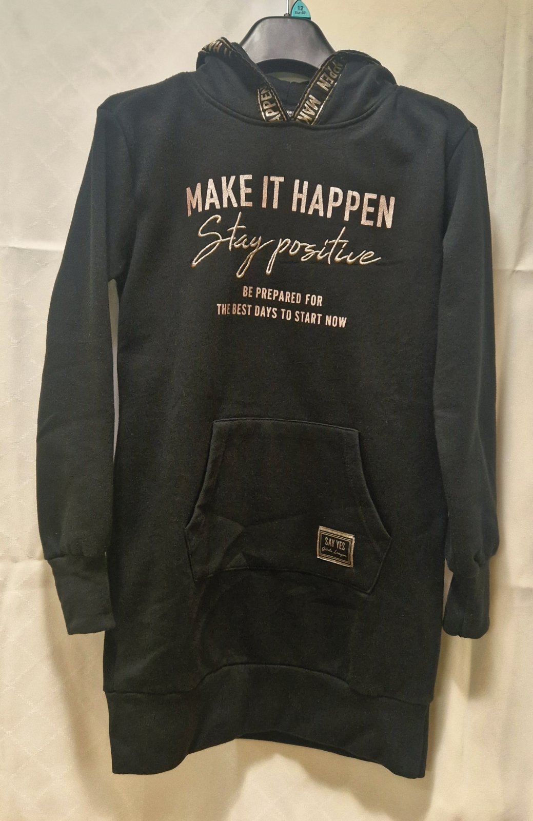 Čierna predĺžená mikina alebo mikinové šaty s kapucňou doplnené zlatou aplikáciou. Veľkosť 146/152 značka Paage one Young.