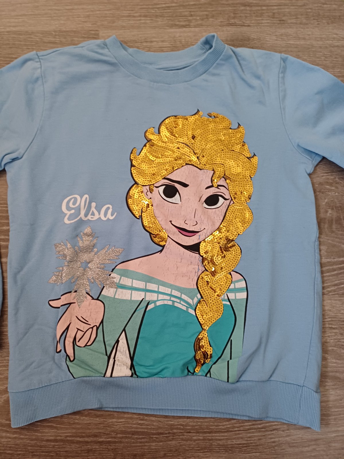 Uvedená veľkosť 140, podla mňa nositelná od 134 preto som zasala sem. Dĺžka 49 cm, rukáv od krku 53 cm, šírka 41 cm. Obrázok popukaný (pozri foto), nájde sa aj malinký jemný fliačik, no určite nejakú malú slečnu ešte poteši.