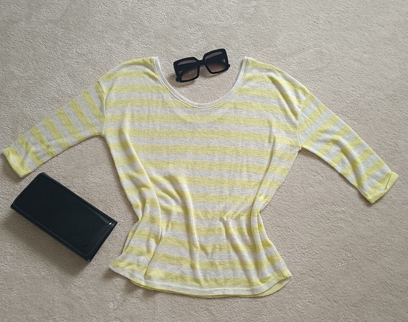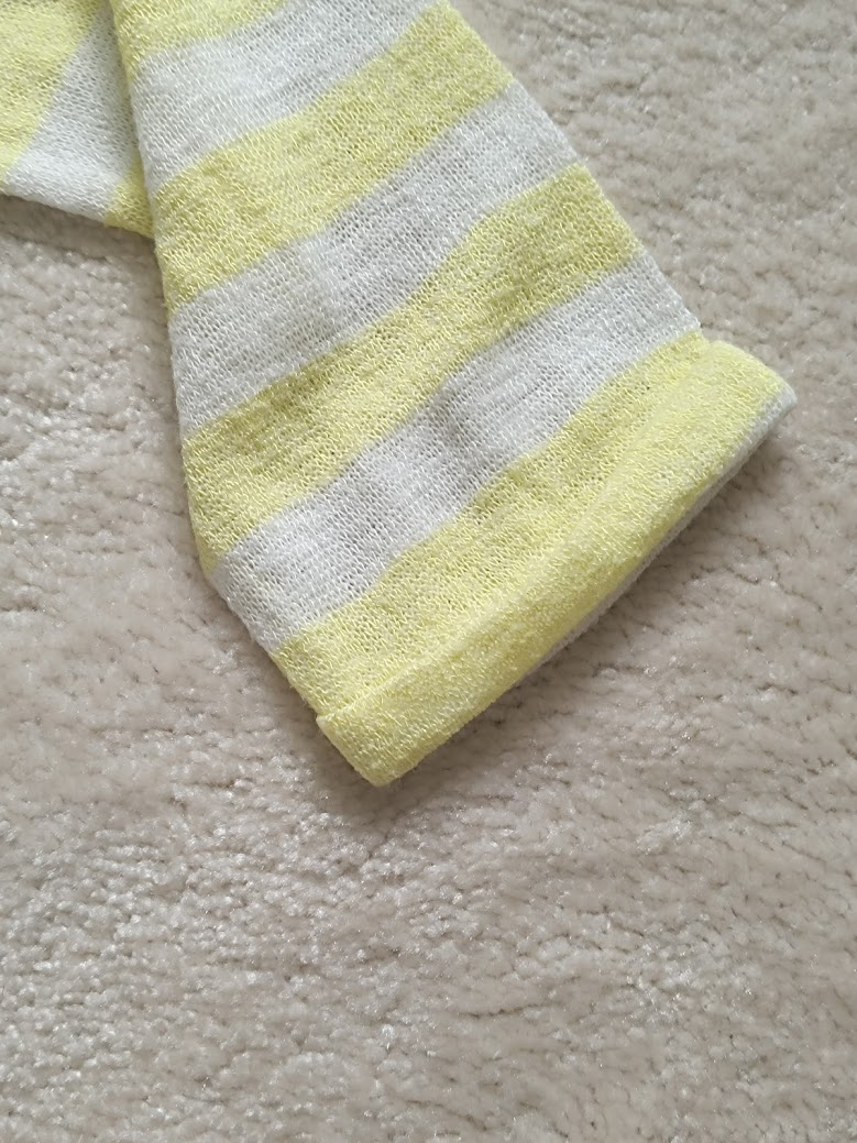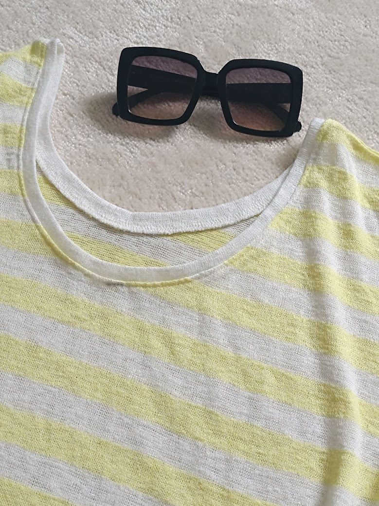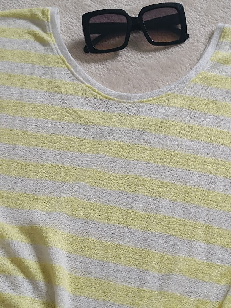 Pulovrik na teplejsie dni, biely s jamnym zltym pruzkom. ovalny hlbsi vystrih v predu aj vzadu. 2/3 rukavik. super stav.