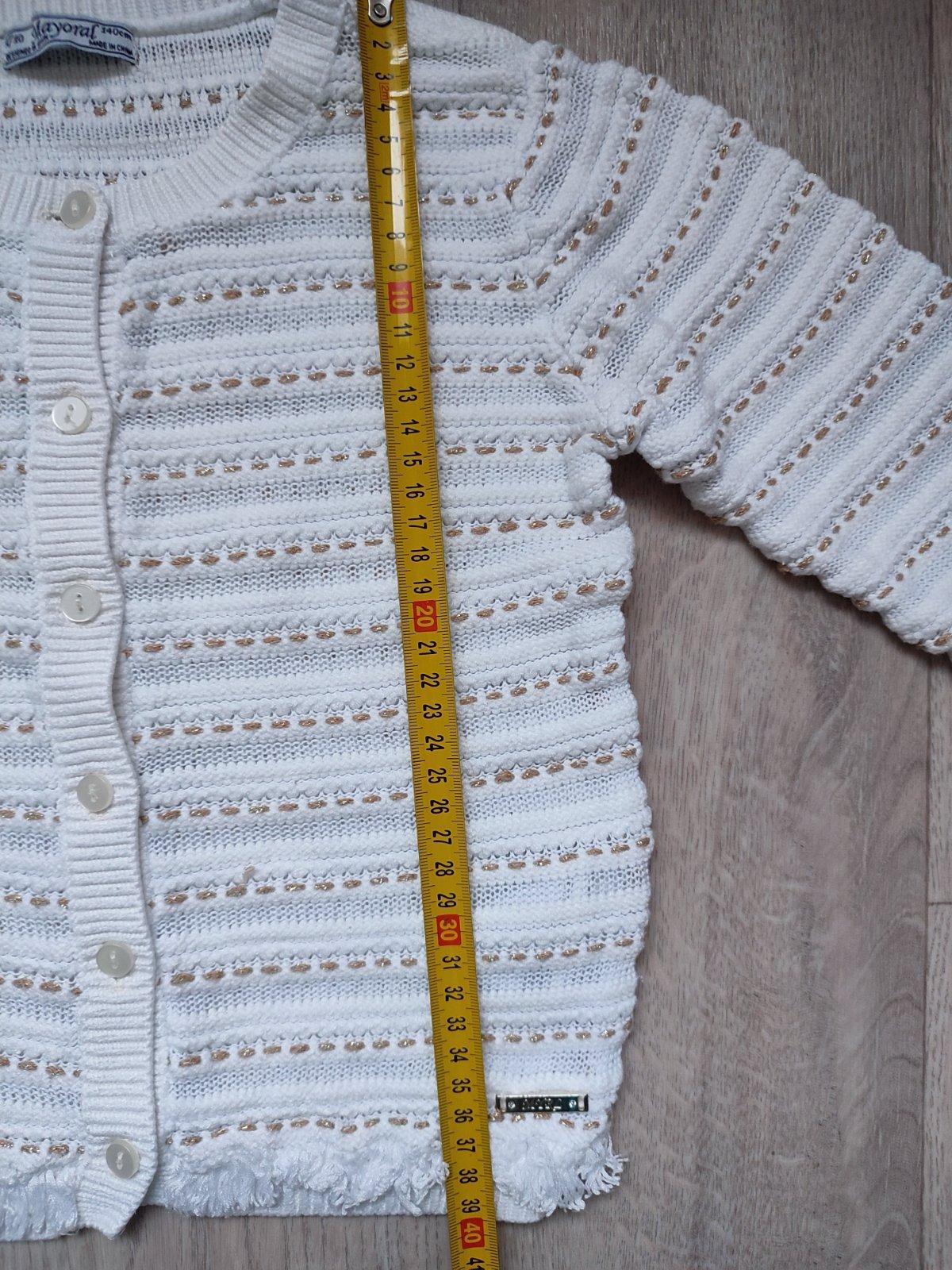 Sveter s 3/4 rukávmi háčkovanými. Ako nový! veľkosť uvedená 140. Bavlnený, príjemný na nosenie. Vpredu 2 vrecká. Dĺžka: 50, vzadu predĺžený Rukáv od krku: 42 Šírka: 39