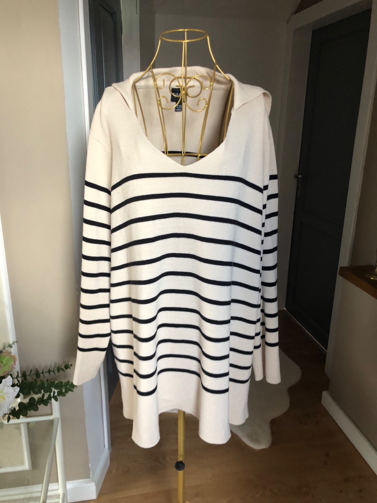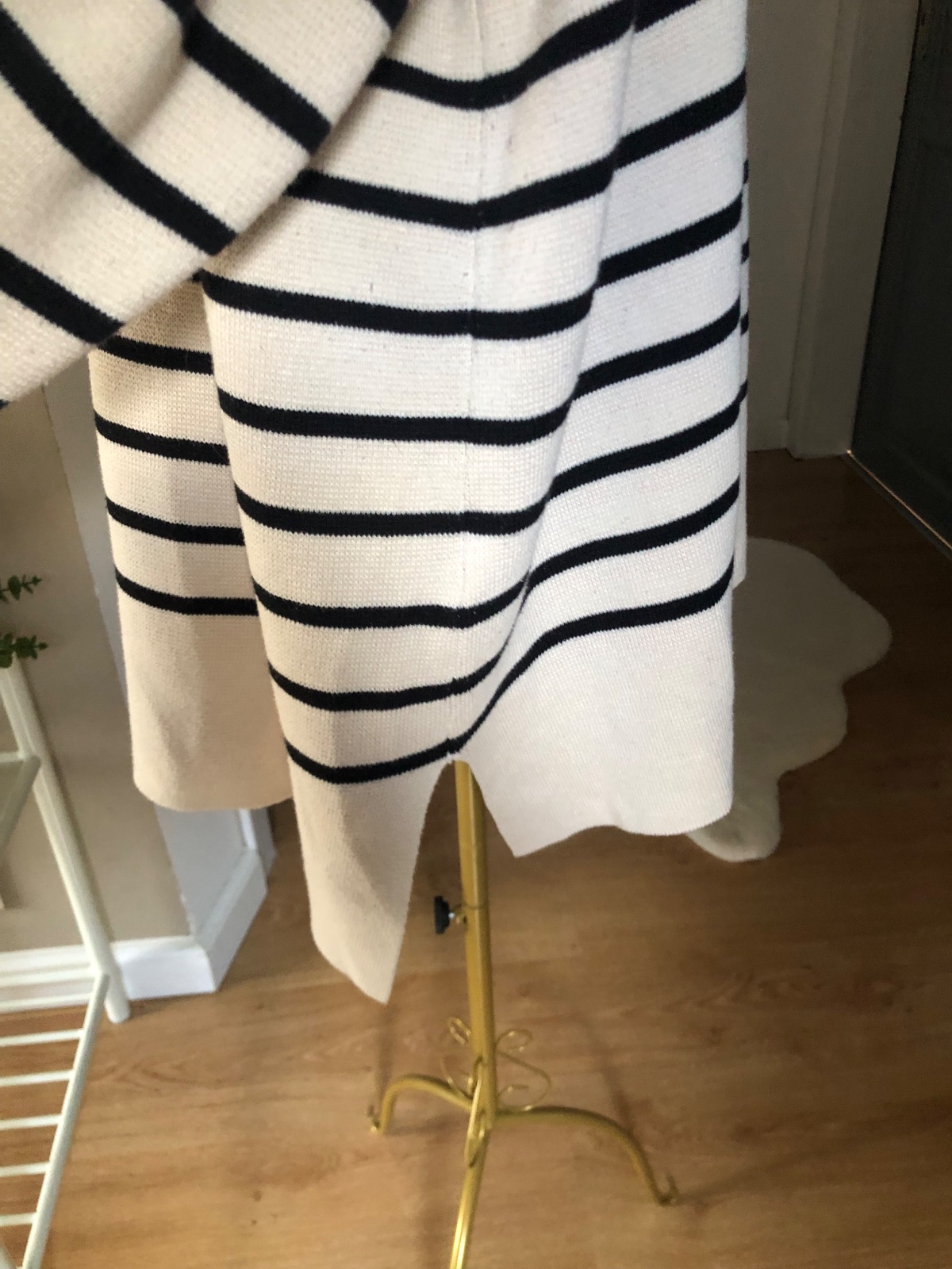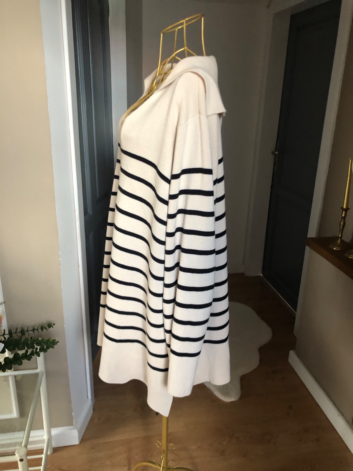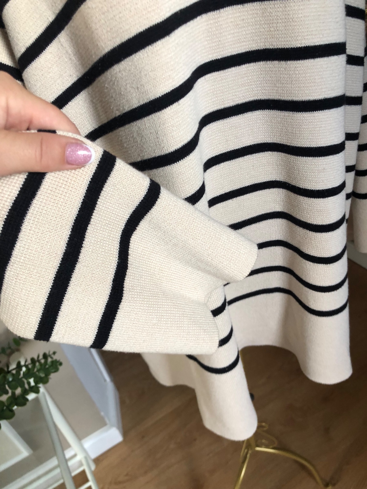 Kvalitný béžový pulover s čiernymi pasikami, s golierom, bočné rozparky, super stav.