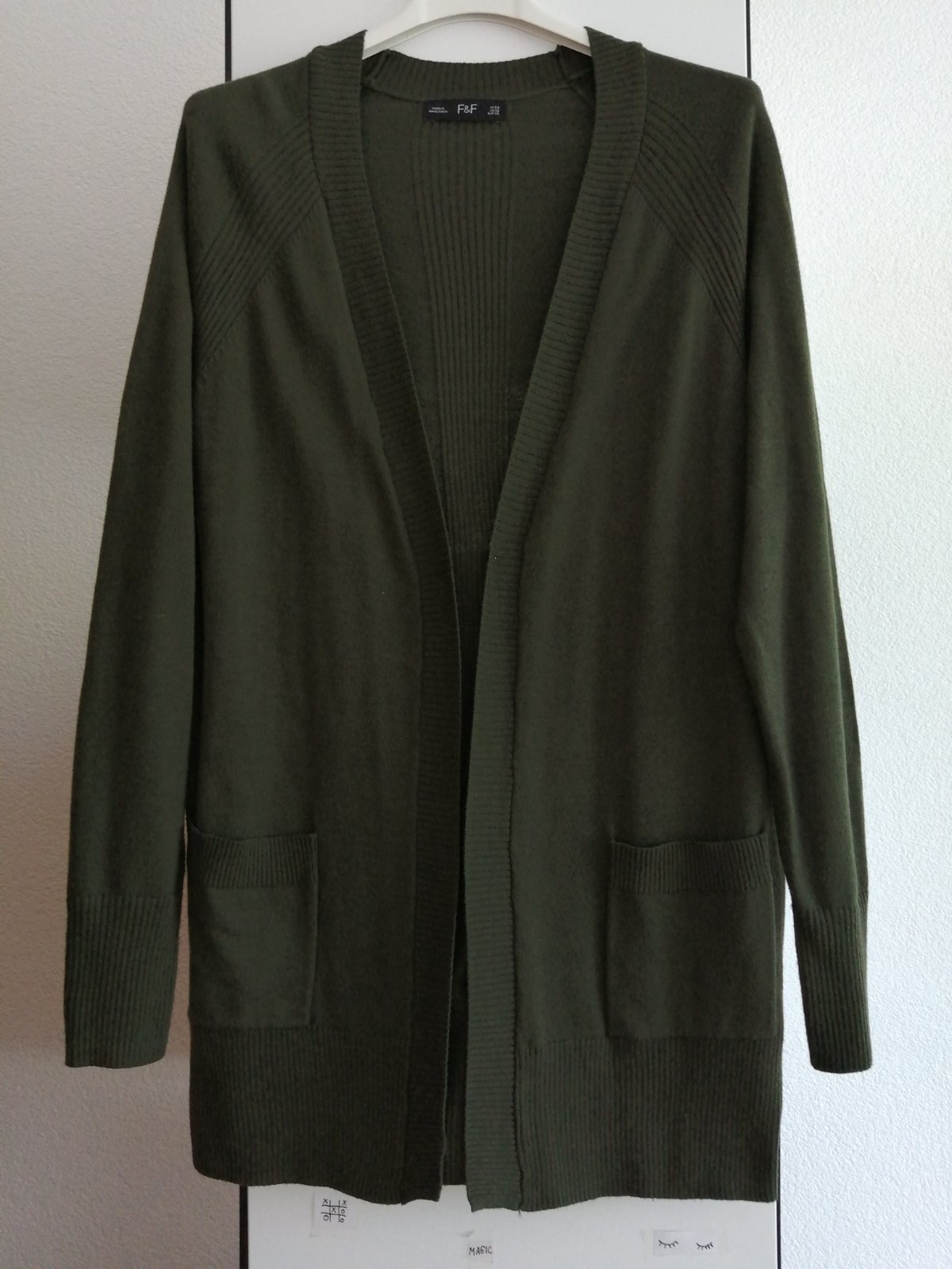 Pekný predĺžený kardigán zn. F&F, veľkosť 38 alebo M. Predĺžený strih, Olivovo - zelenej farby. Veľmi príjemný materiál - nehryzie, neškriabe. Sveter je vo výbornom stave pár-krát oblečený (cca 4-5 x). Cena 5,50 eur + poštovné