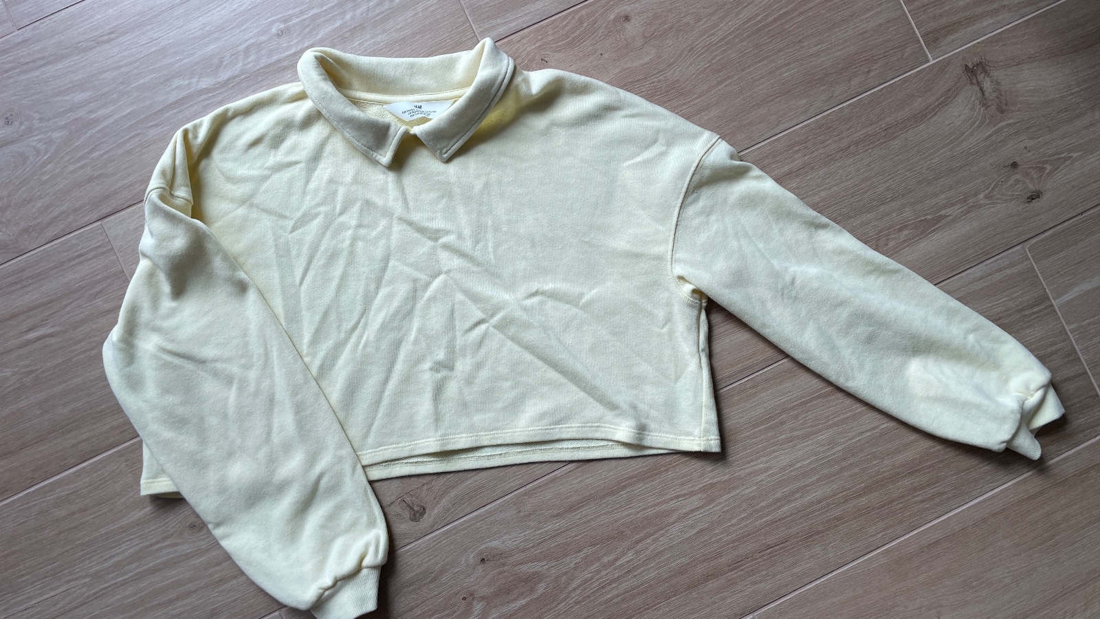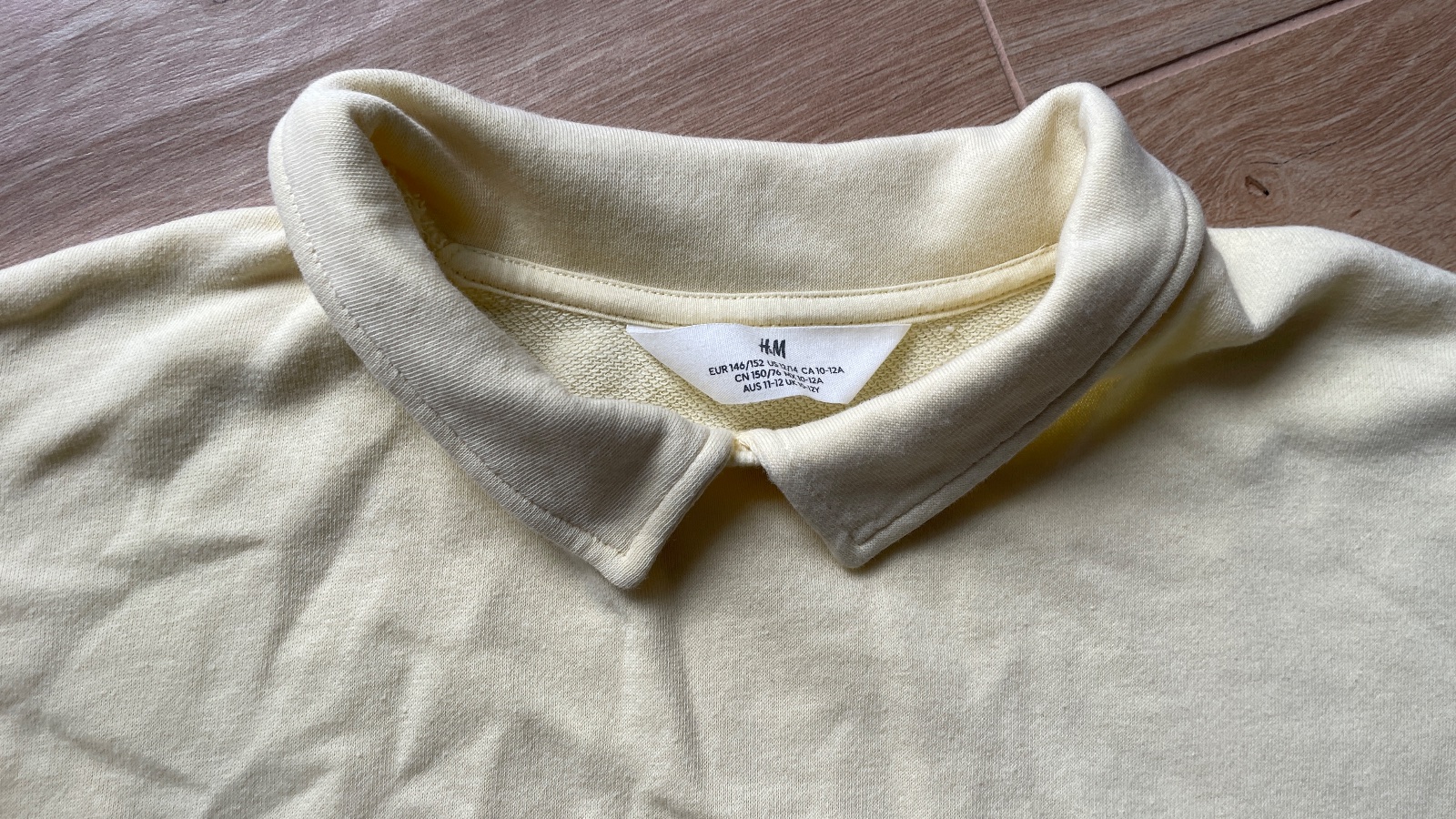 Jednoduchá tenšia mikinka z kolekcie H&M basic, bledožltá farba s dvoma bielymi pruhmi. Veľmi príjemný materiál - tenký a ľahký (100 % bavlna). Dĺžka 42 cm, šírka cez hrudník cca 46 cm, dĺžka rukáv...