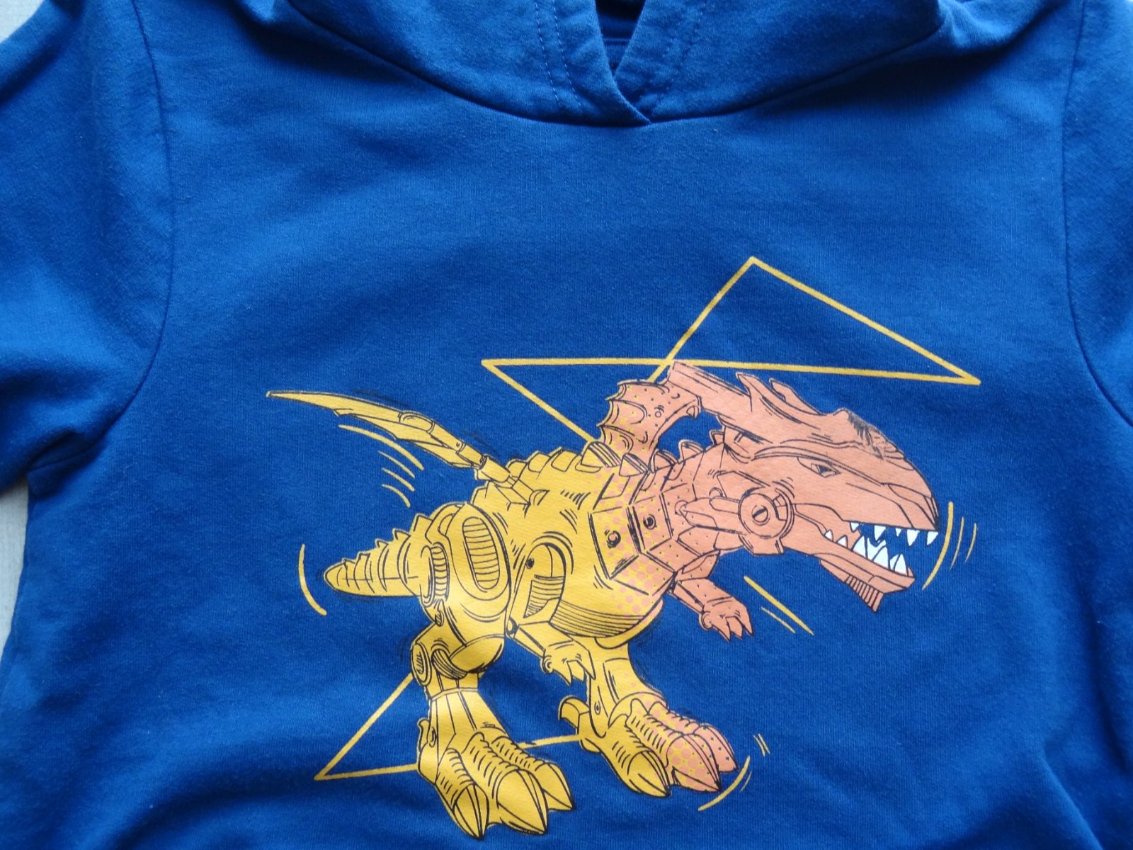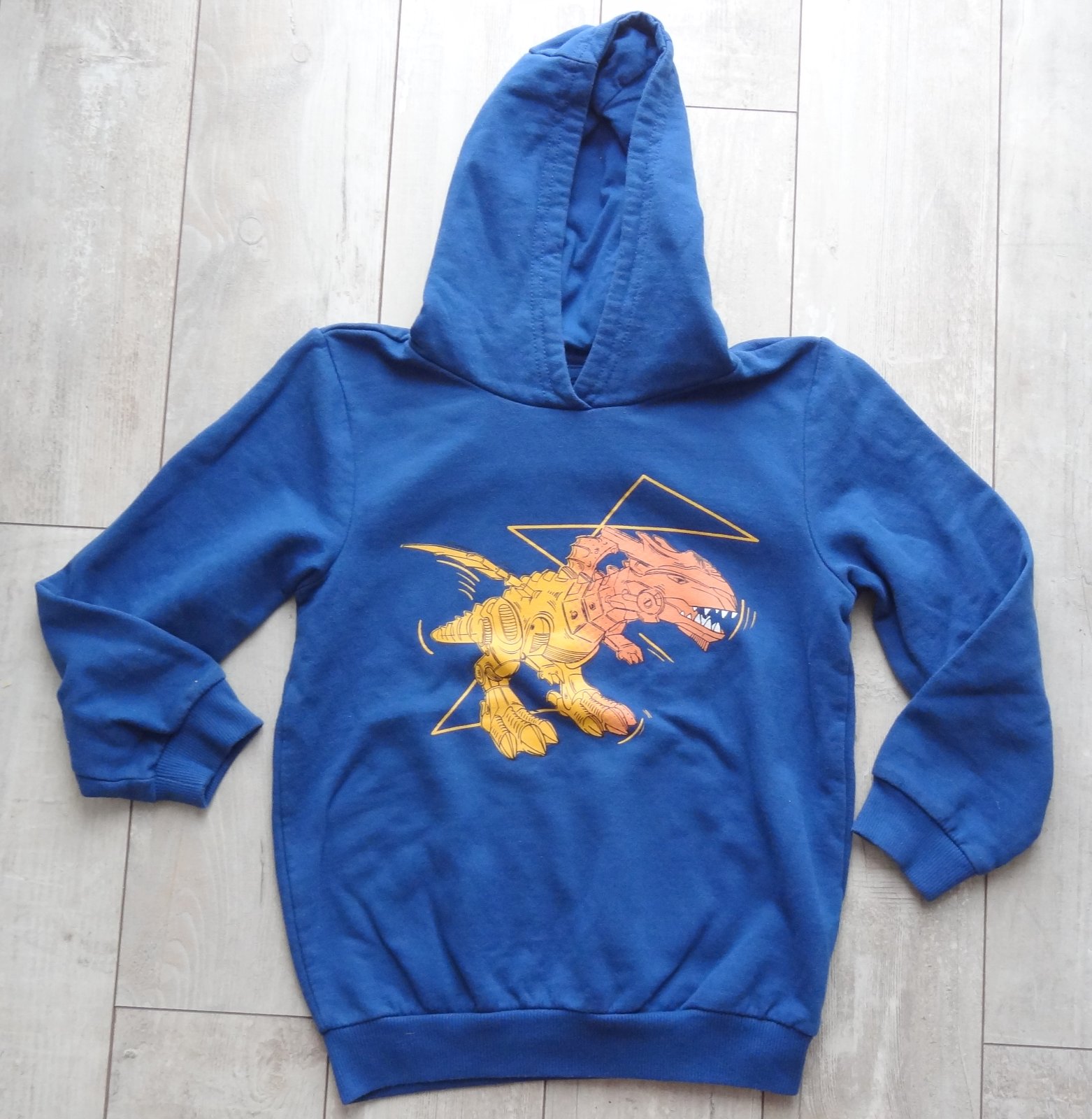 Modrá mikina Dinosaury, v dobrom stave, s kapucou, veľ. 128 - dĺžka 46 cm, šírka pazuchami 38 cm