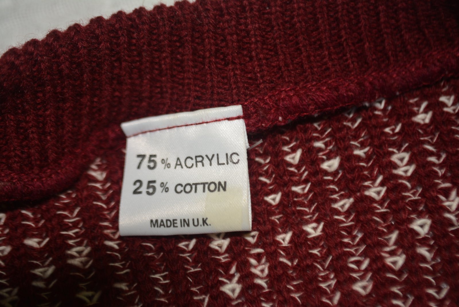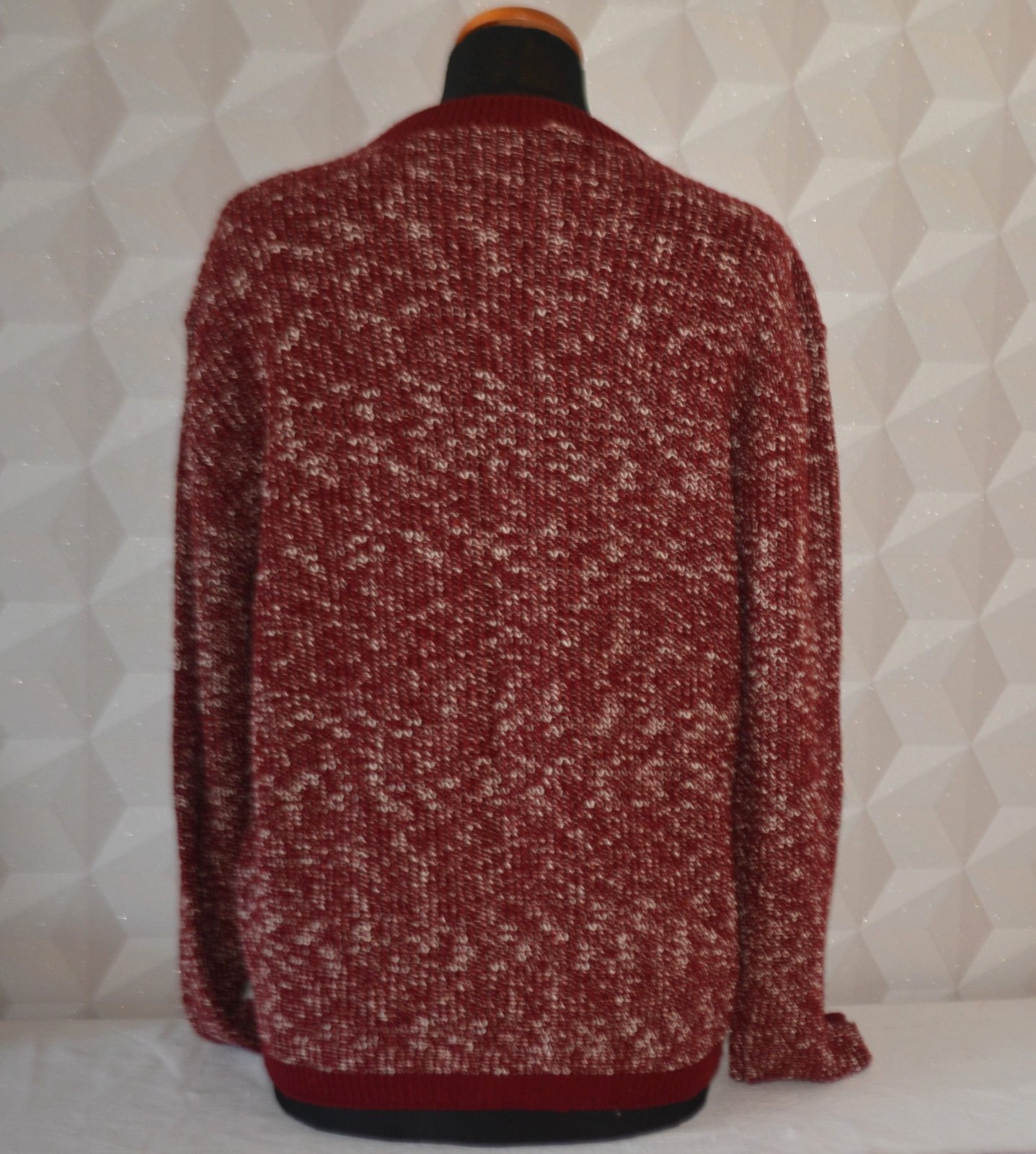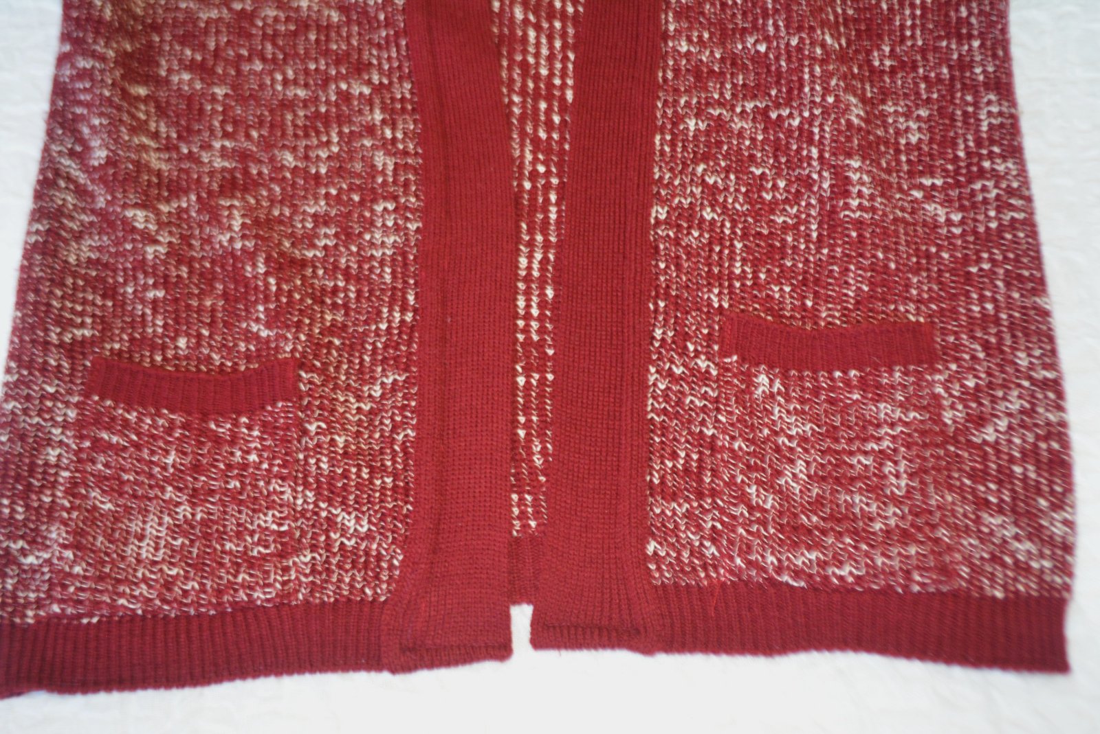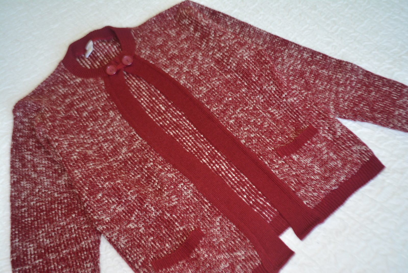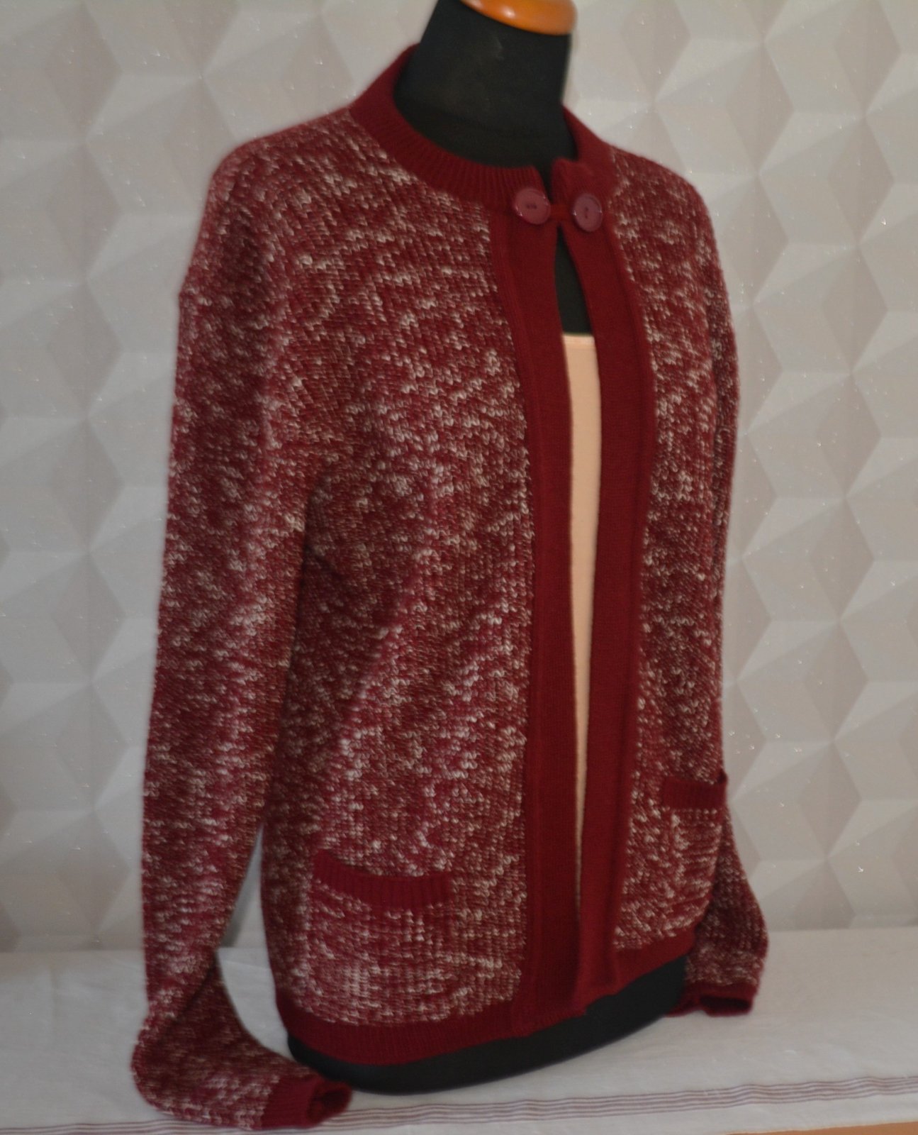 Svetrík je kvalitný, so zapínaním na jeden gombík hore, melírovaný s bordovým lemovaním - vpredu má vrecká.