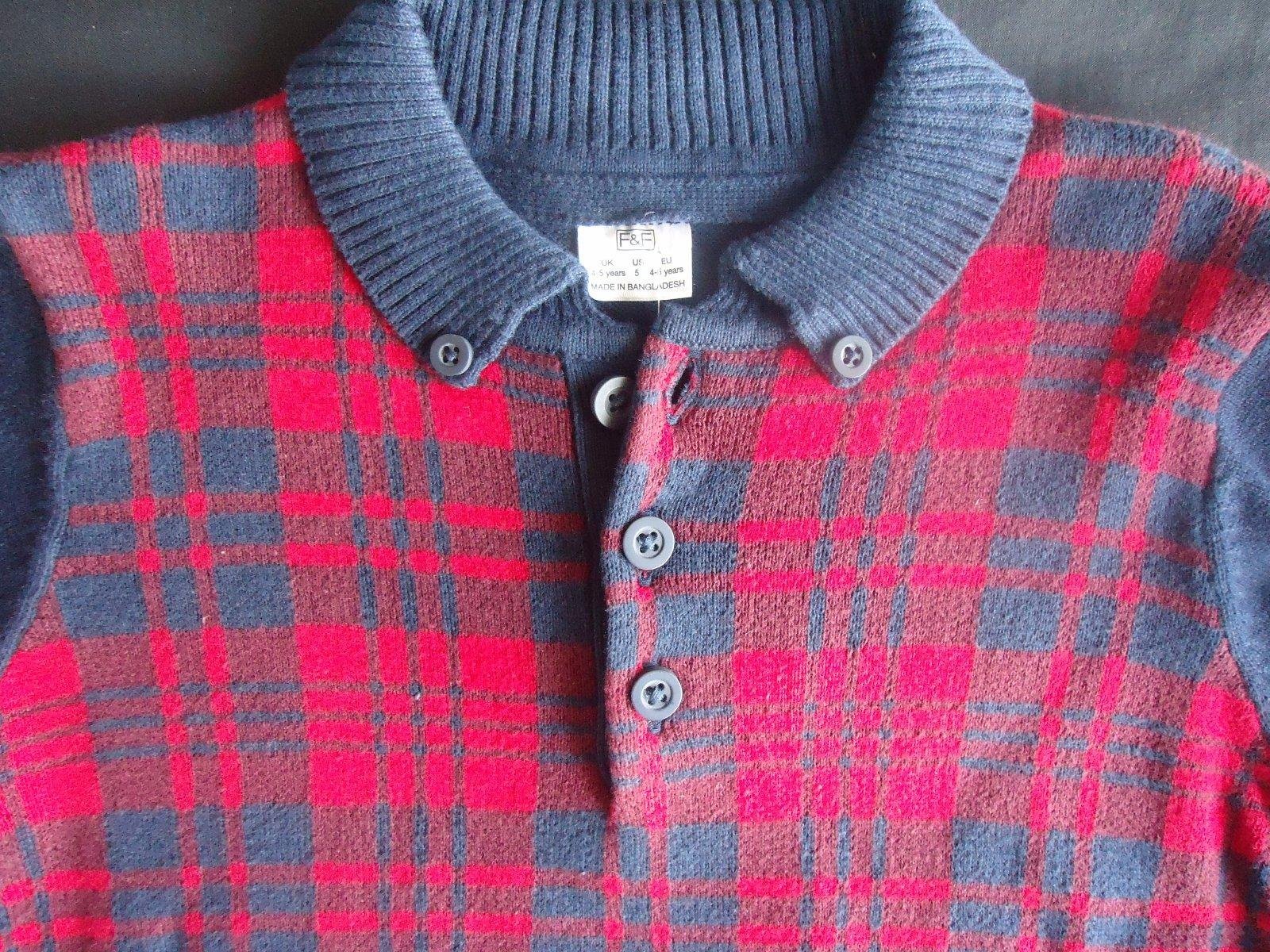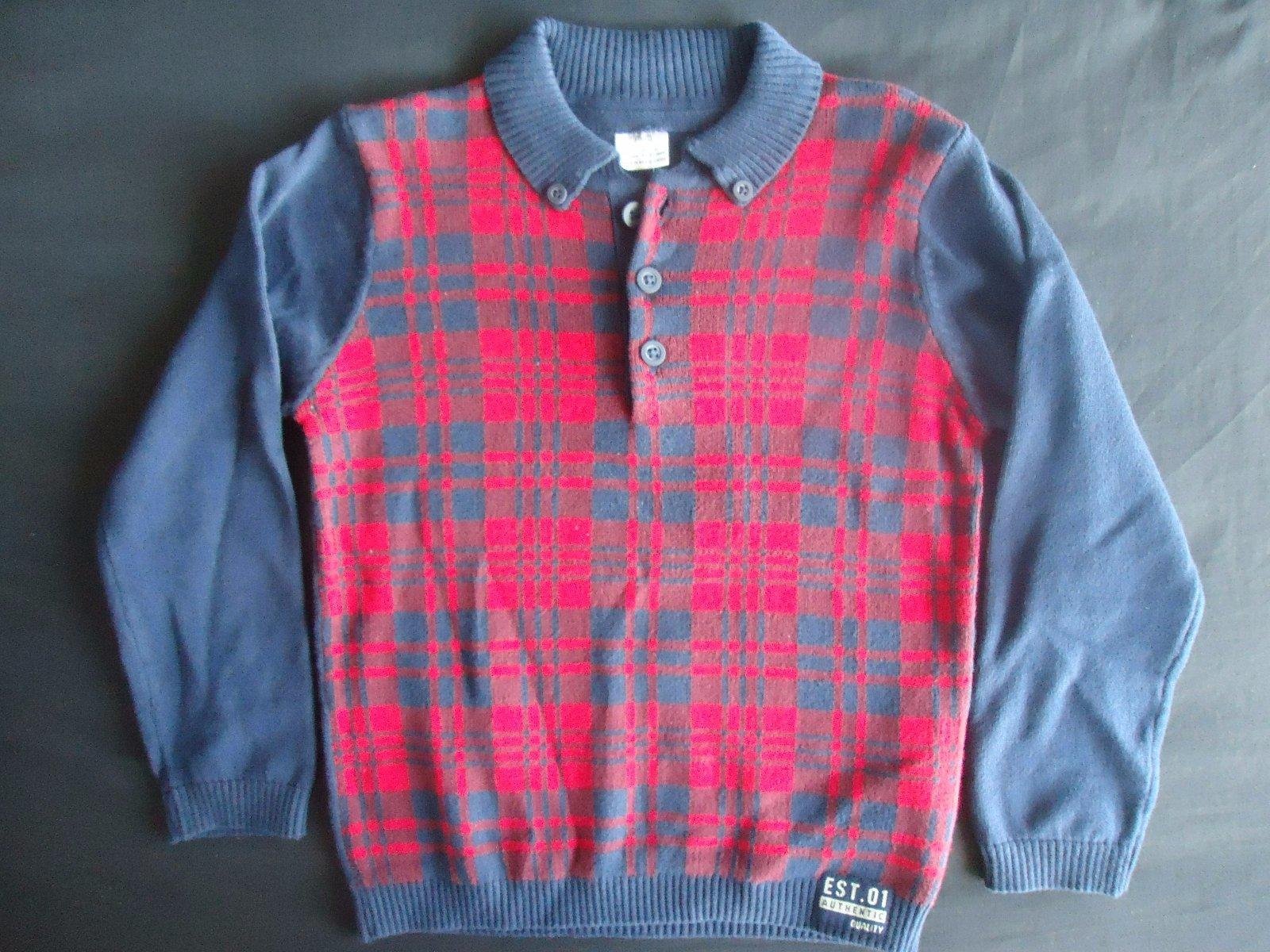 Len vyprany, nestihli sme vynosit....Fantasticky pulovrik v kombinacii cerveno-modrej. vpredu karovany vzor, maly limcek s gombickami, prijemny stredne hruby material....