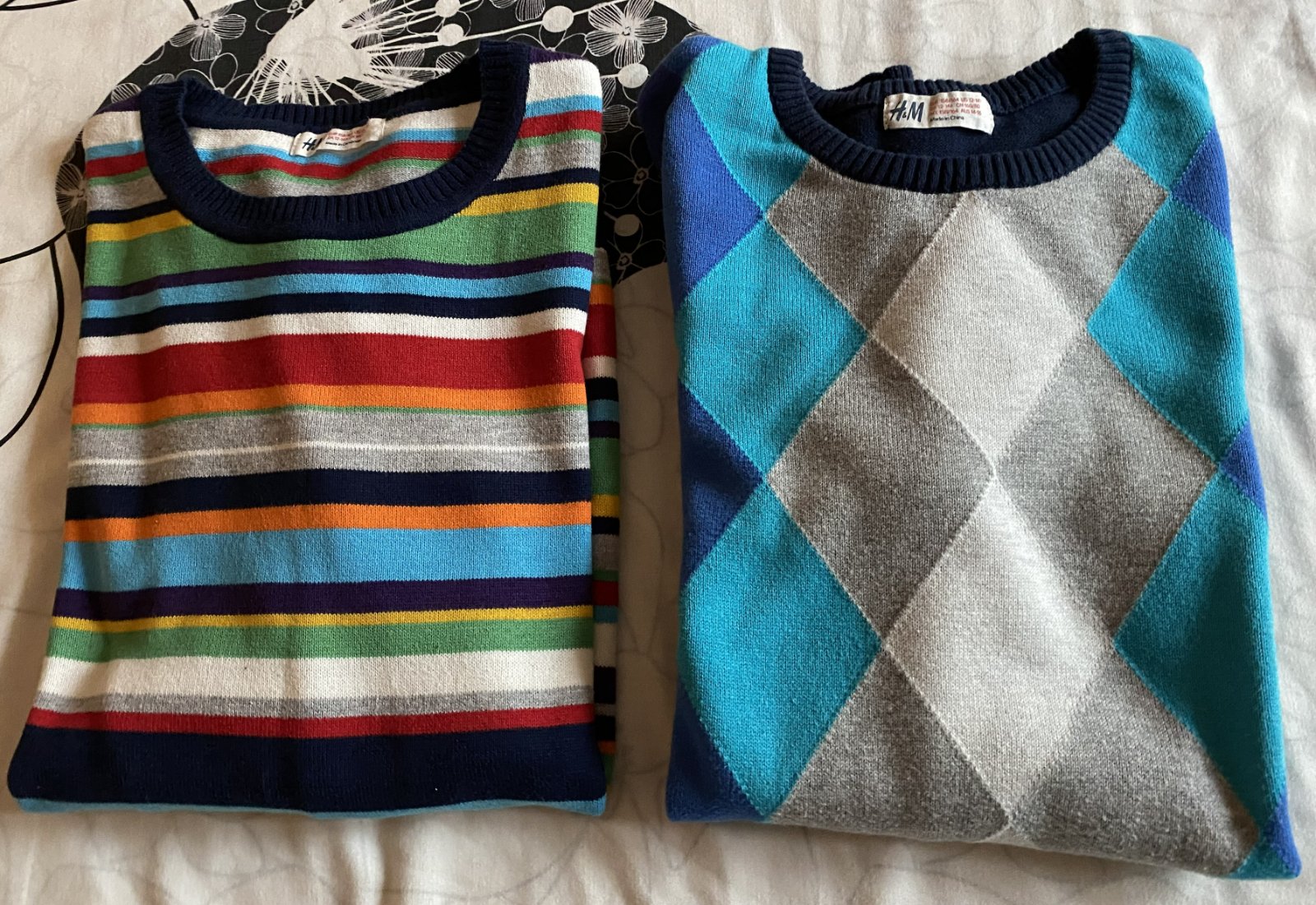 Bavlnený pulóver s kosoštvorcami H&M v. 164 - 14 rokov, vhodný pre chlapca aj pre dievča,100% bavlna - pletenina, nie hrubá, raz oblečený, ako nový. Miery: dĺžka od krku dolu: 63cm, šírka: 45cmx2, rukáv od ramena: 62cm + 13 plece vrátane lemu okolo krku. Je pružný, všade povolí.