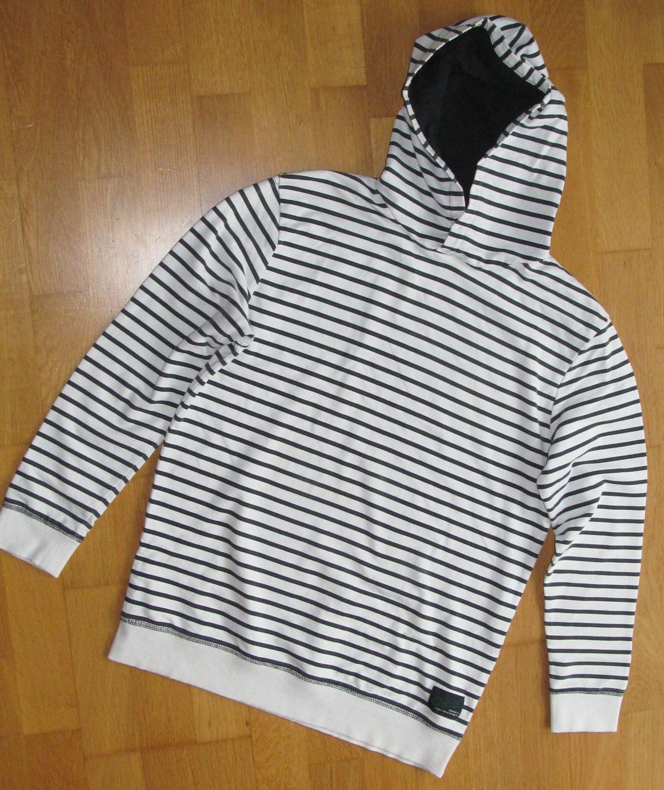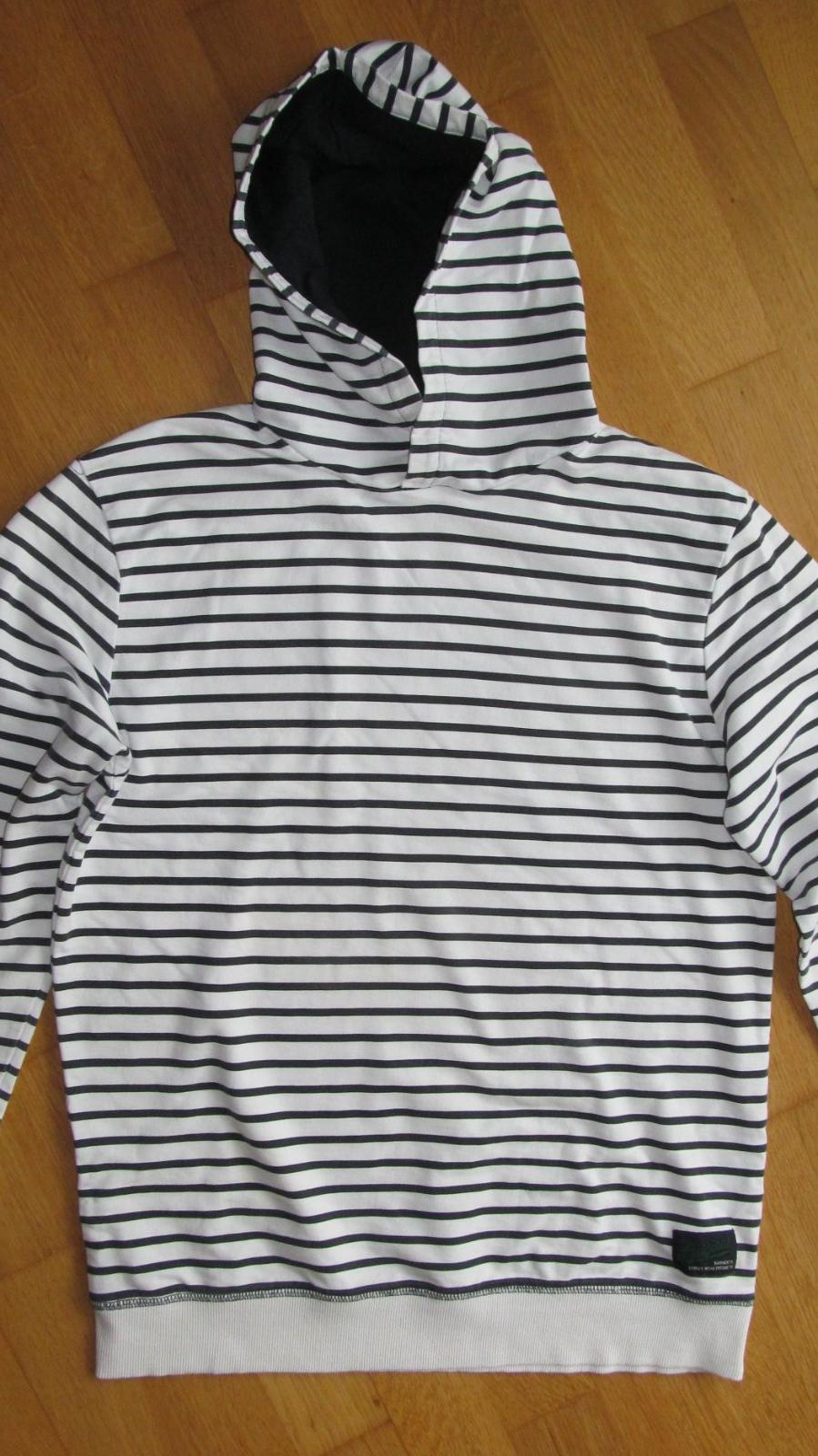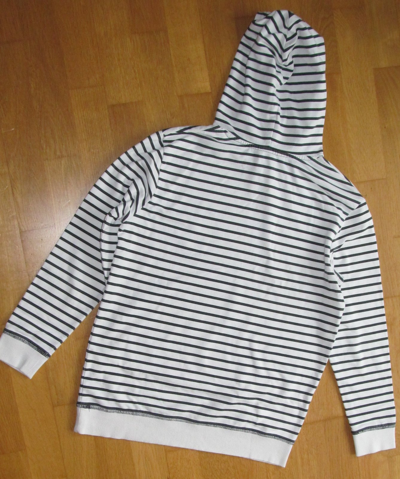 len parkrat oblecena mikina, chyby som ziadne nenasla, nema ani zmolky. Nie je zateplena, je to stredne hruba - klasicka teplakovina. Prijemna bavlna, kapucna podsita ciernou latkou. Dlzka od pleca 67, sirka pod pazuchou 50, samotny rukav 56,5, prieramok (od kapuce po rukav) 12,5 cm
