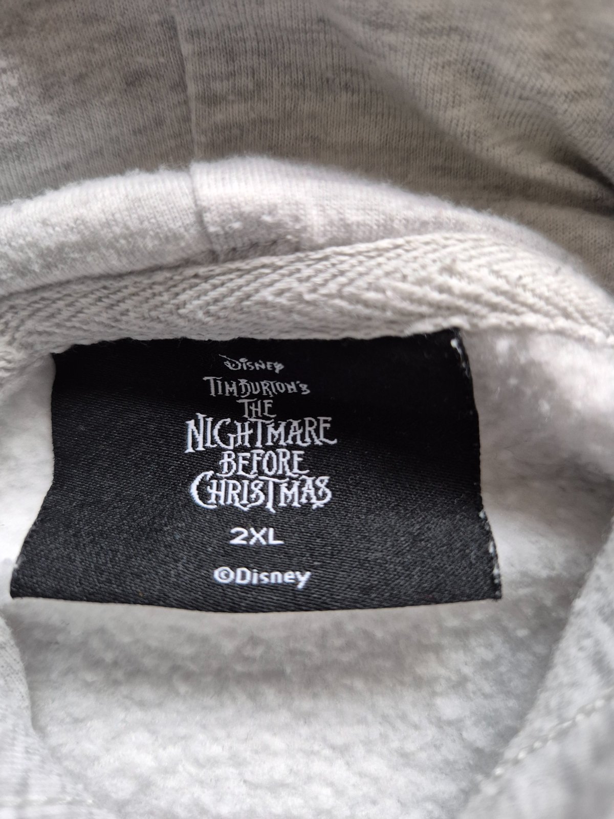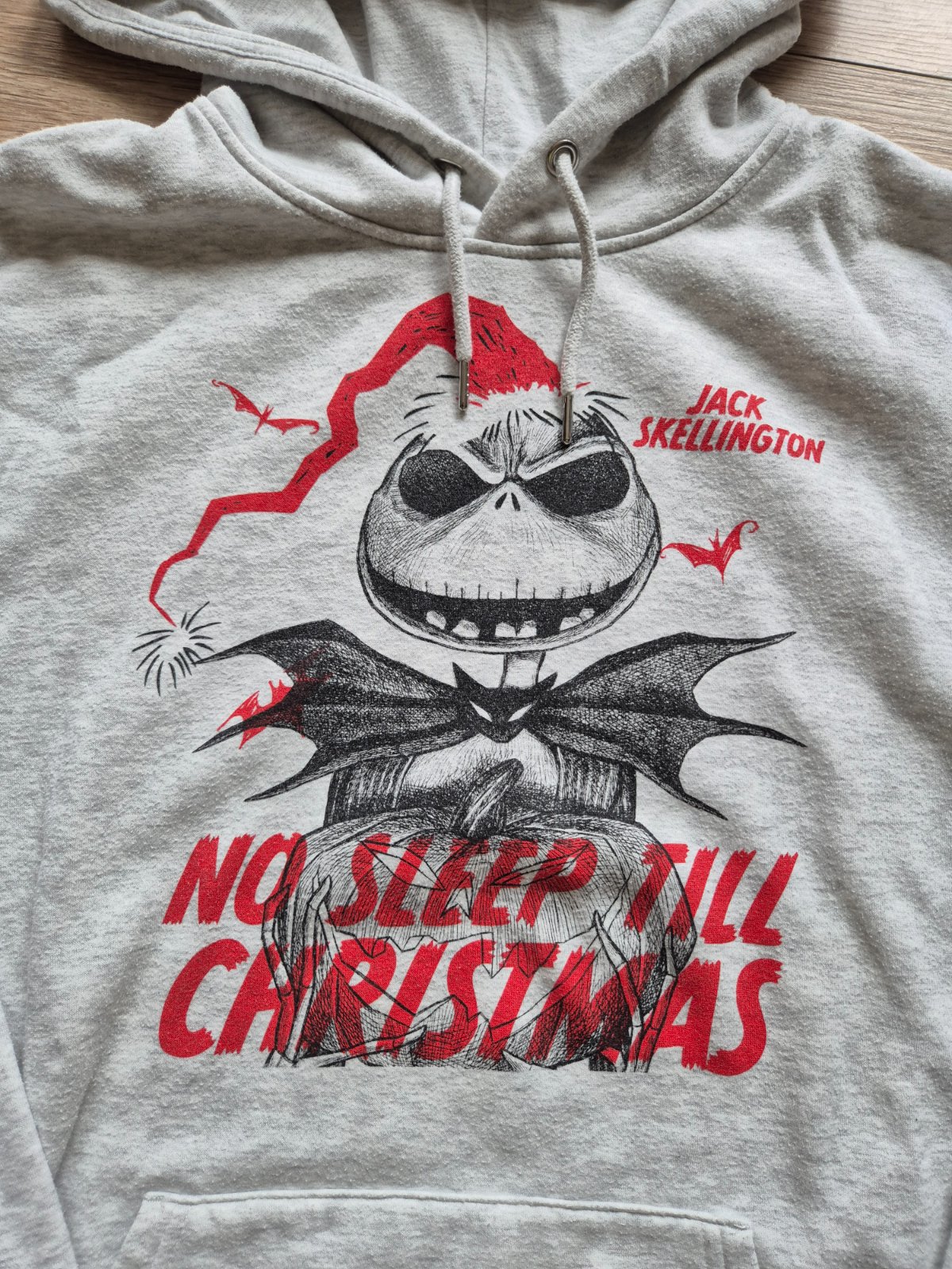Sivá mikina s kapucňou s potlačou Jacka Skellingtona s nápisom „NO SLEEP TILL CHRISTMAS“. Jack Skellington je protagonistom filmu Predvianočná nočná mora. Je to kostlivec, ktorý je tekvicovým kráľom Halloweenu.