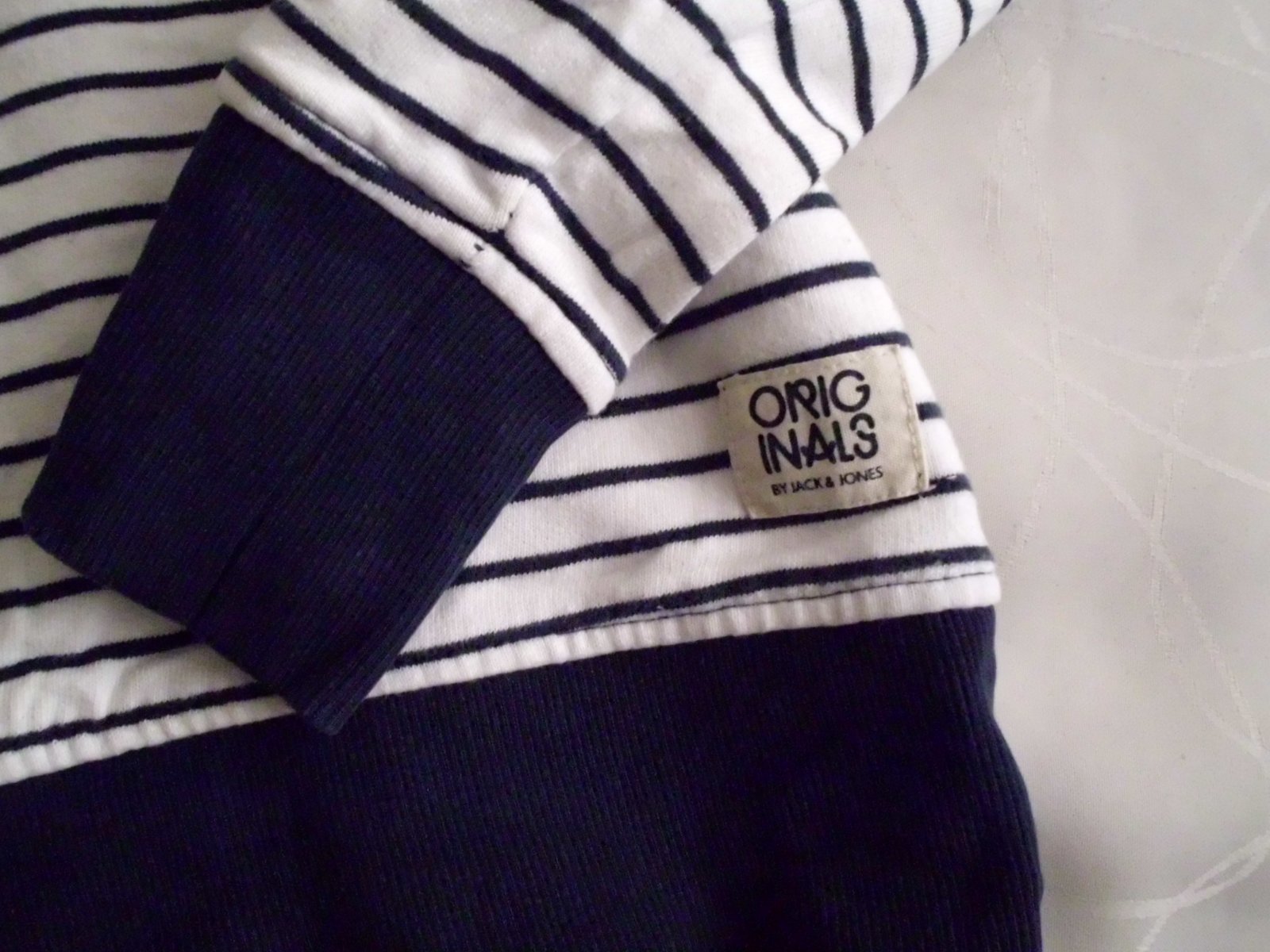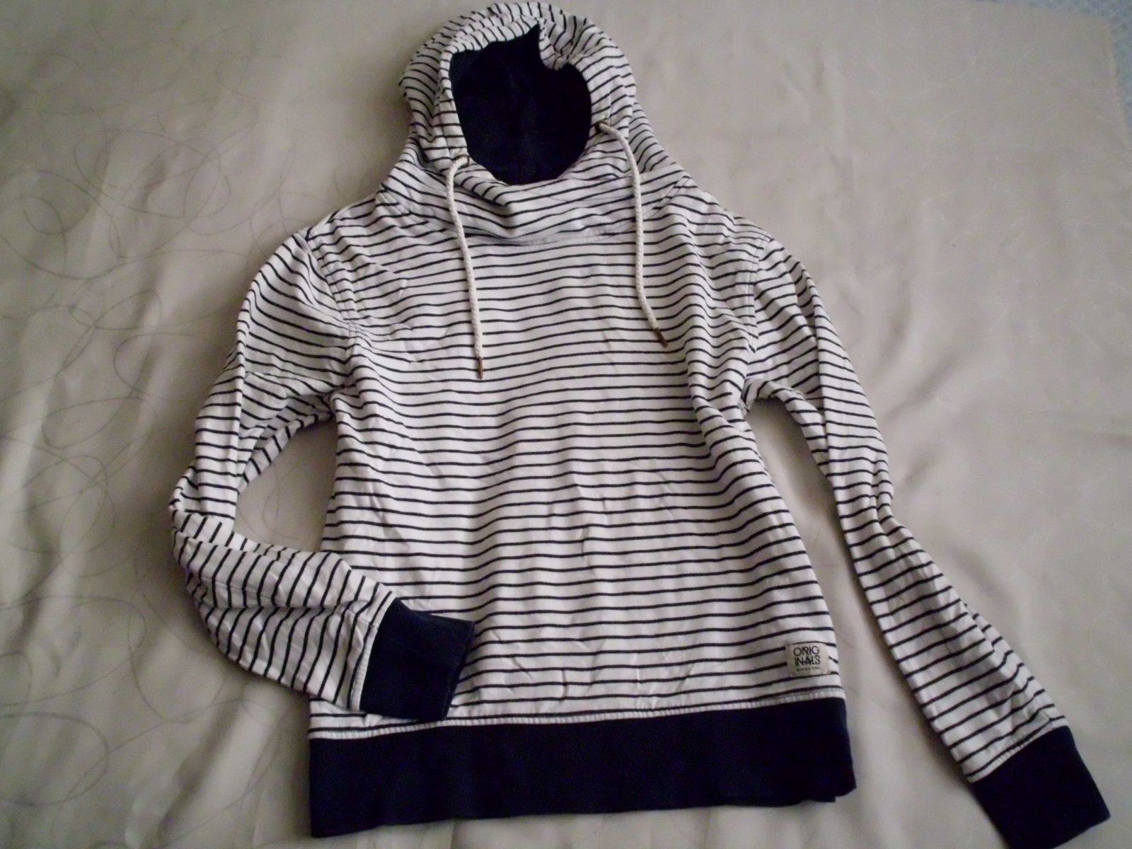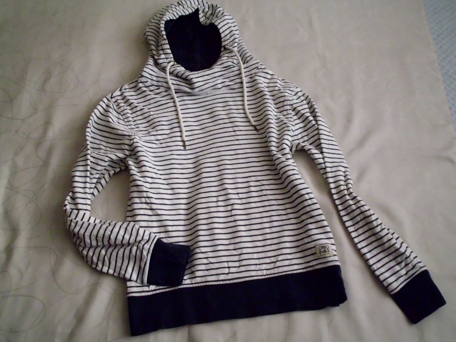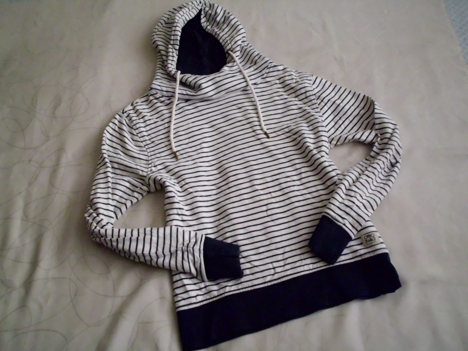 Predám dámsku mikinu Jack&Jones vel. M, šírka 53 cm, dĺžka 63 cm , rukáv od pleca 65 cm , príjemný stredne hrubý materiál, farba bielo modré pásy , super stav ...