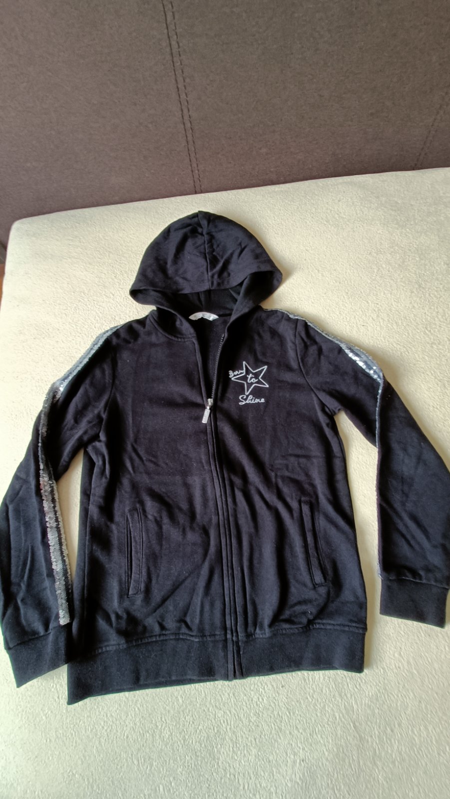 Predám mikinu s flitrami na rukávoch veľ. 152/158. Dĺžka 58 cm, šírka pod pazuchami 46cm. Bez poškodenia. 55% polyester, 45% bavlna . Cena 6 € + poštovné resp. osobný odber