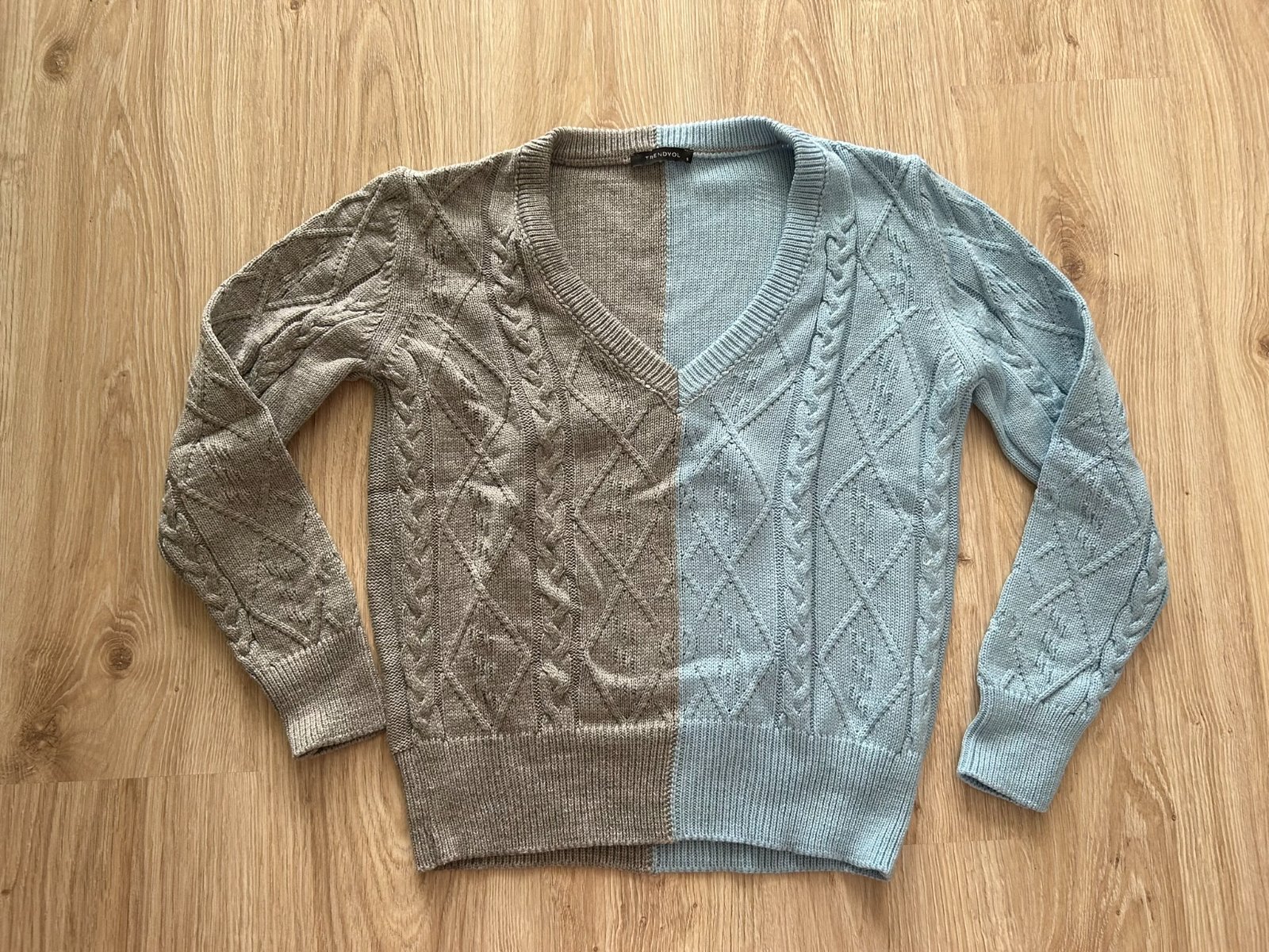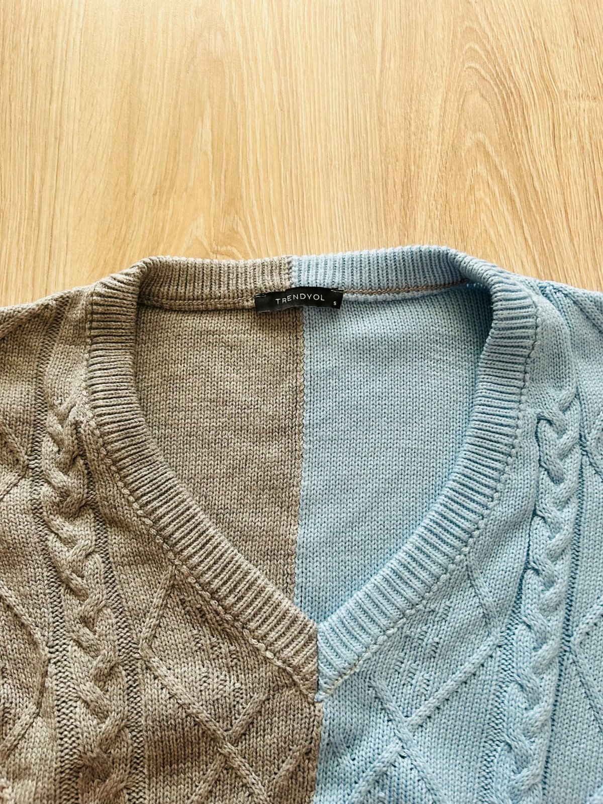 Predám tento krásny pletený sveter značky TRENDYOL vo veľkosti S. Sveter bol len raz oblečený. Má krásny pleteninový vzor a je dvojfarebný. Má dlhý rukáv a V-čkový výstrih. Materiálové zloženie: 100% akryl