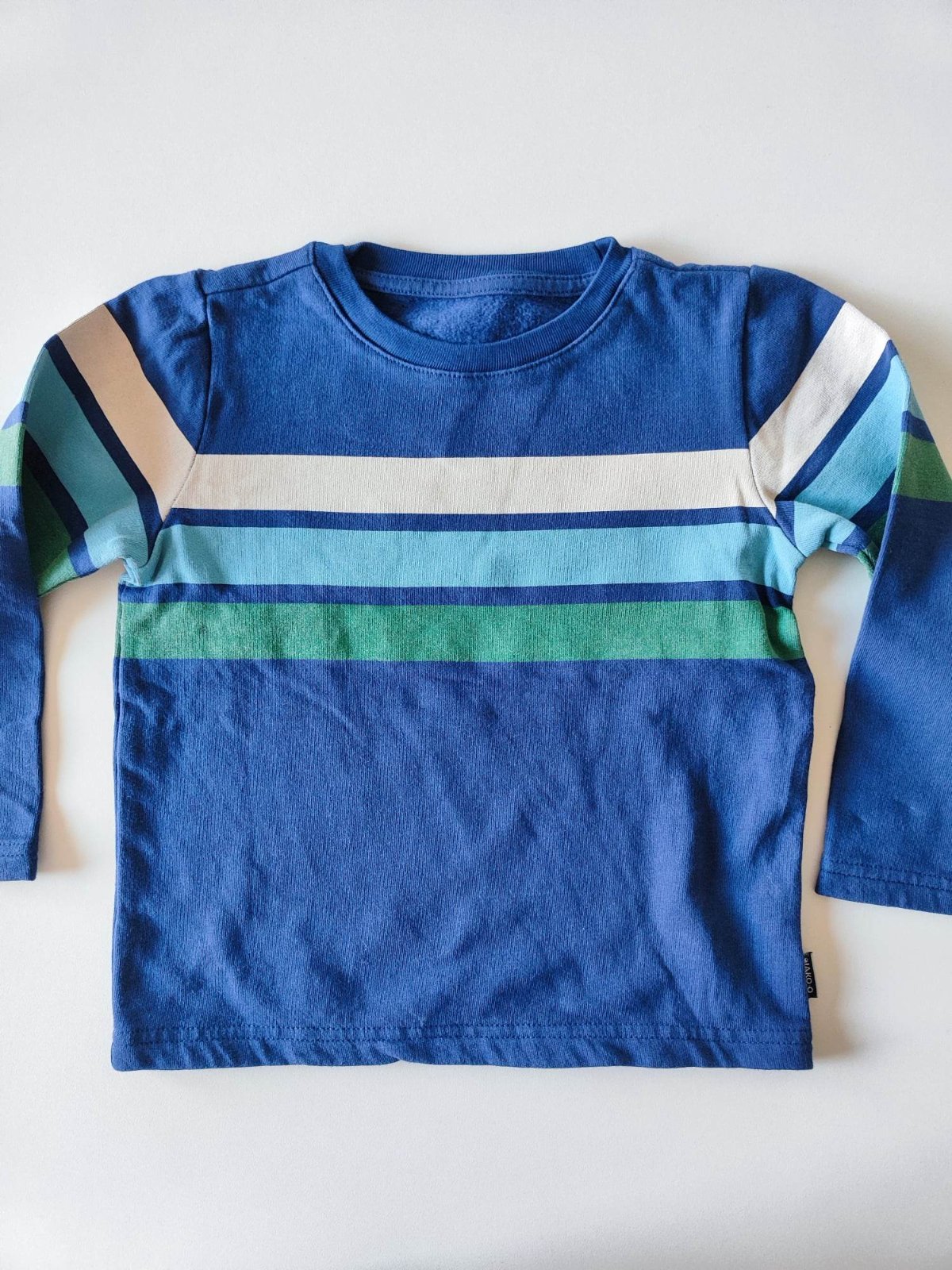 Krásna pasikava mikina v super stave. Velkostne však oveľa menšia ako je na štítku. Mne sedi skôr na rozmedzie 104/110.