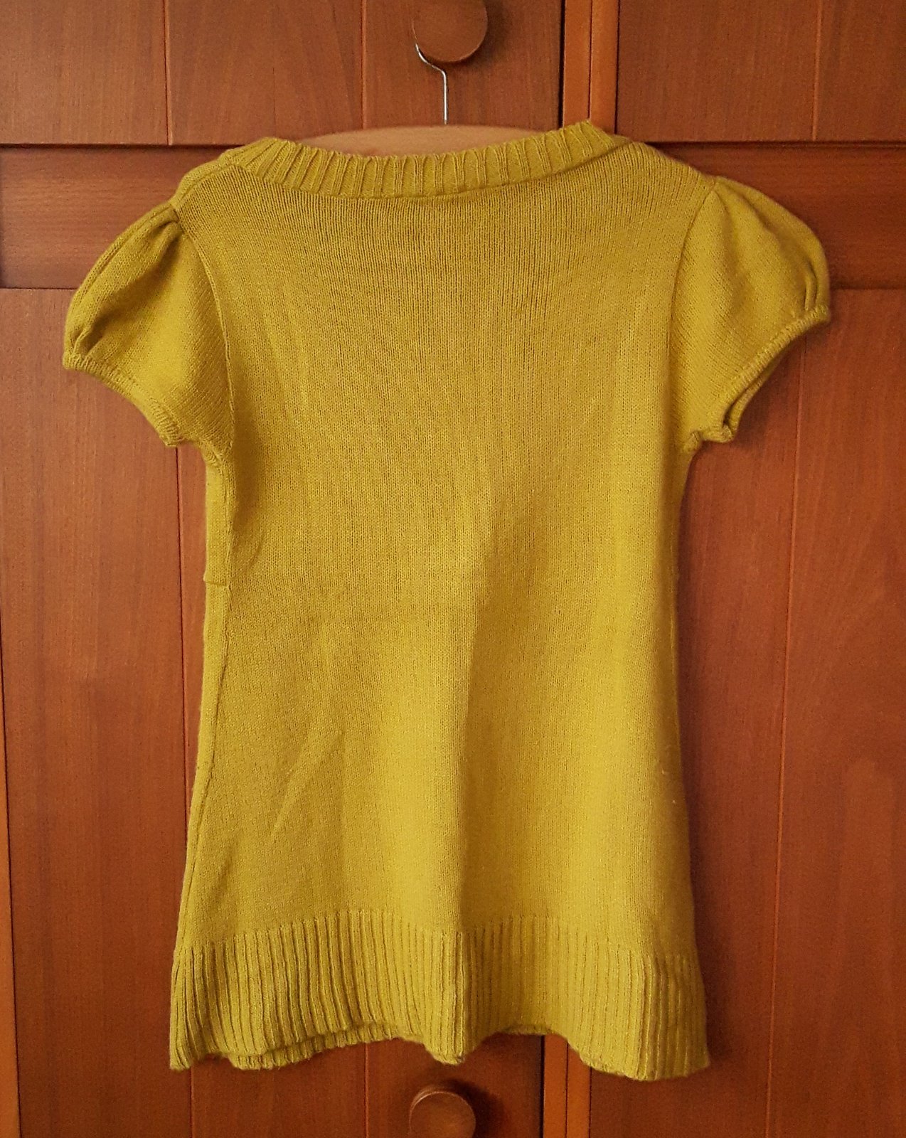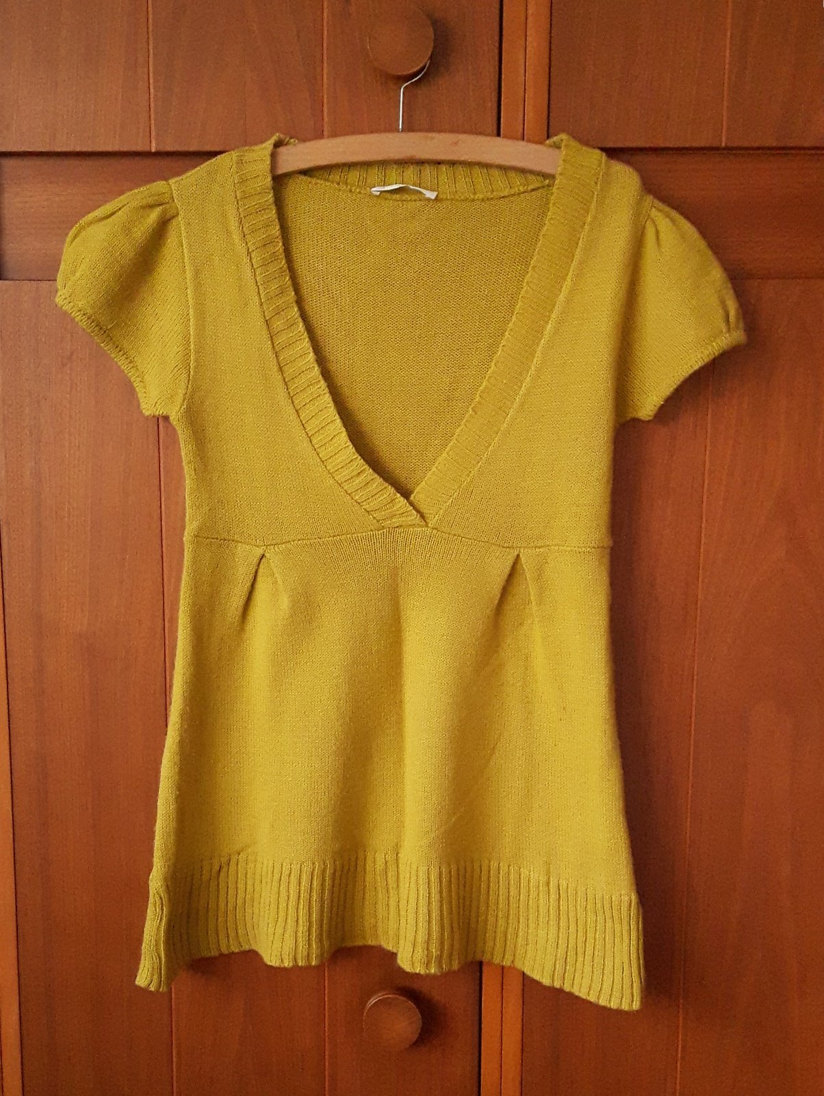 Dámsky svetrík krásnej žlto-zelenej farby s krátkym rukávom - niečo ako vestička napr. na košeľu. Má hlbší výstrih a je Áčkového strihu. Nosený, ale málo. Bez poškodení! Veľkosť už neviem, ale zrejme S alebo M, značka PROMOD. Dĺžka 64 cm, šírka 36 cm. V prípade záujmu ešte premeriam! Budem rada, keď niekomu poslúži:).