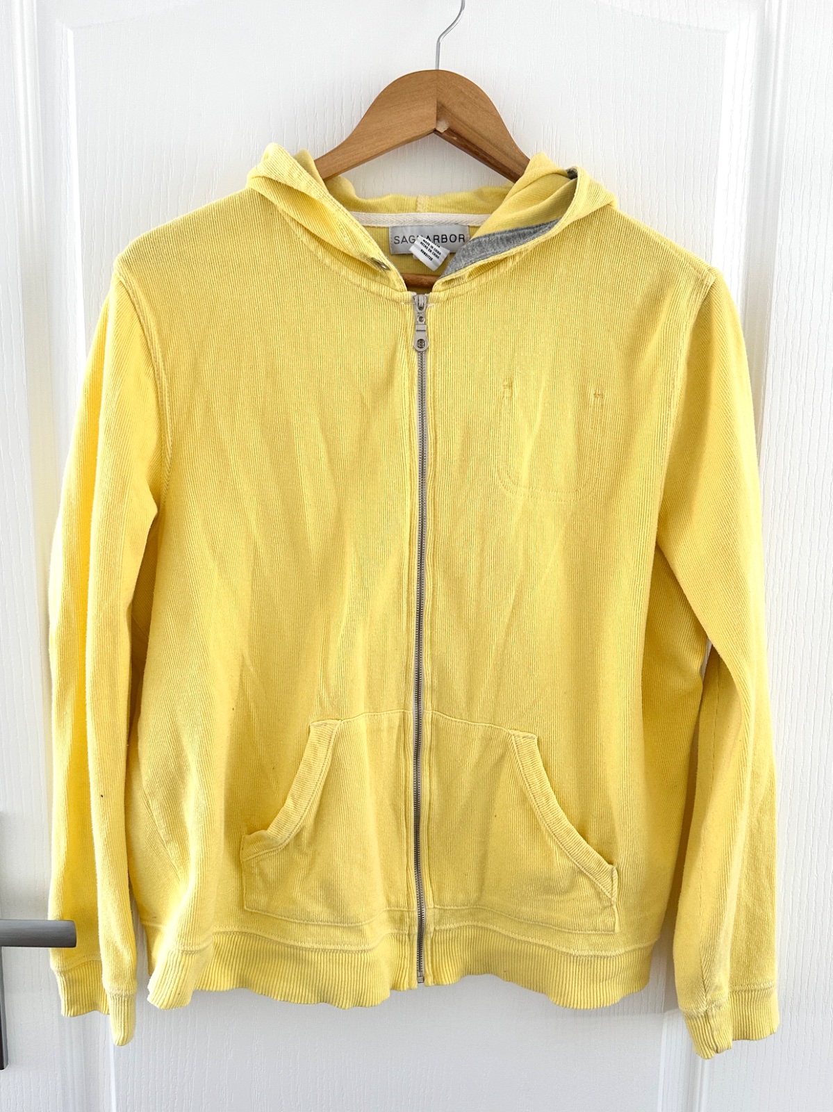 Žltá mikina s kapucňou Sag Harbor na zips. Štýlová a pohodlná mikina v slnečnej žltej farbe, ideálna na jarné prechádzky alebo chladnejšie letné večery. Je vyrobená z mäkkej, priedušnej bavlny a poskytuje celodenné pohodlie. Mikina má jednoduchý, klasický dizajn s kovovým zipsom. Integrovaná kapucňa je zakončená kontrastnou sivou melanžovou látkou. Dve klasické vrecká vpredu a jedno vo vnútri. Čistý povrch zdobí biela páska okolo krku. Veľkosť na štítku je L, dĺžka je približne 60 cm, šírka je približne 60 cm.