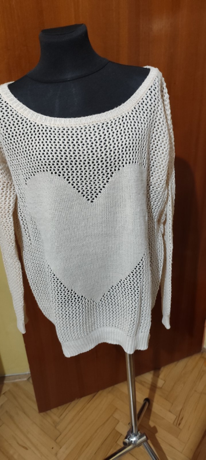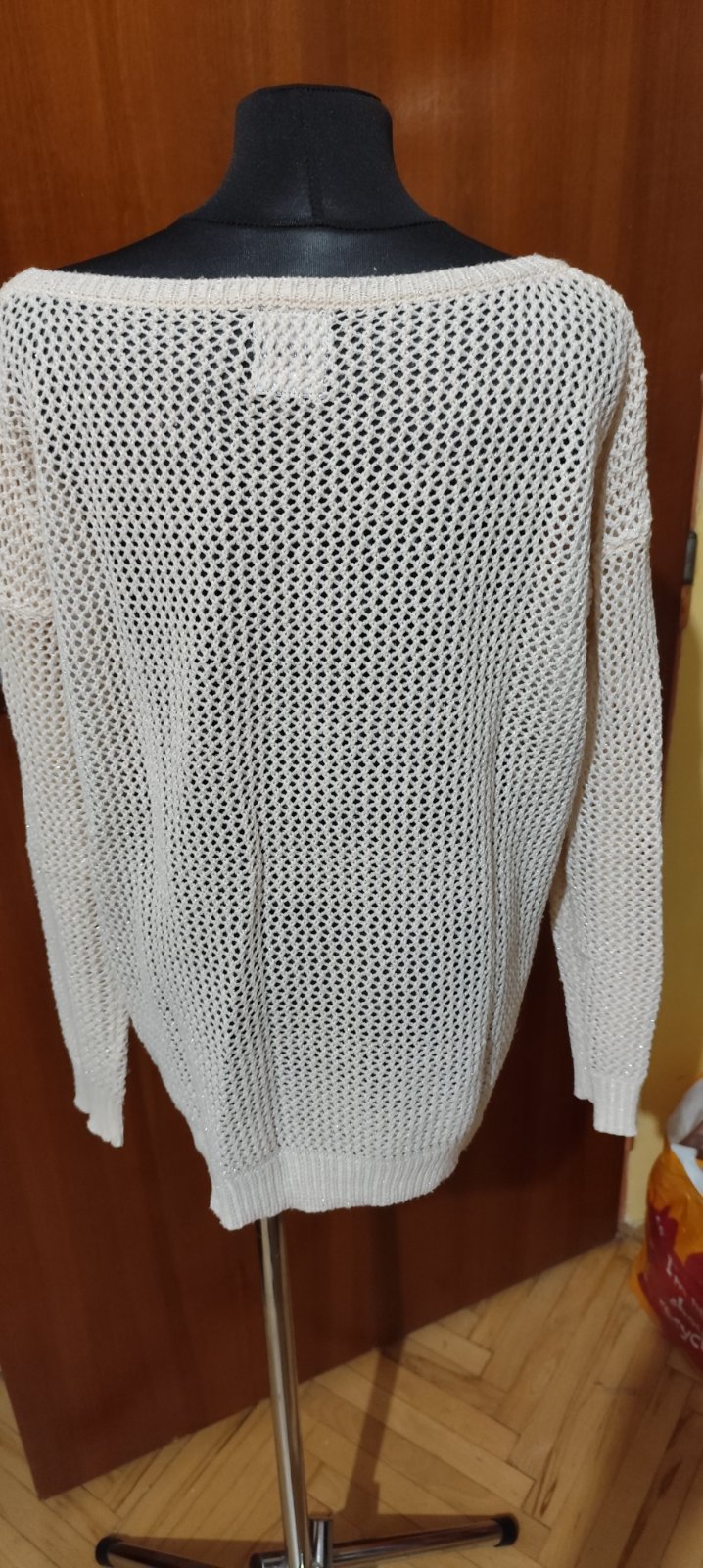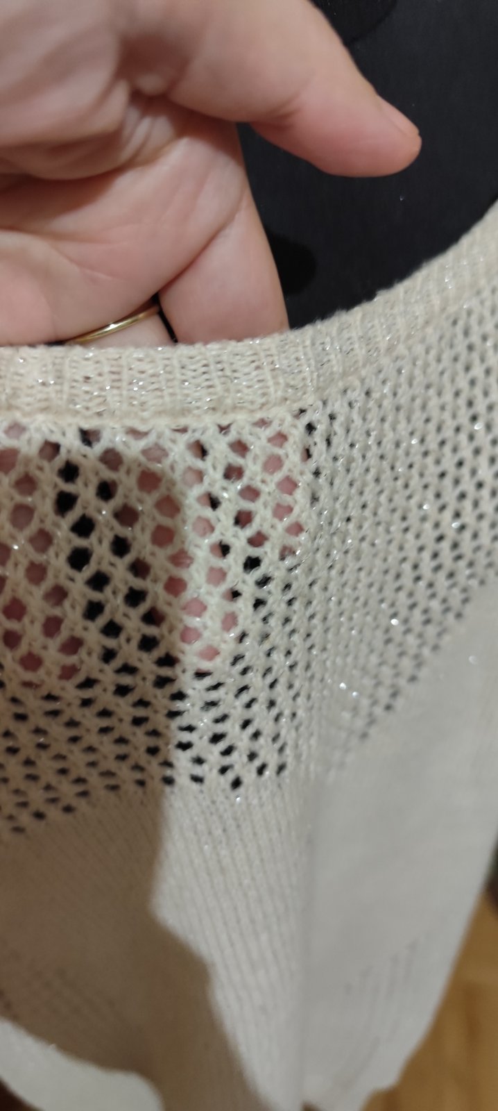 Predám pekný svetrík. Ma v sebe lesklú nitku, je krásny, nie je to veľmi vidno na fotkách. Farba je taká béžová s nádychom do jemnej ružovej. Svetrík je priesvitný, takže pod neho treba dať nejaké tielocko.
