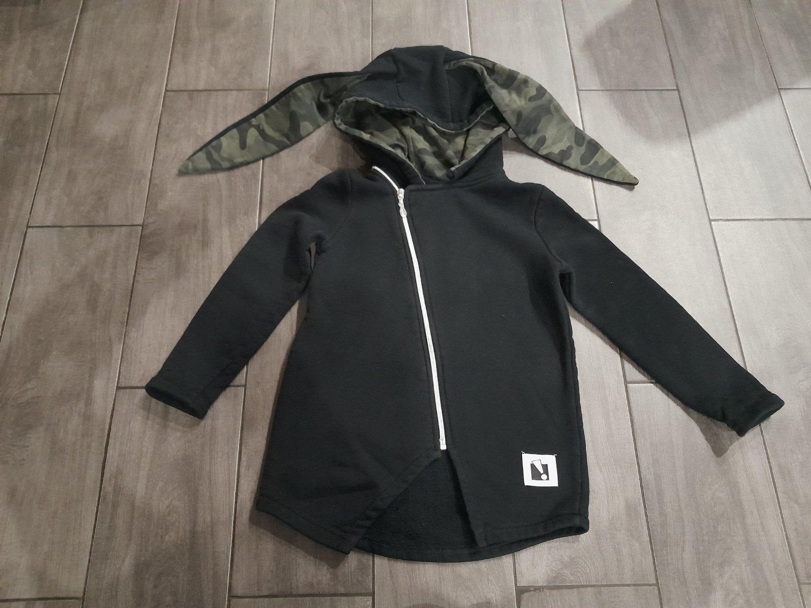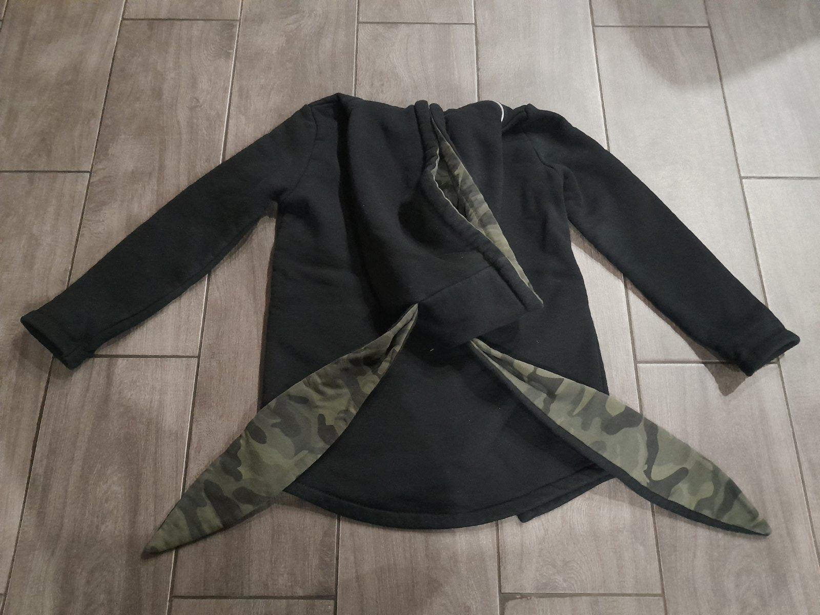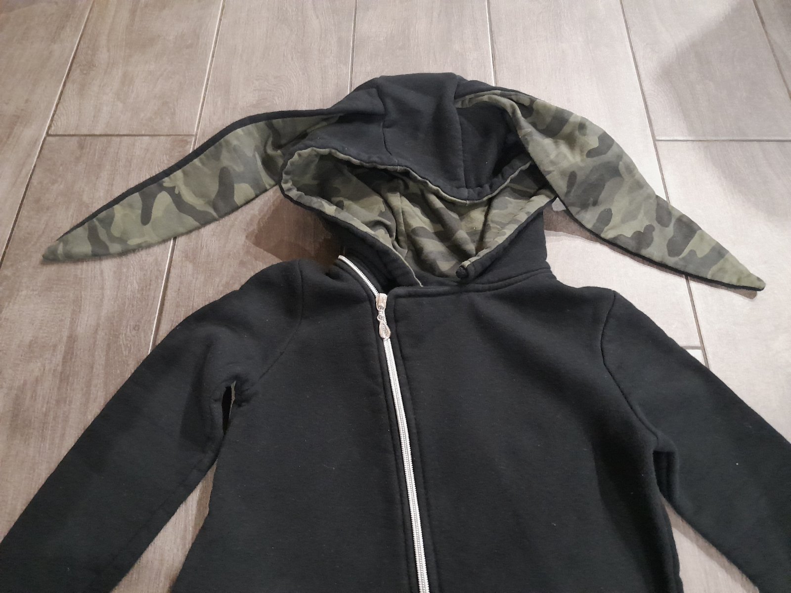 čierna frajerská mikina, so zapínaním nabok, kapuca má uši zelenej maskáčovom prevedení aj aj kapucňa je maskáčová, mikina je nádherná, veľmi dobre vyzerá na dieťati, celková dĺžka: 51 cm, obvod pod pazuchou: 36 cm x2, je mierne elastická a je teplejšia, super stav