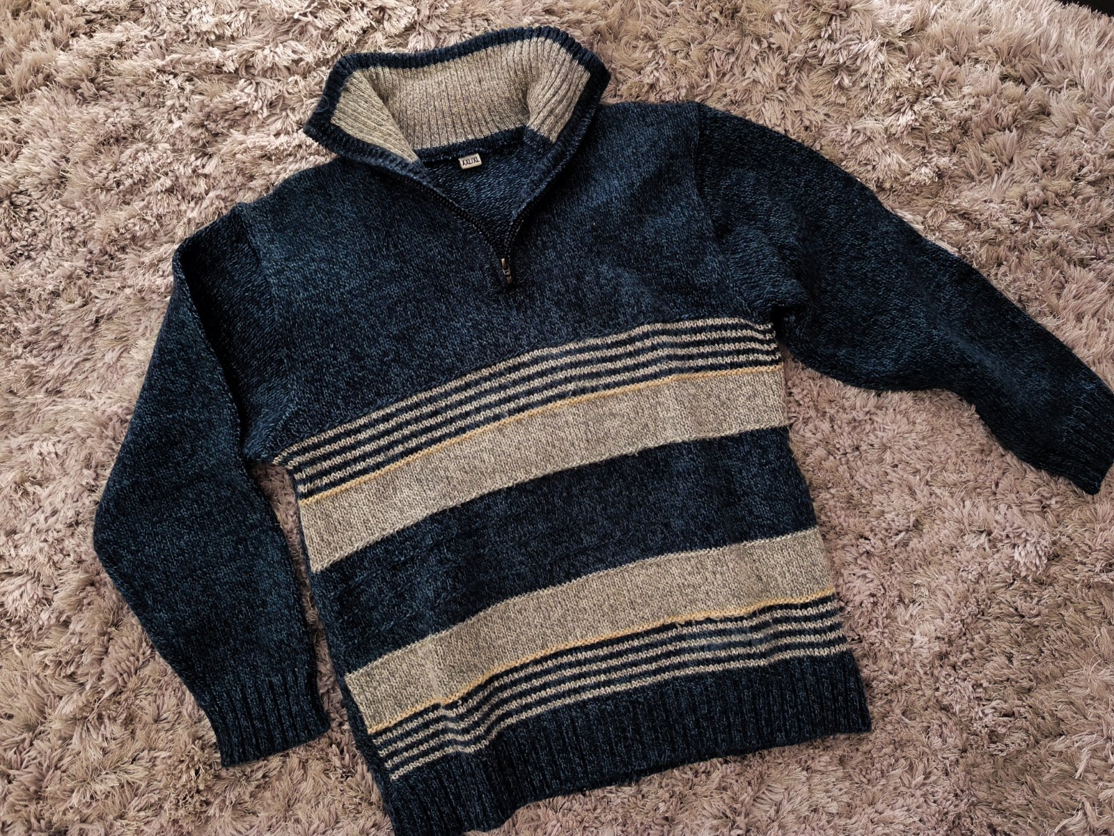 Nosený, stále pekný. Veľmi dobrý stav. Šírka 60 cm, dlžka 72 cm. Farba - tmavomodrá + svetlo sivá.