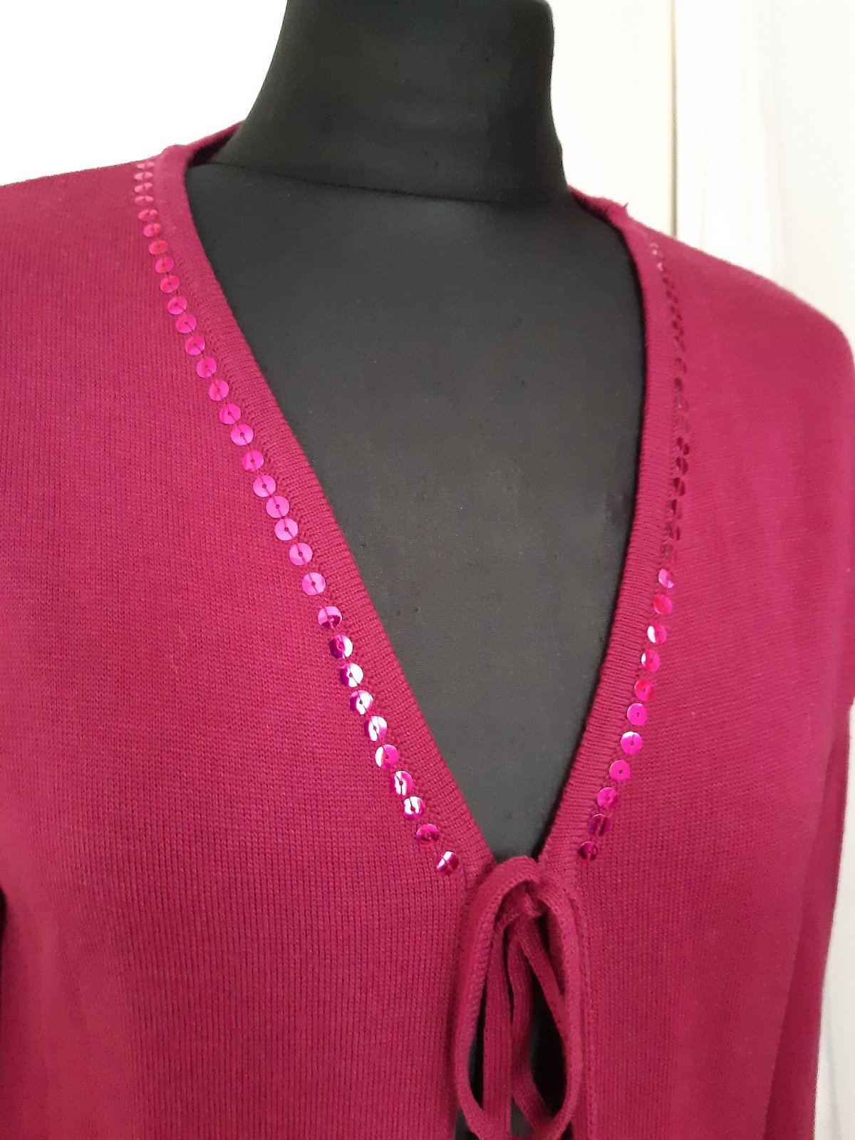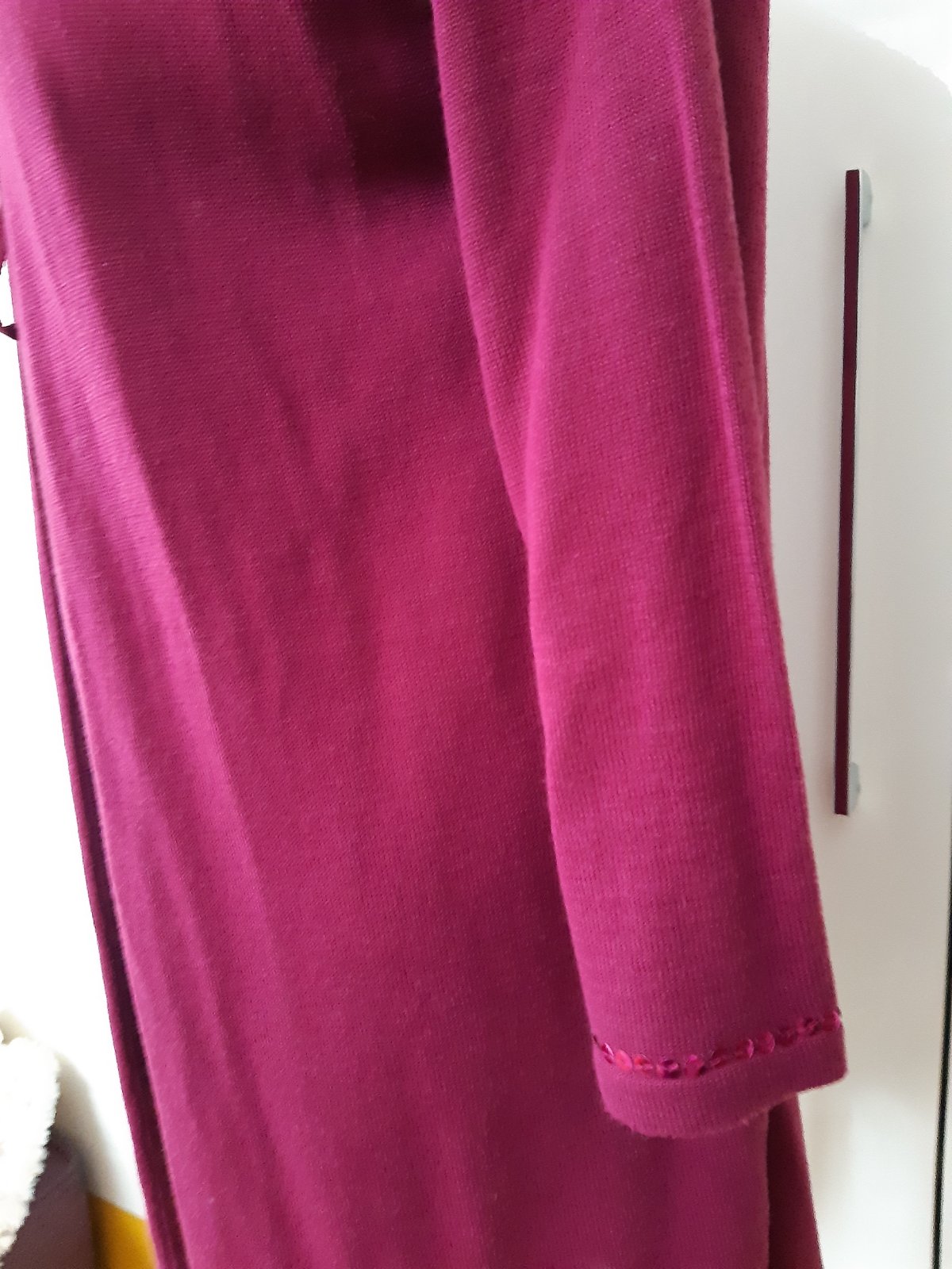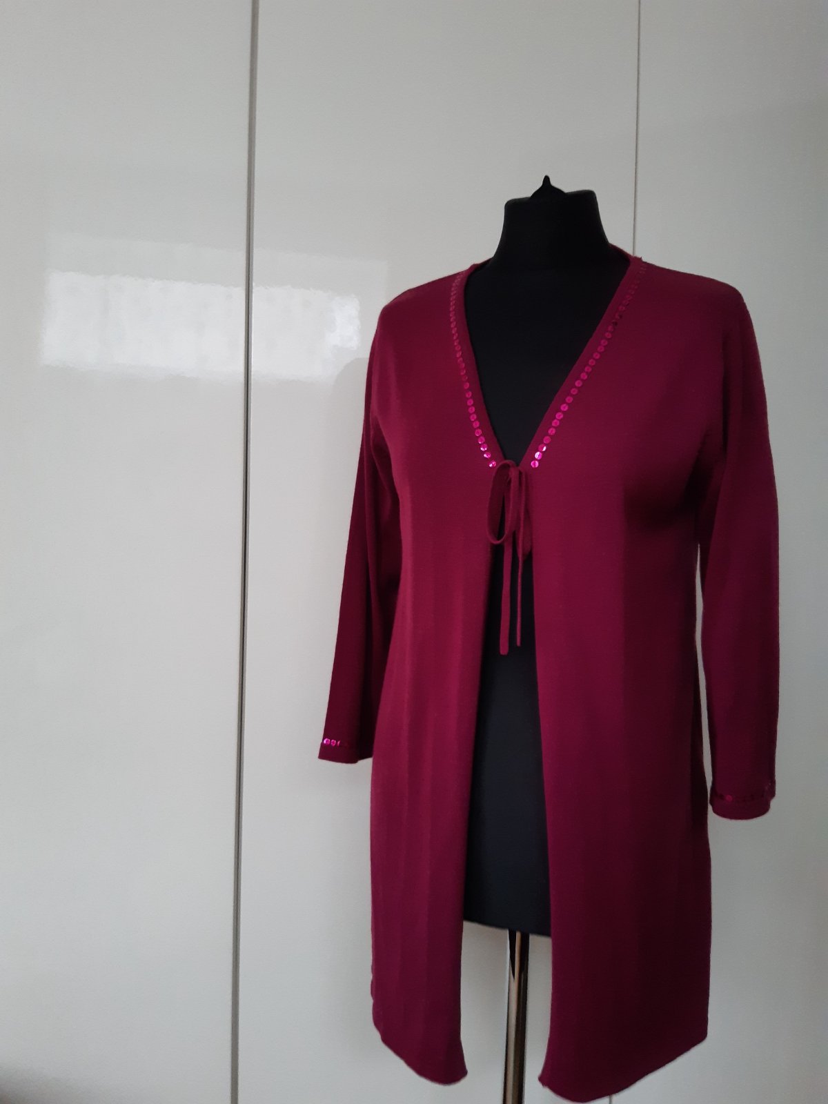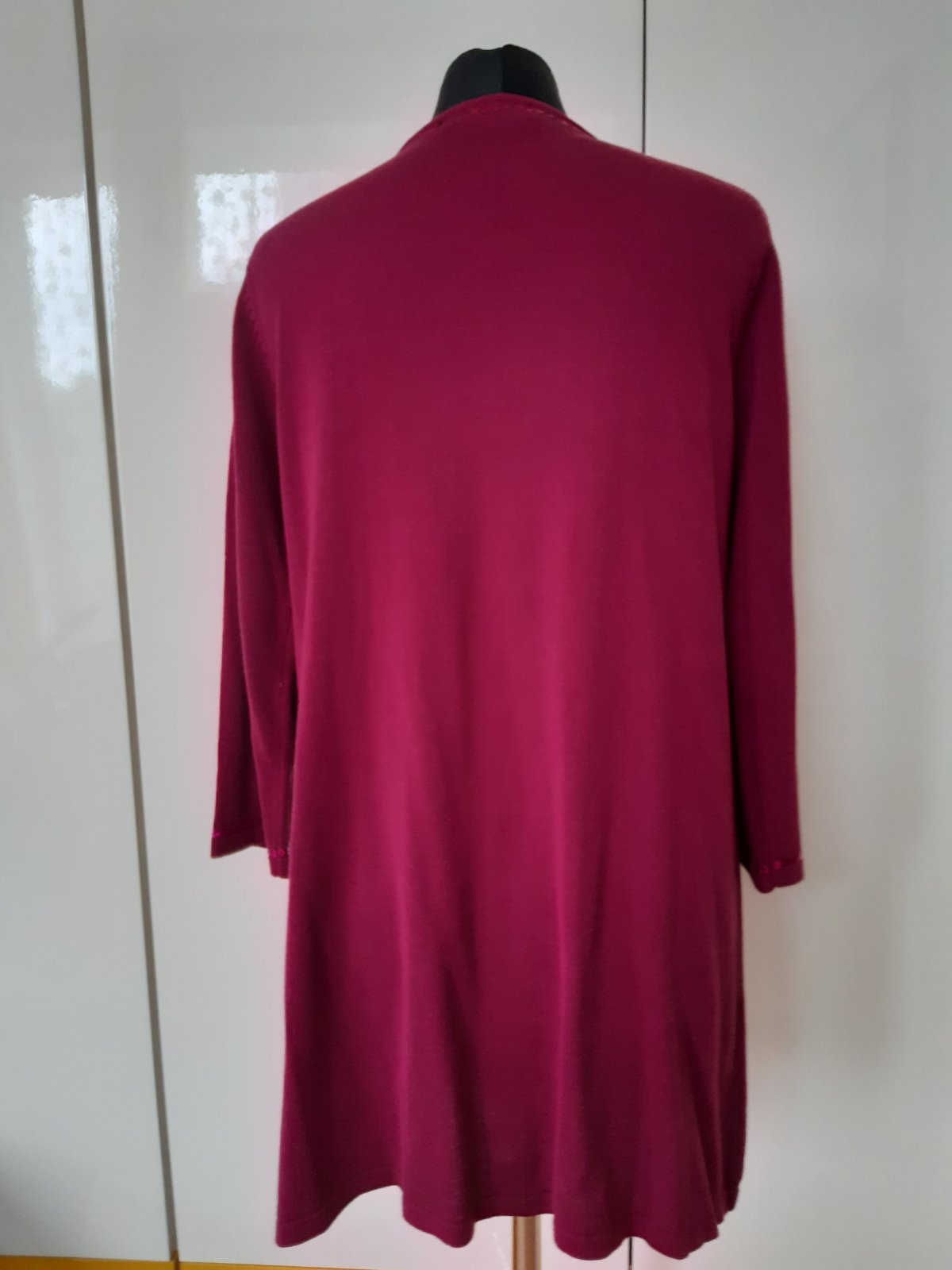 Farba je skôr cyklámenová. Materiál 50% viskóza, 50% , akrylik. Dl. 77 cm, dl. rukáva 49 cm, šírka cez prsia 50x2 cm, zodpovedá veľkosti cca 40/42, značenie je L. Fardigan je v perfektnom stave, bez poškodenia.