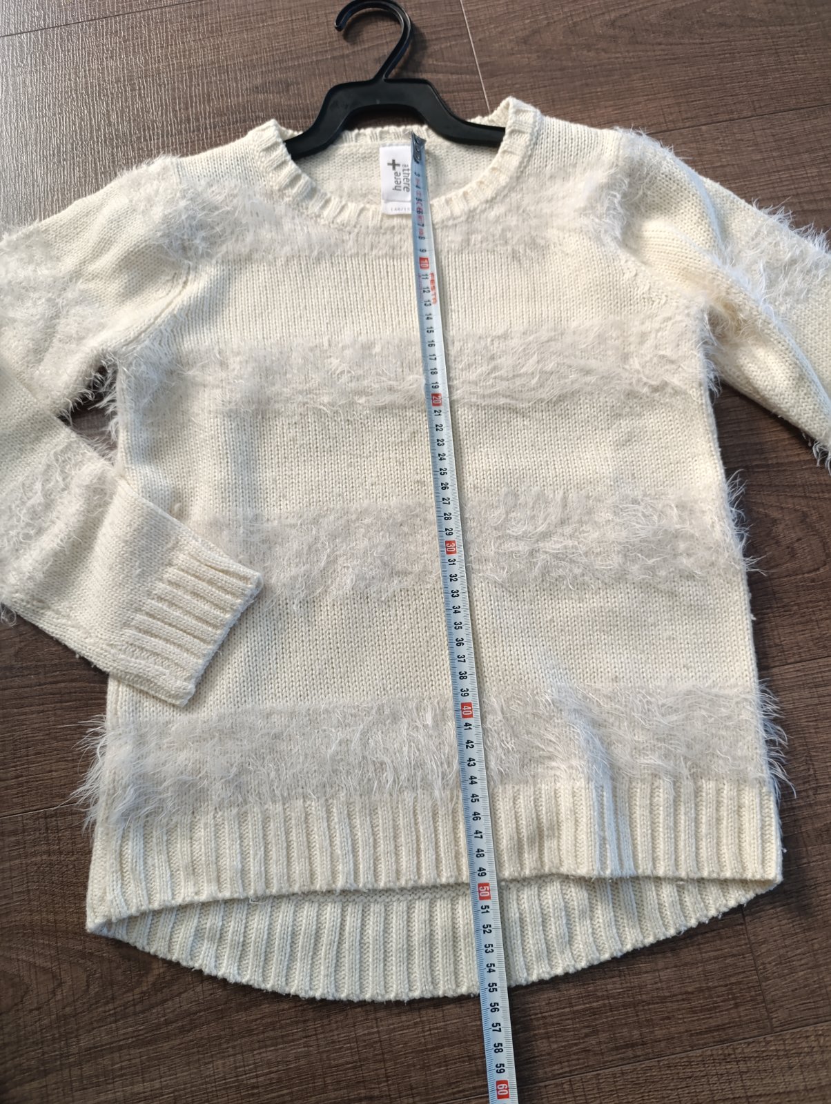 Dievčenský svetrík z príjemného materiálu. Má široký, voľný strih. Udaná veľkosť 143-152. Farba je v skutočnosti krajšia ako na foto. Rozmery š 47cm, dl 49cm, rukáv od krku 68cm.