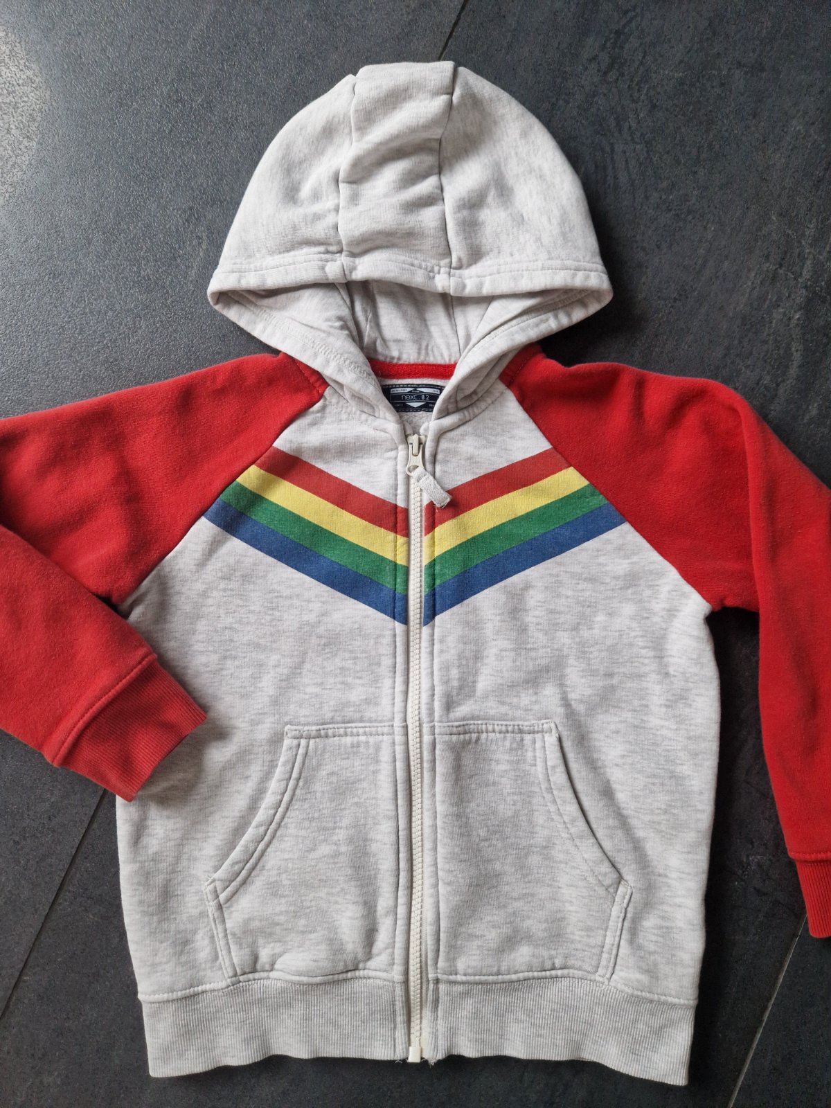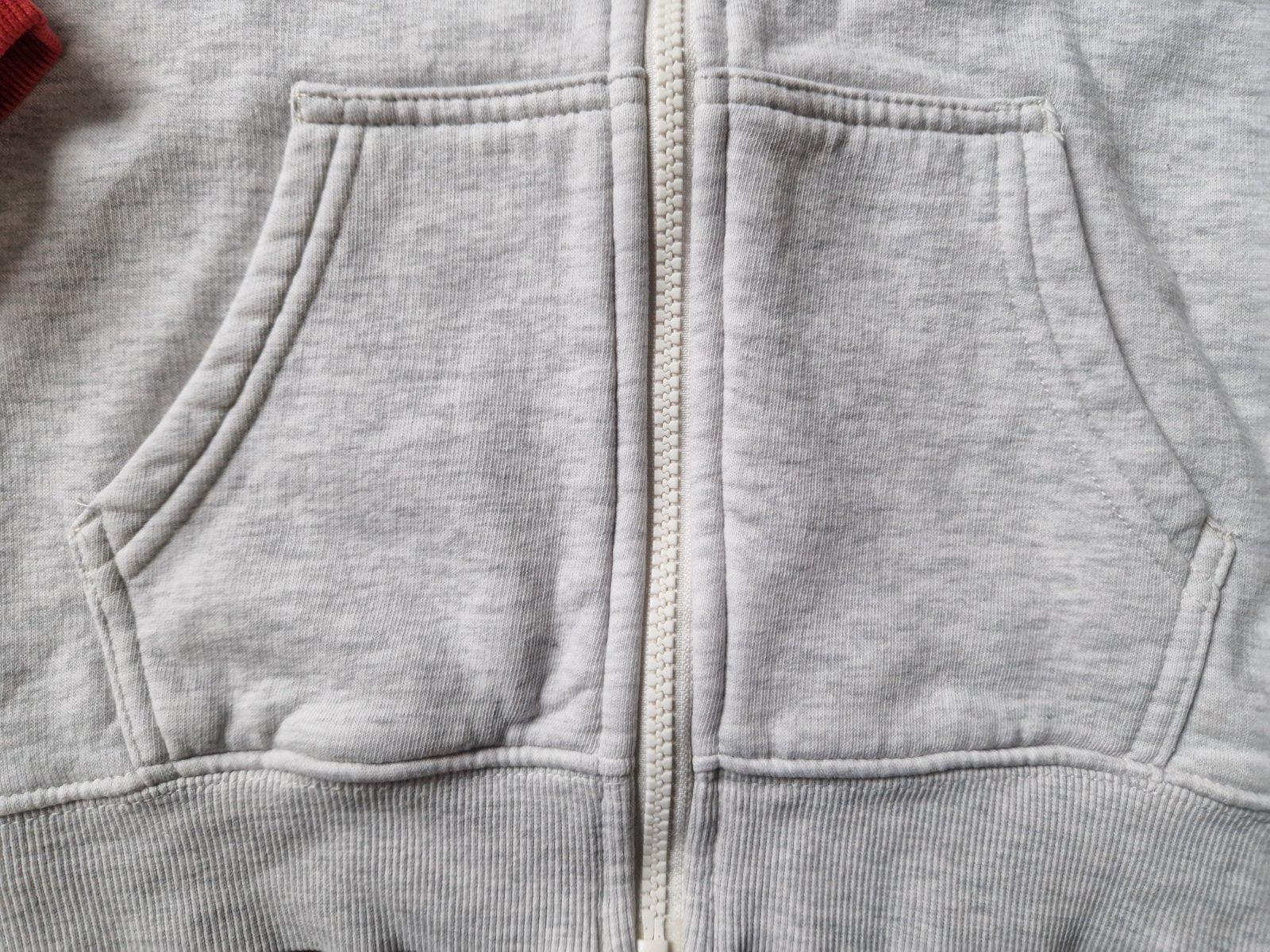 Veľmi dobrý nosený stav. Pásiky vyblednuté, rukávy nie sú také sýto červené ako na foto. Mikina má jemný chĺpok. Šp paz 40, dĺžka 47.