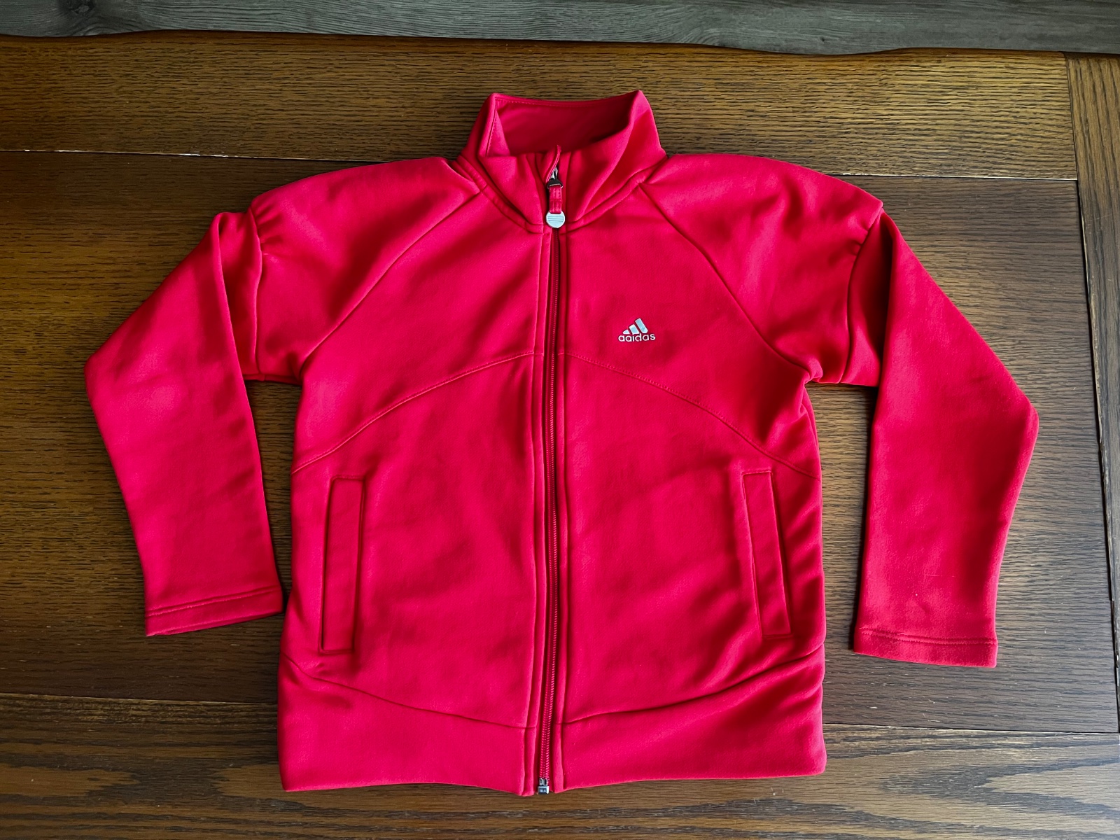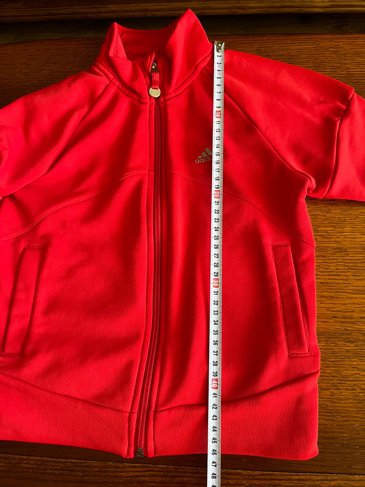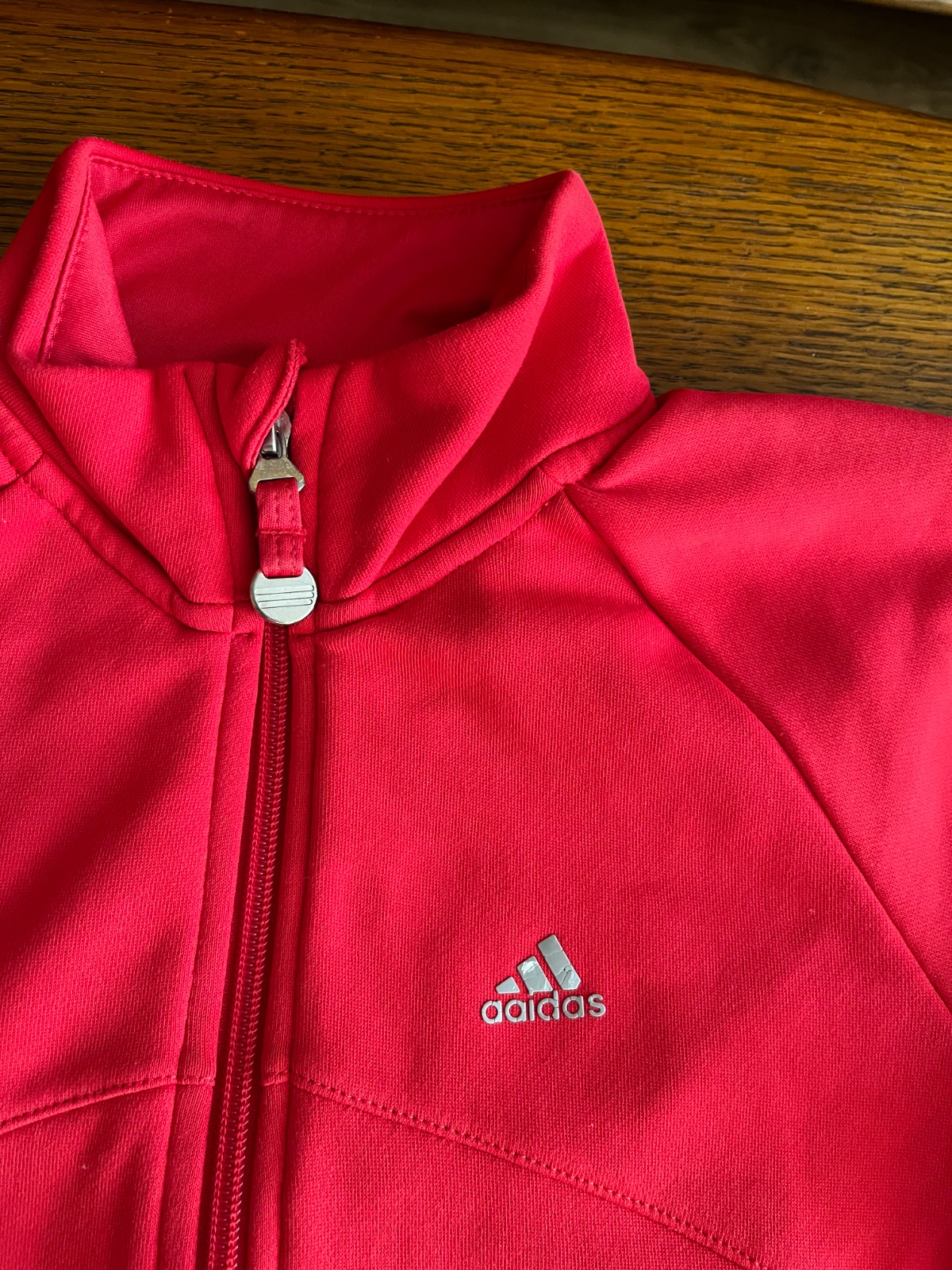 Zaujímavý strih rukávov, na bežci zipsu znak troch pásikov Adidas, po bokoch vrecká.