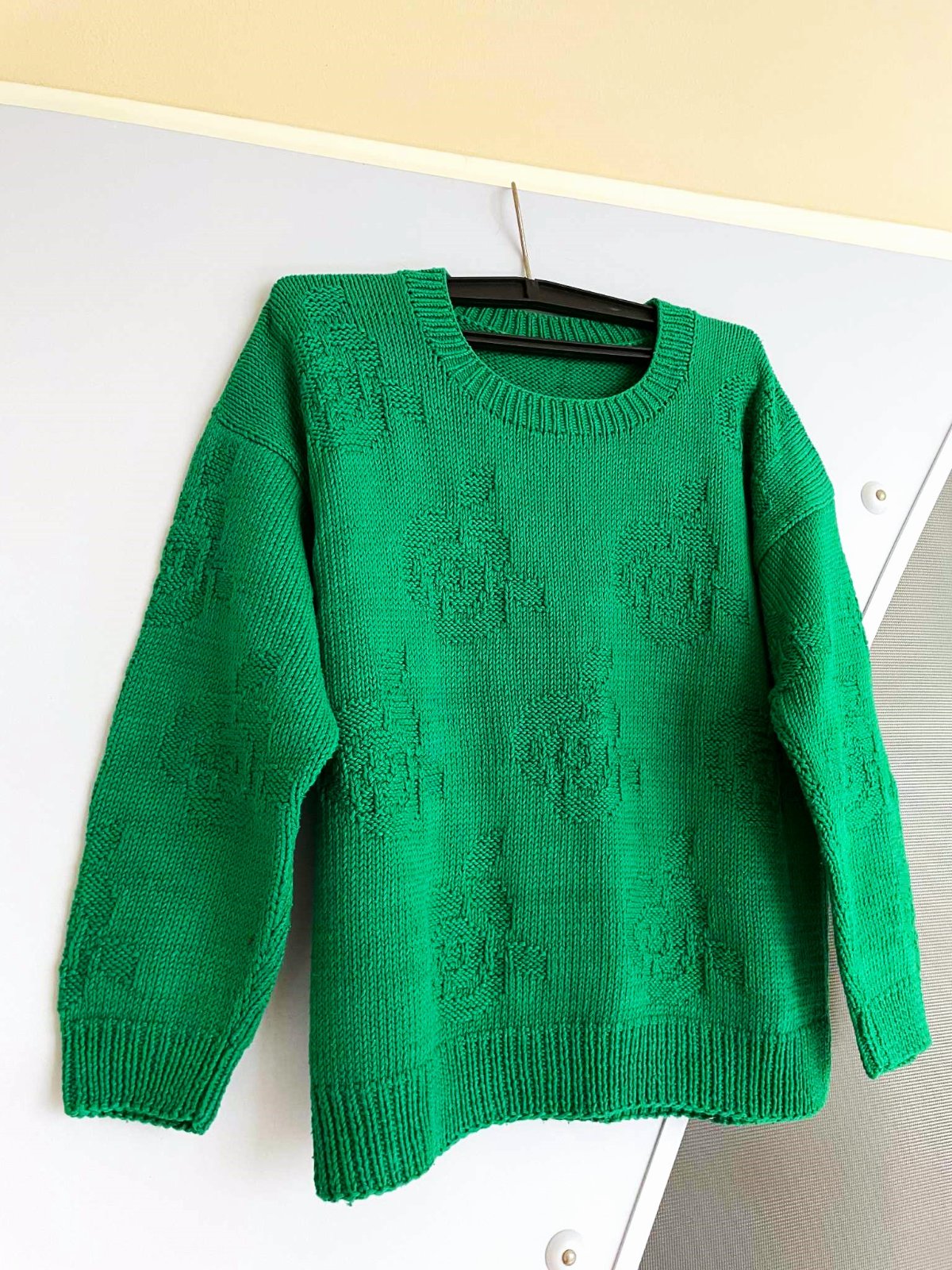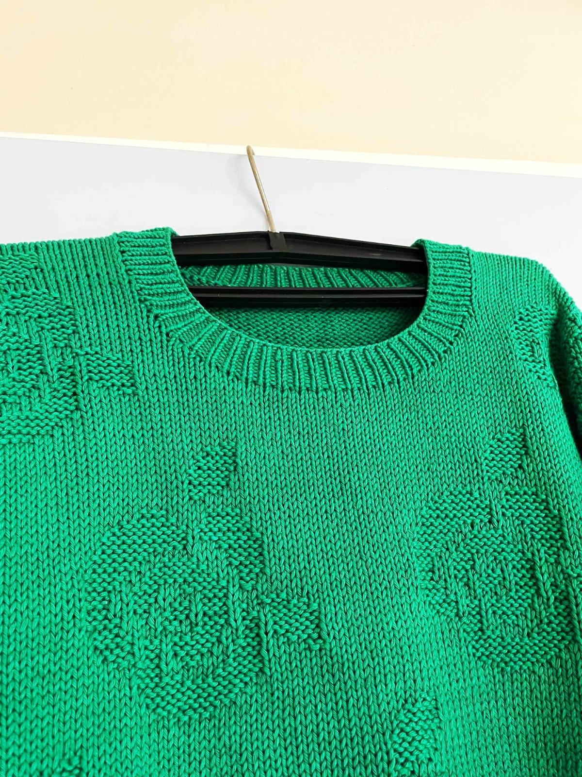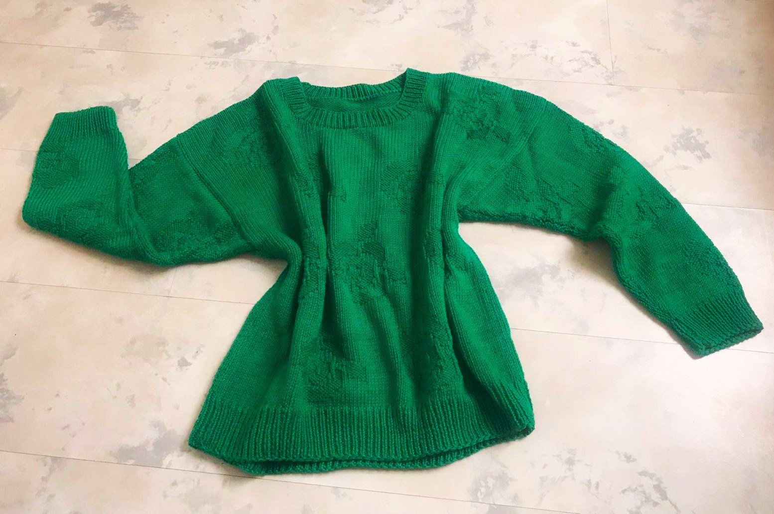 teplý hrubší pulóvrik zo 100% bavlnenej priadze, so spadnutými rukávmi - bez prieramkov, top stav, dlžka celkom = 55 cm, šírka meraná pod pazuchou = 55 x 2 cm, ramená = 18 cm,vonk. dlžka rukáva = 42 cm - rukáv od krku / rumby = 18 + 42 = 60 cm,farba je pestrá sýto stredne zelená