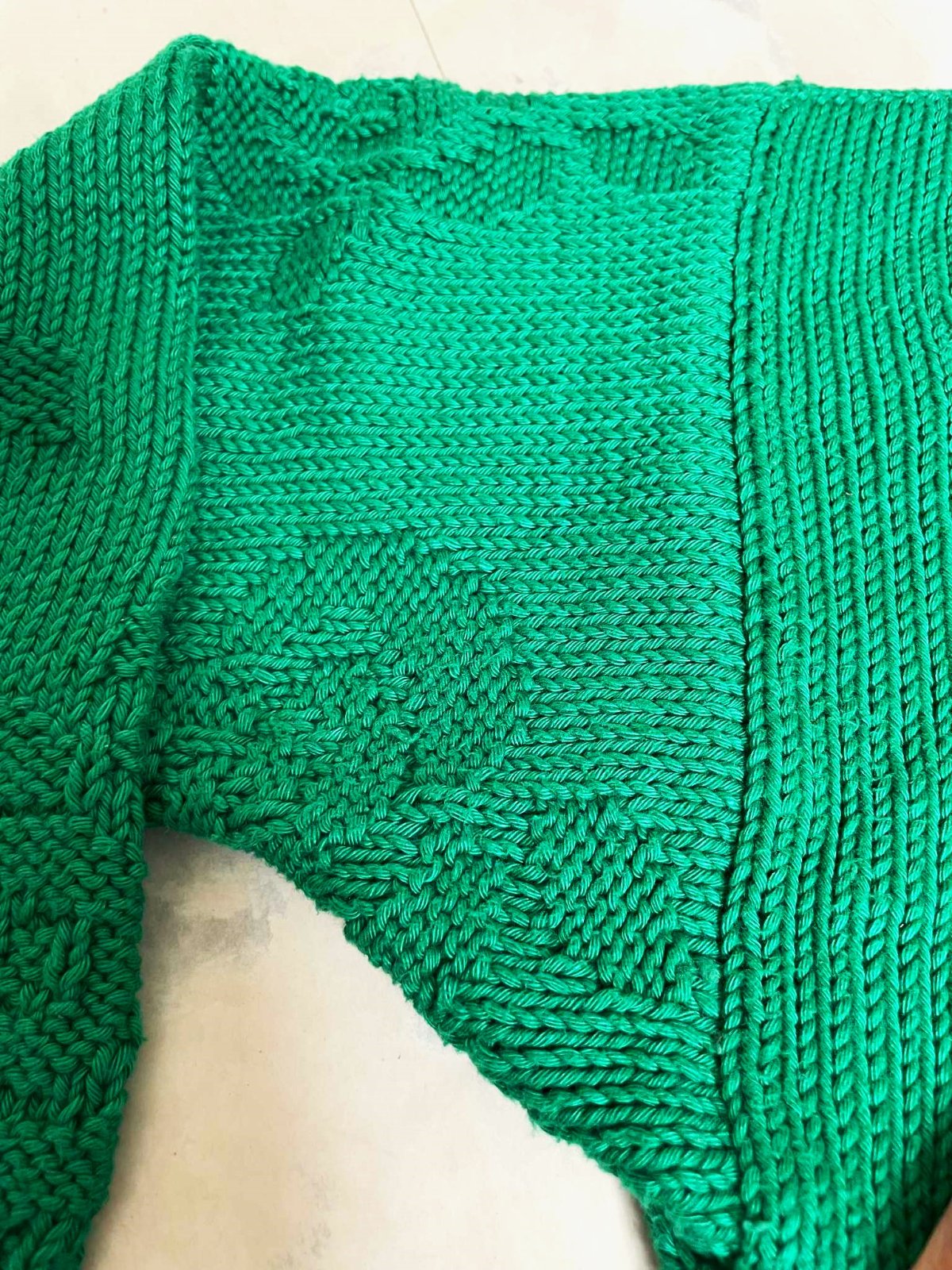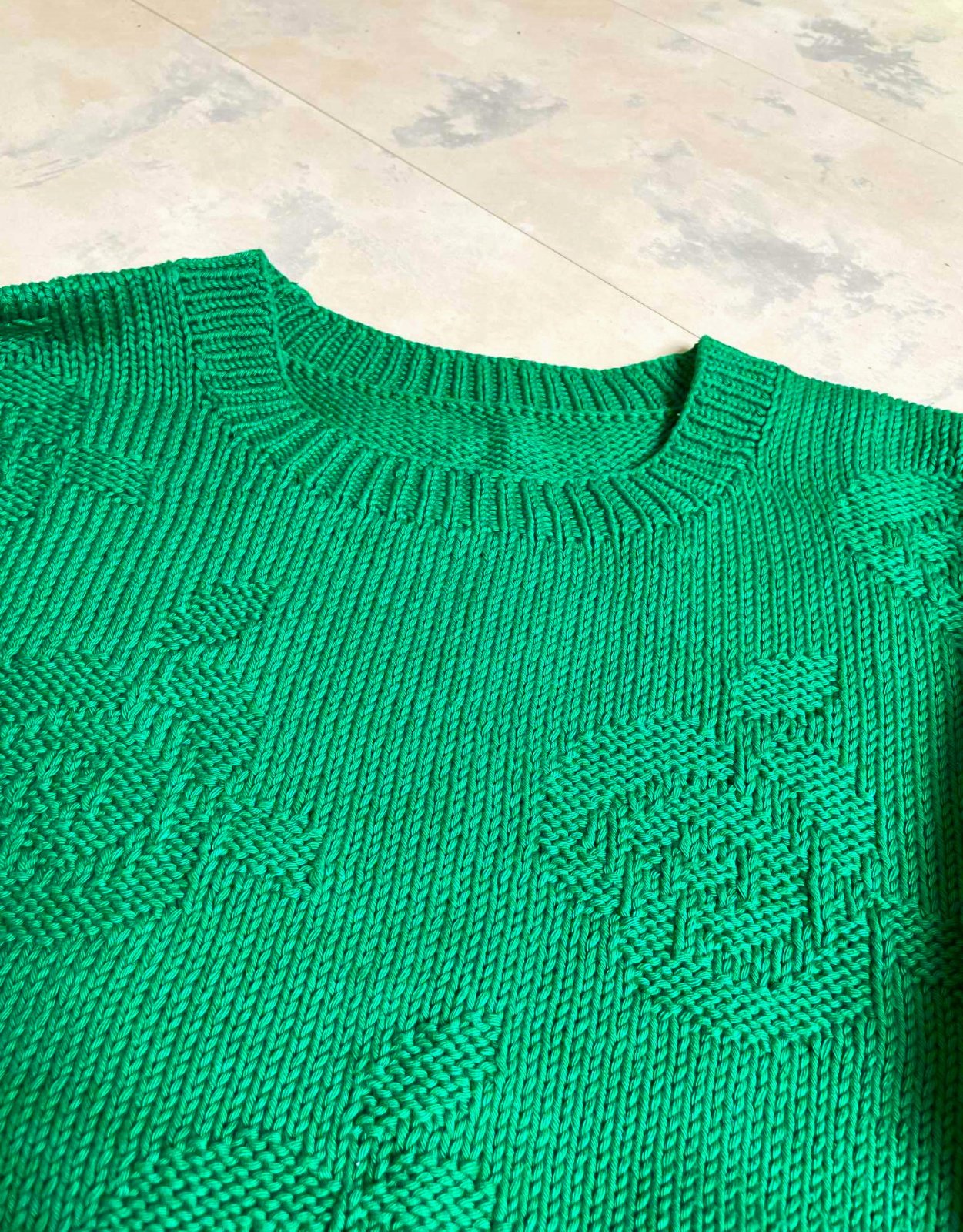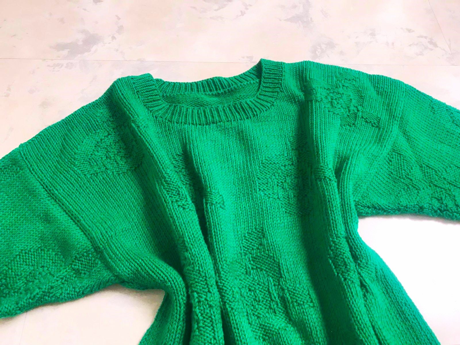 teplý hrubší pulóvrik zo 100% bavlnenej priadze, so spadnutými rukávmi - bez prieramkov, top stav, dlžka celkom = 55 cm, šírka meraná pod pazuchou = 55 x 2 cm, ramená = 18 cm,vonk. dlžka rukáva = 42 cm - rukáv od krku / rumby = 18 + 42 = 60 cm,farba je pestrá sýto stredne zelená