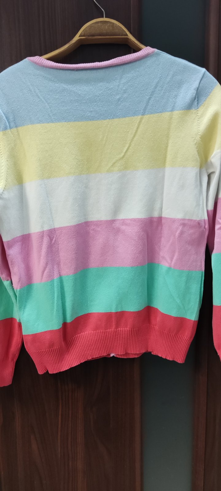 Tenší bavlnený svetrík, pásikavé pastelové farby, výborný stav, bez známok používania.