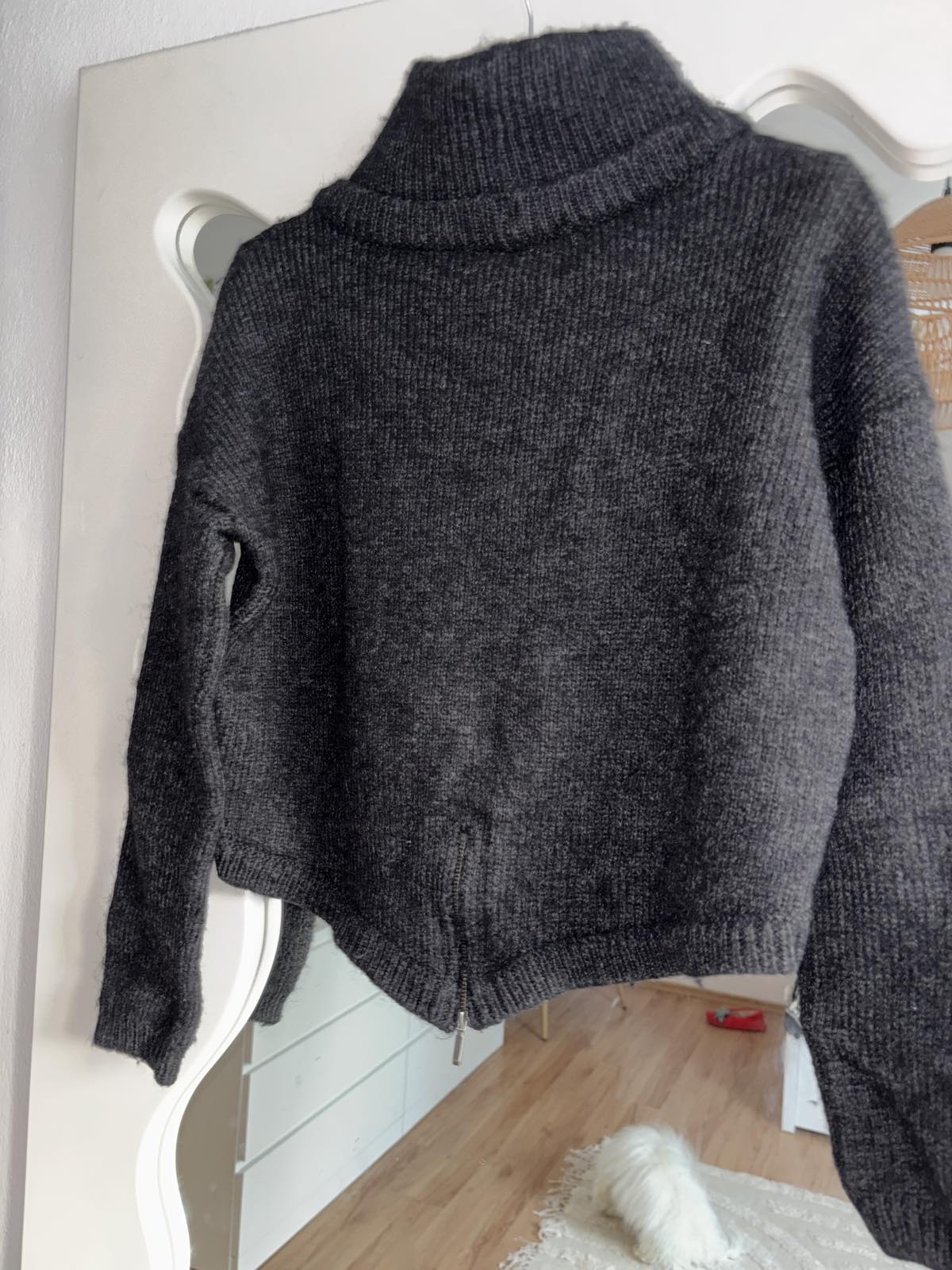 Výborný stav, antracitova šedá, cropp dĺžka, vzadu zips, veľkosť 36,s.pod pazuchami 52 cm, d. 38-50 cm, vzadu je dlhší