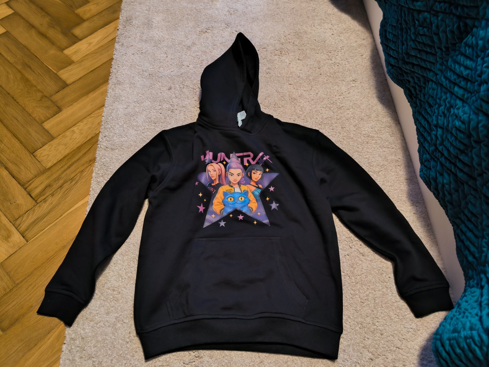 Predám mikinu Huntrix. Dcéra ju odmieta nosiť - ako nová. Veľkosť píšu pre 12-14 ročné dievčatá.