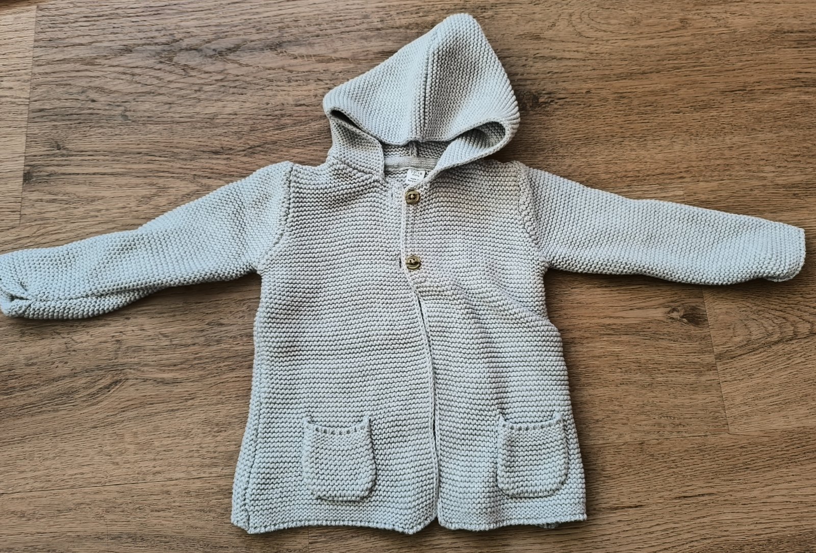 Pletený sveter na veľkosť 12-18 mesiacov, s kapucňou, bez poškodení.