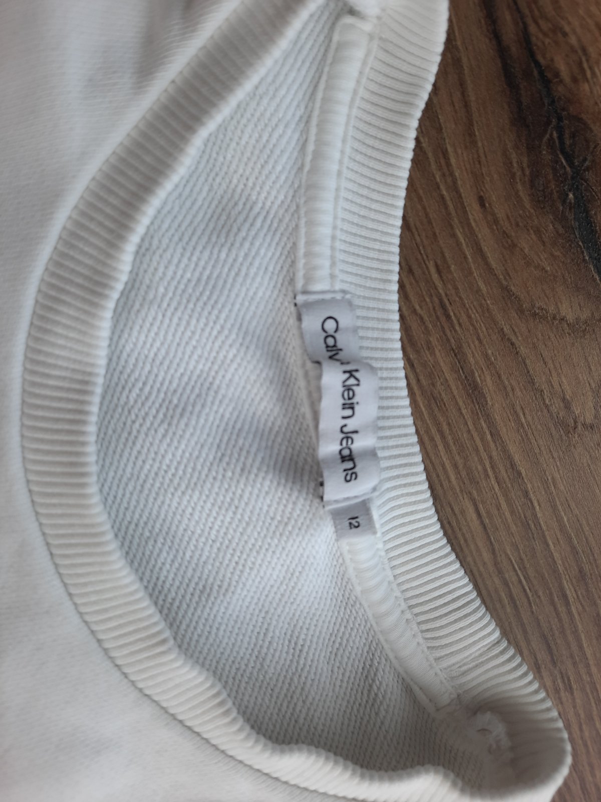 Nosená biela mikina s kapucnou značky Calvin Klein veľkosti XS, na jednom rukáve je červená bodka inak bez poškodenia