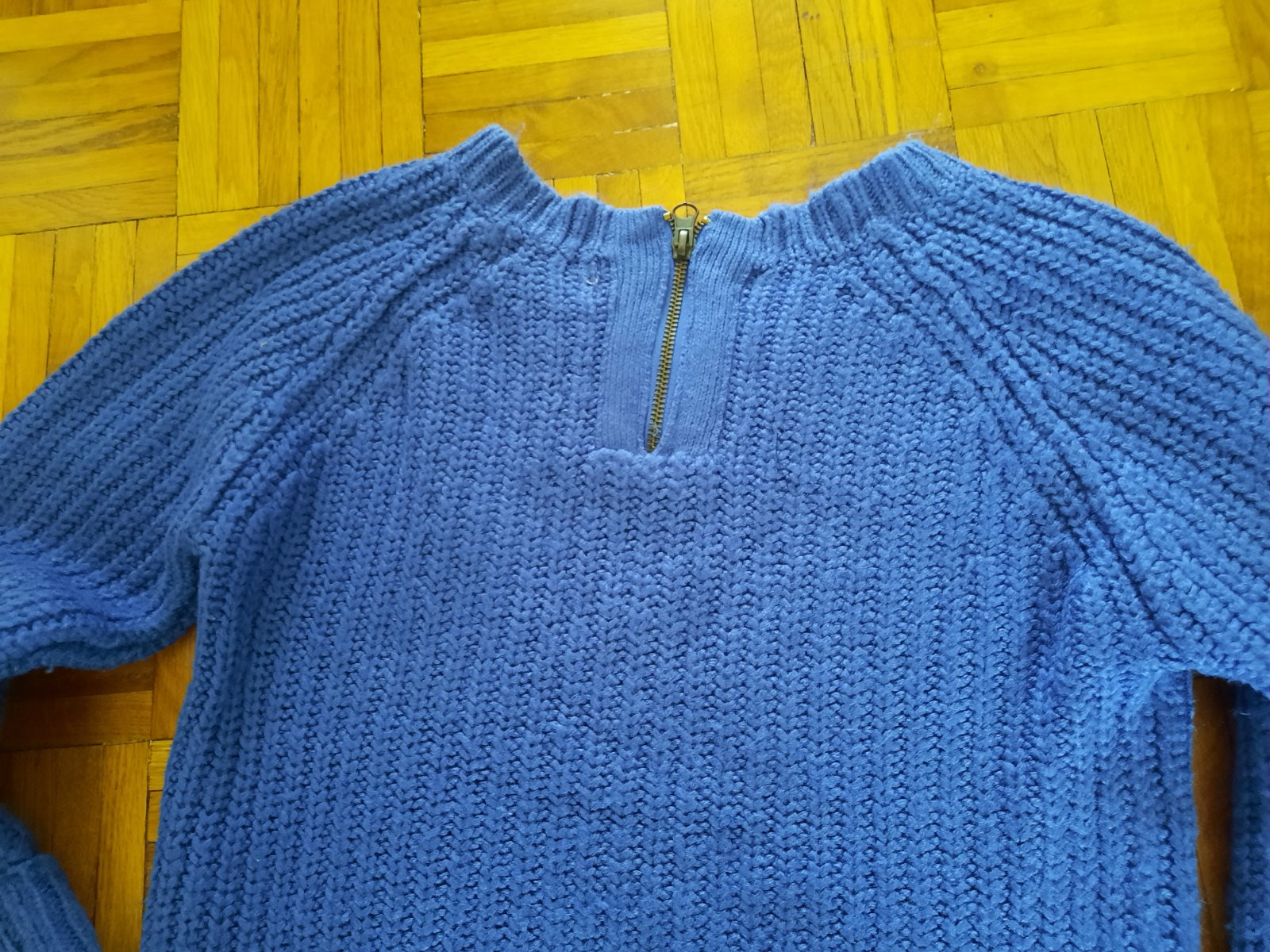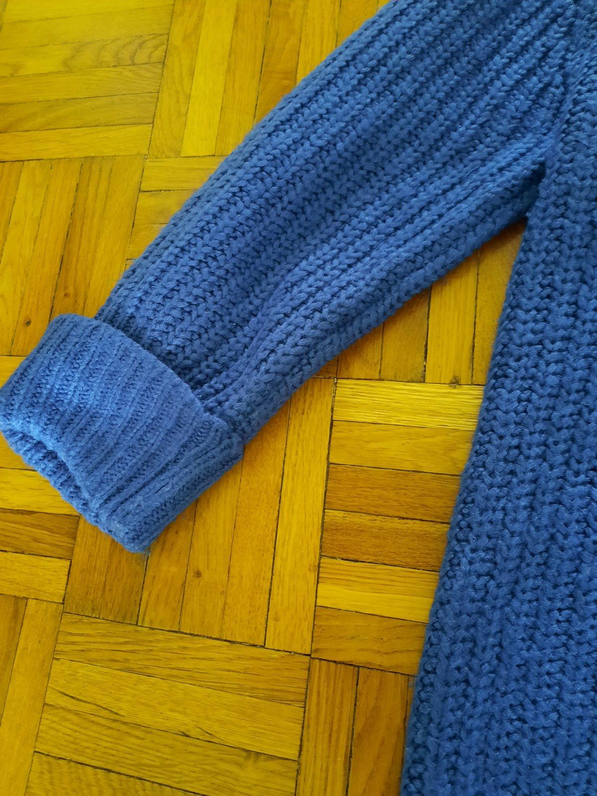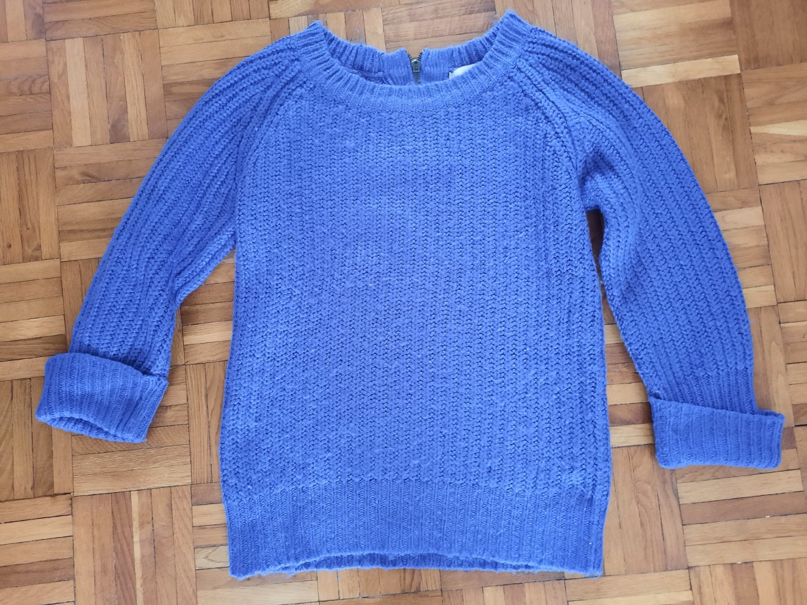 Pekný pletený pulóver, vzadu krátky zips pri krku. Na rukávoch manžety vyhrnuté. Veľmi pekný stav. Vhodný aj pre staršie dievčatá.
