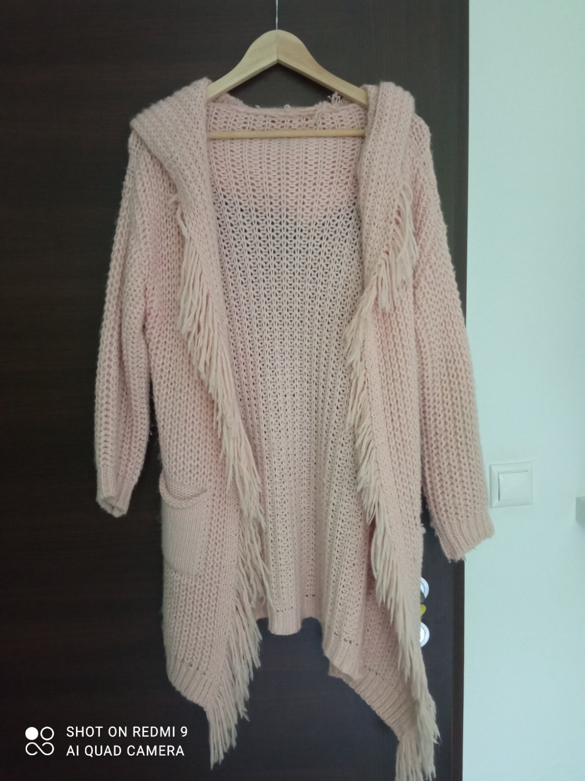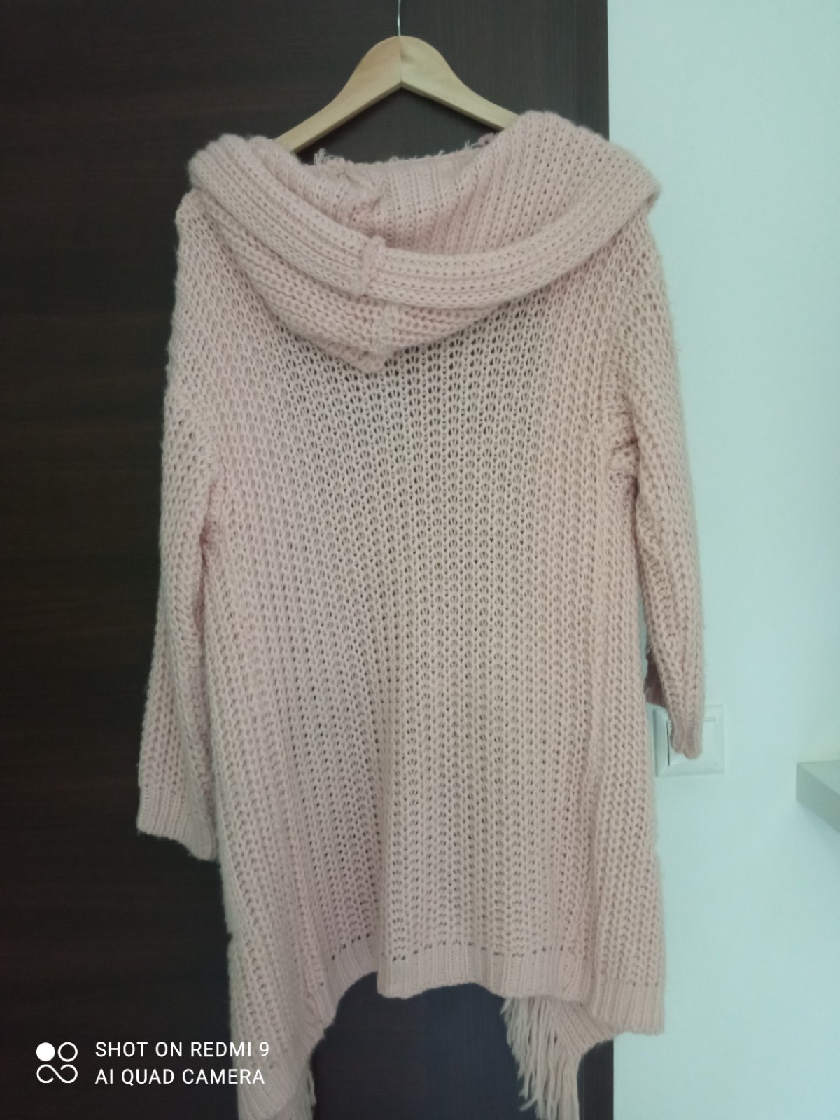 Krásny sveter ružovej farby s kapucňou. Vpredu dve vrecká. V dobrom nosenom stave. Bez zapínania