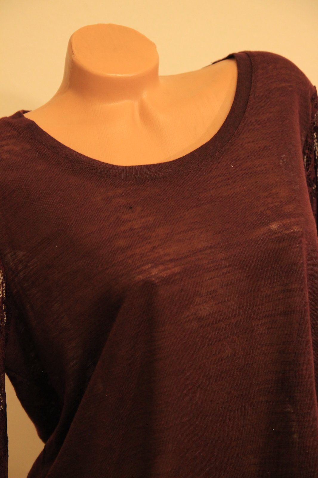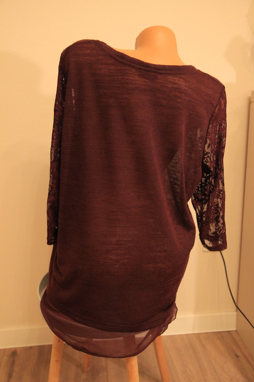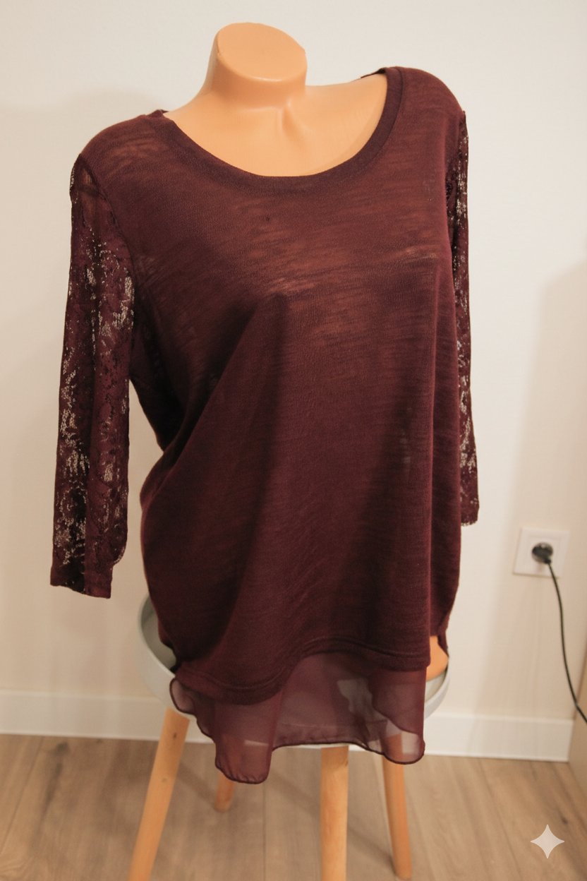 Bordový tenší sveter, s čipkovanými rukávmi. Na spodku je všitá látka, veľkosť XXL.