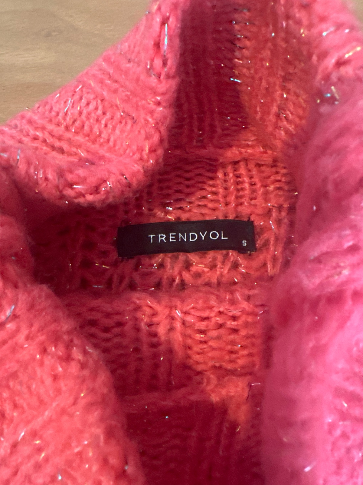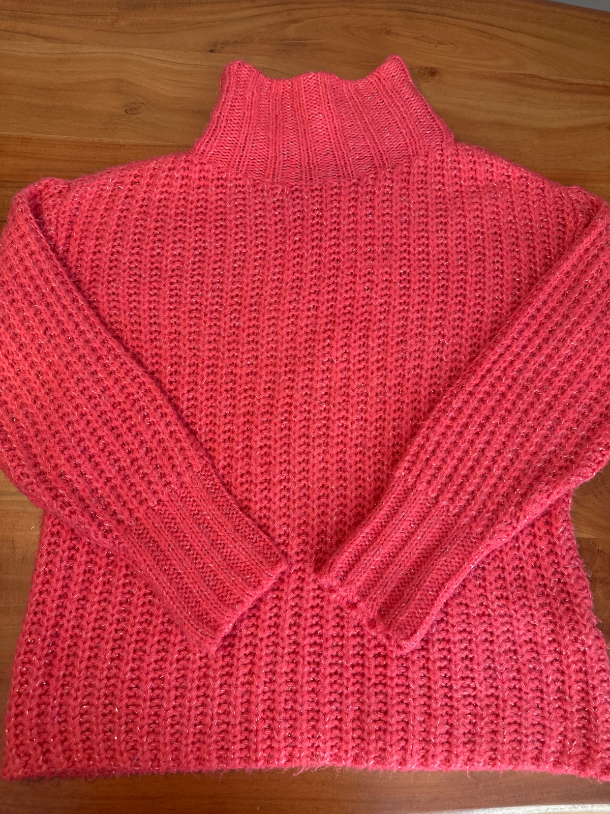 Zimný pletený pulover, farba tmavo lososová. Vyvýšený rolák. Rukávy ukončené do patentov. Vpletená metalická niť. Ľahký, mäkký, hrejivý. Voľnejší strih. Dĺžka 60 cm, šírka hrudník 2 x 55 cm, rukáv od krku 70 cm. Bez poškodení.