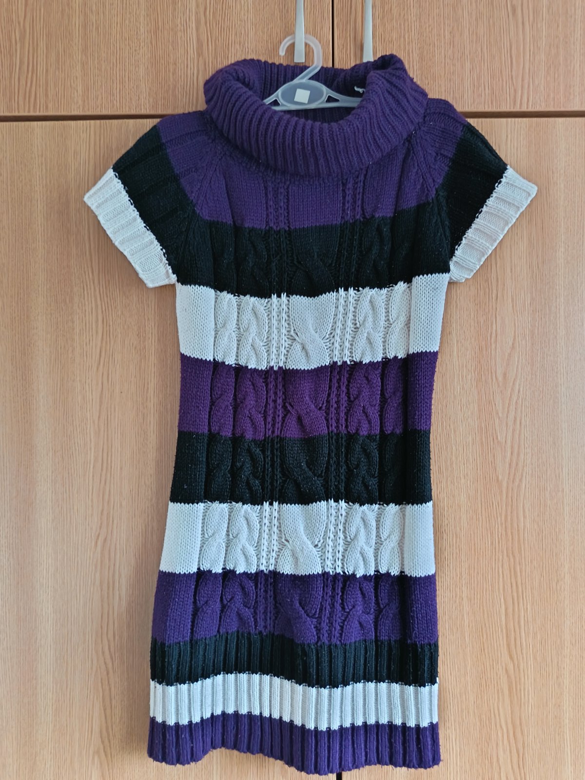 Fialový pletený rolák, vpredu má malú asi 4mm dierku. Veľkosť L, materiál je elastický. Rukávy sú cca polovičné. Miery hrudník: 2x51-60cm dĺžka: 58cm